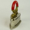 [0L745/X005] Öntöttvasból készült, szép állapotú, fényesített felületű, kisméretű szenes vasaló, piros színű hajlított fa markolattal. Belső betétje, rácsa is megvan. Magasság: 15 cm Szélesség: 6.7 cm Hosszúság: 12.3 cm Súly: 1 kg