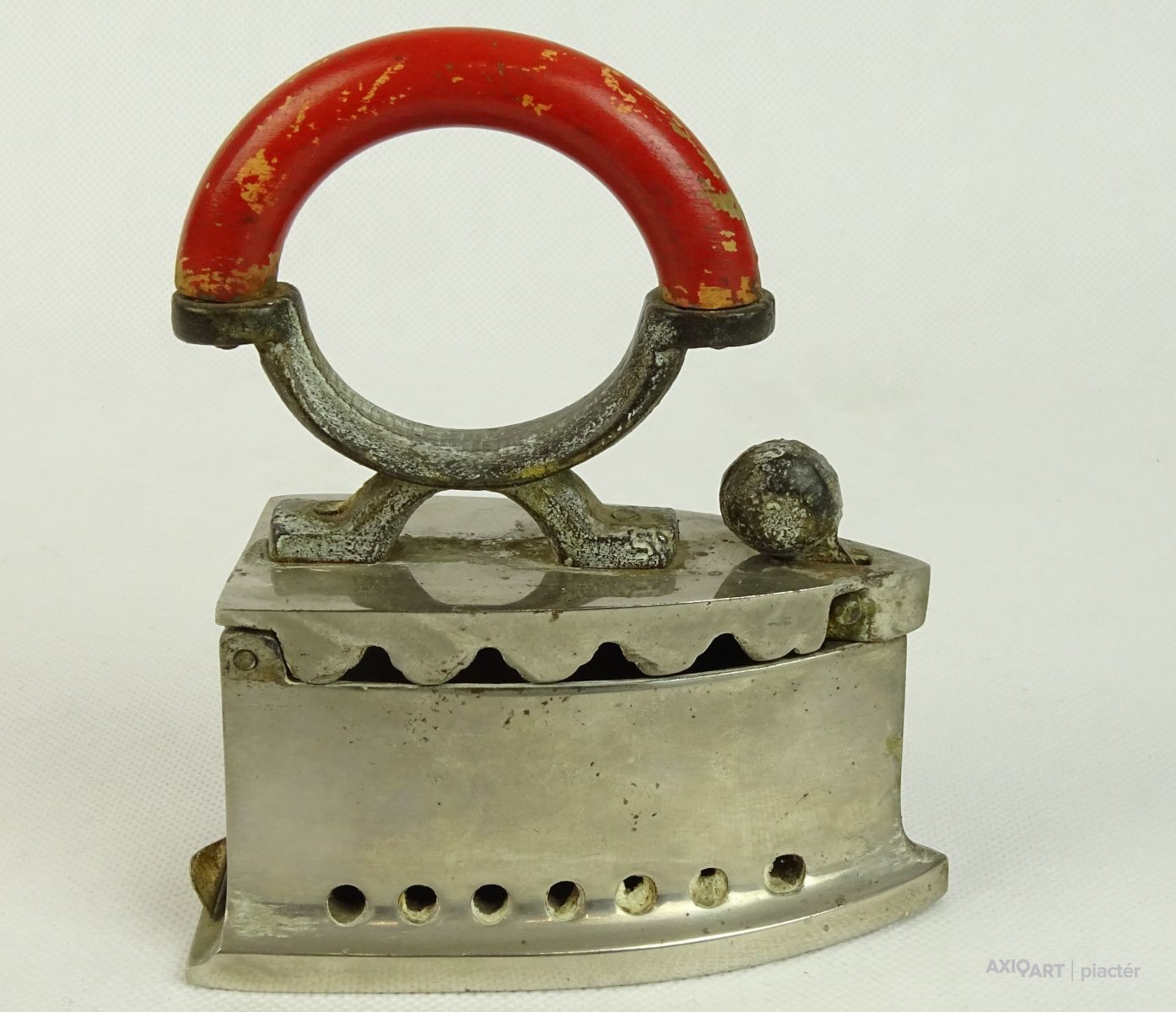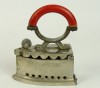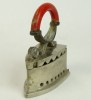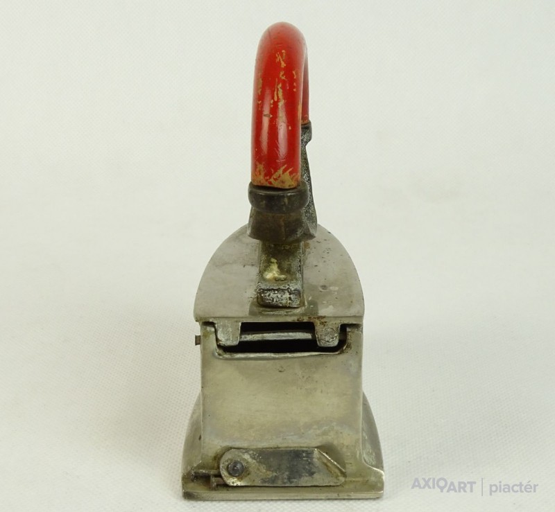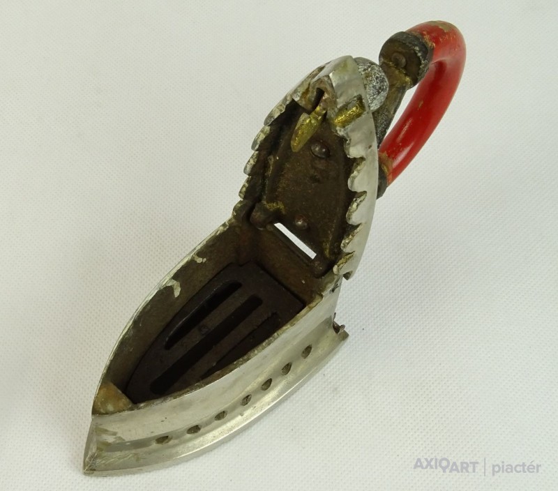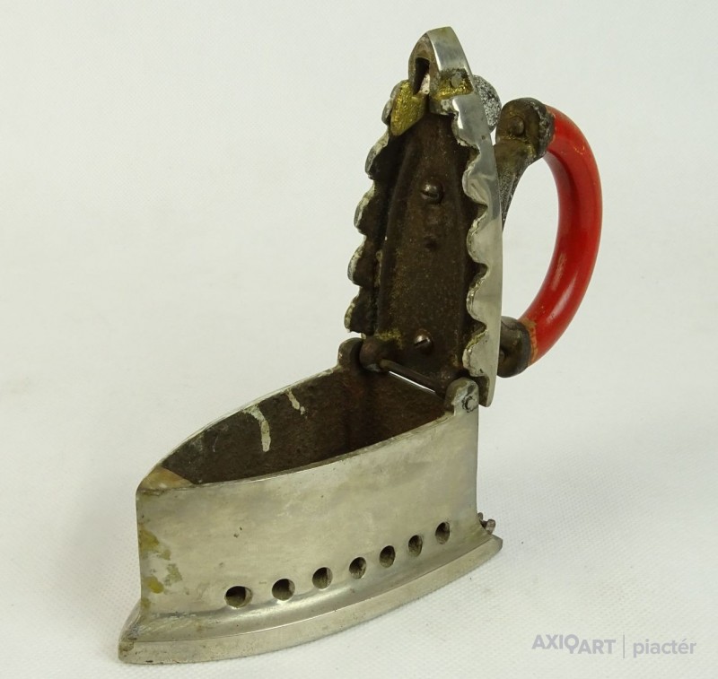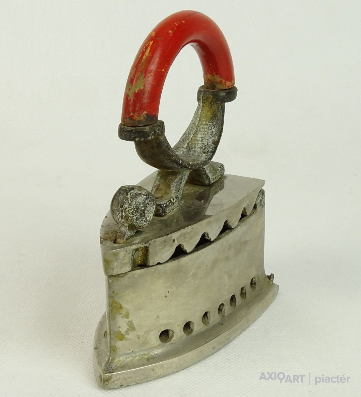 [0L744/X005] Öntöttvasból készült, szép állapotú, fényesített felületű, kisméretű szenes vasaló, piros színű hajlított fa markolattal. Belső betétje, rácsa is megvan. Magasság: 14.7 cm Szélesség: 6.7 cm Hosszúság: 12.3 cm Súly: 1.08 kg