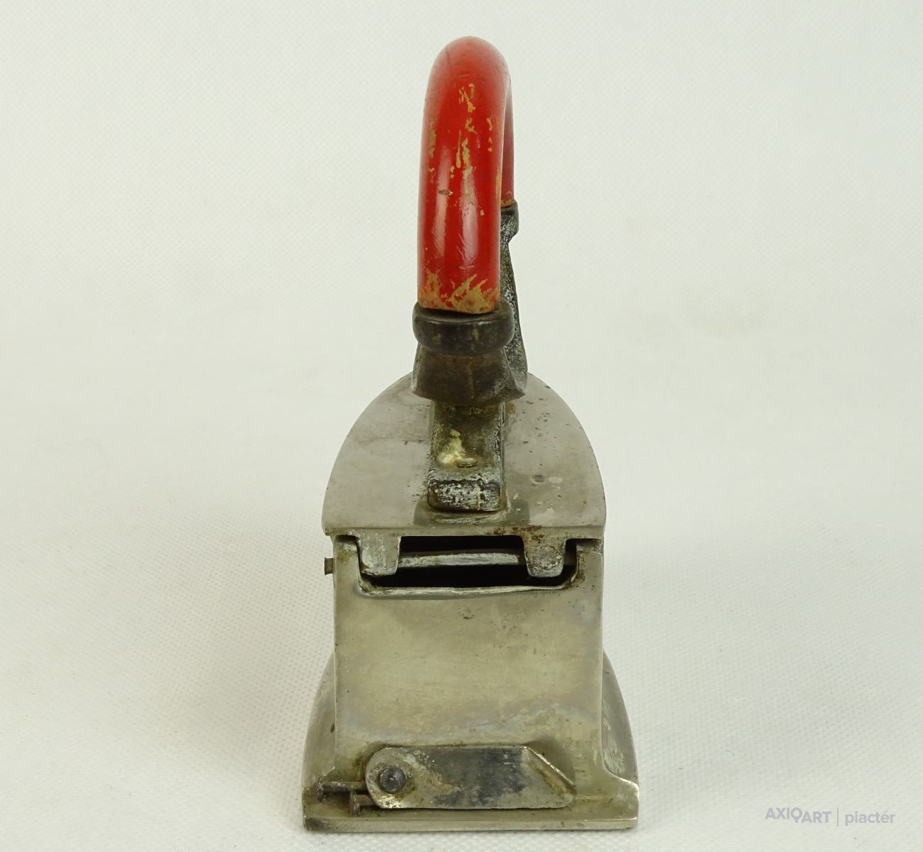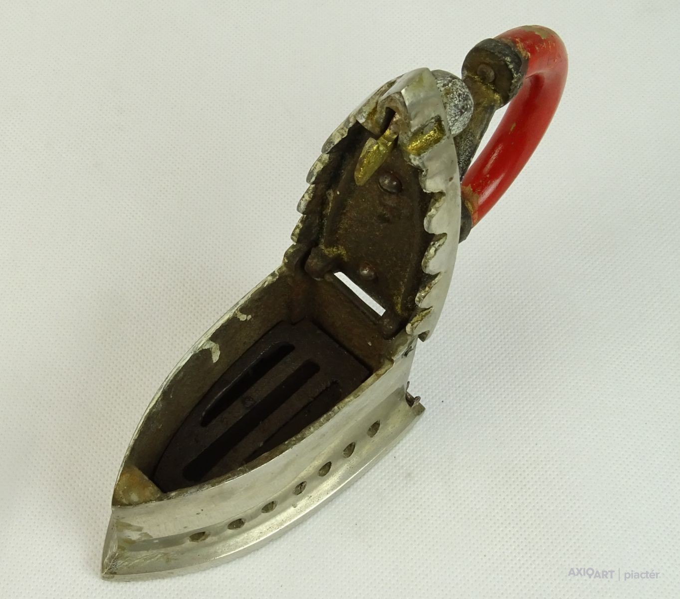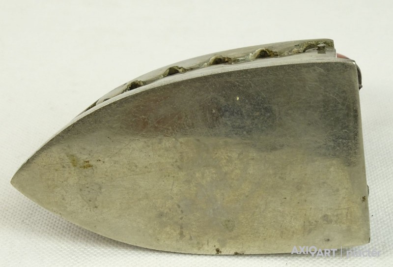 [0L744/X005] Öntöttvasból készült, szép állapotú, fényesített felületű, kisméretű szenes vasaló, piros színű hajlított fa markolattal. Belső betétje, rácsa is megvan. Magasság: 14.7 cm Szélesség: 6.7 cm Hosszúság: 12.3 cm Súly: 1.08 kg