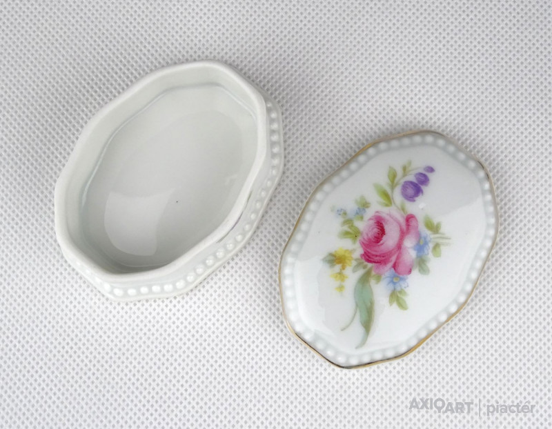Virágmotívummal dísztett szögletes alakú, kisméretű porcelán ékszertartó, gyűrűtartó bonbonier.