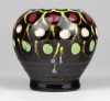 Régi, szép állapotú, kézzel festett, mázas kis méretű kerámia váza, ibolyaváza. Oldalán három sorban írókázott pettyezéses trikoloros díszítés.