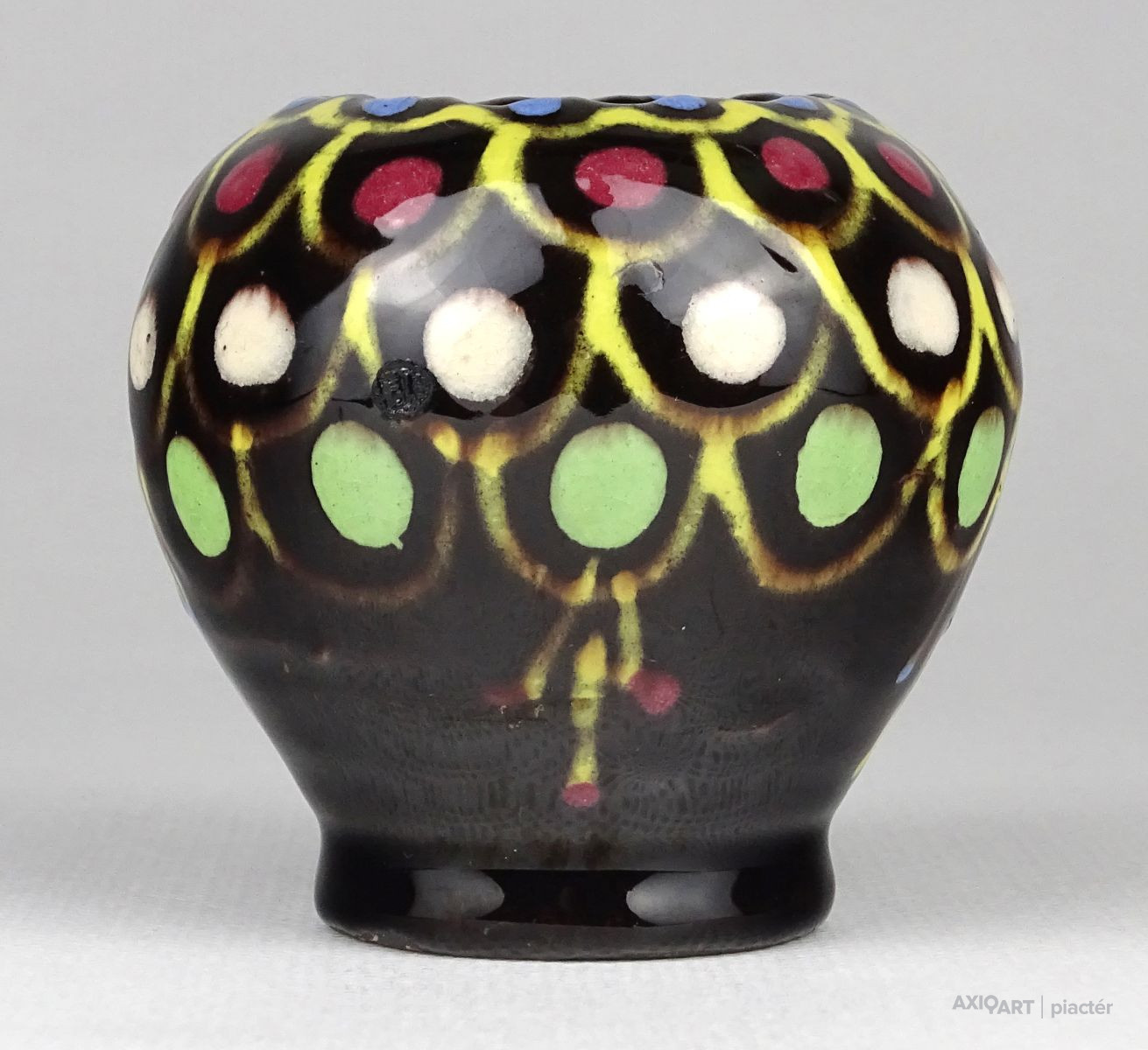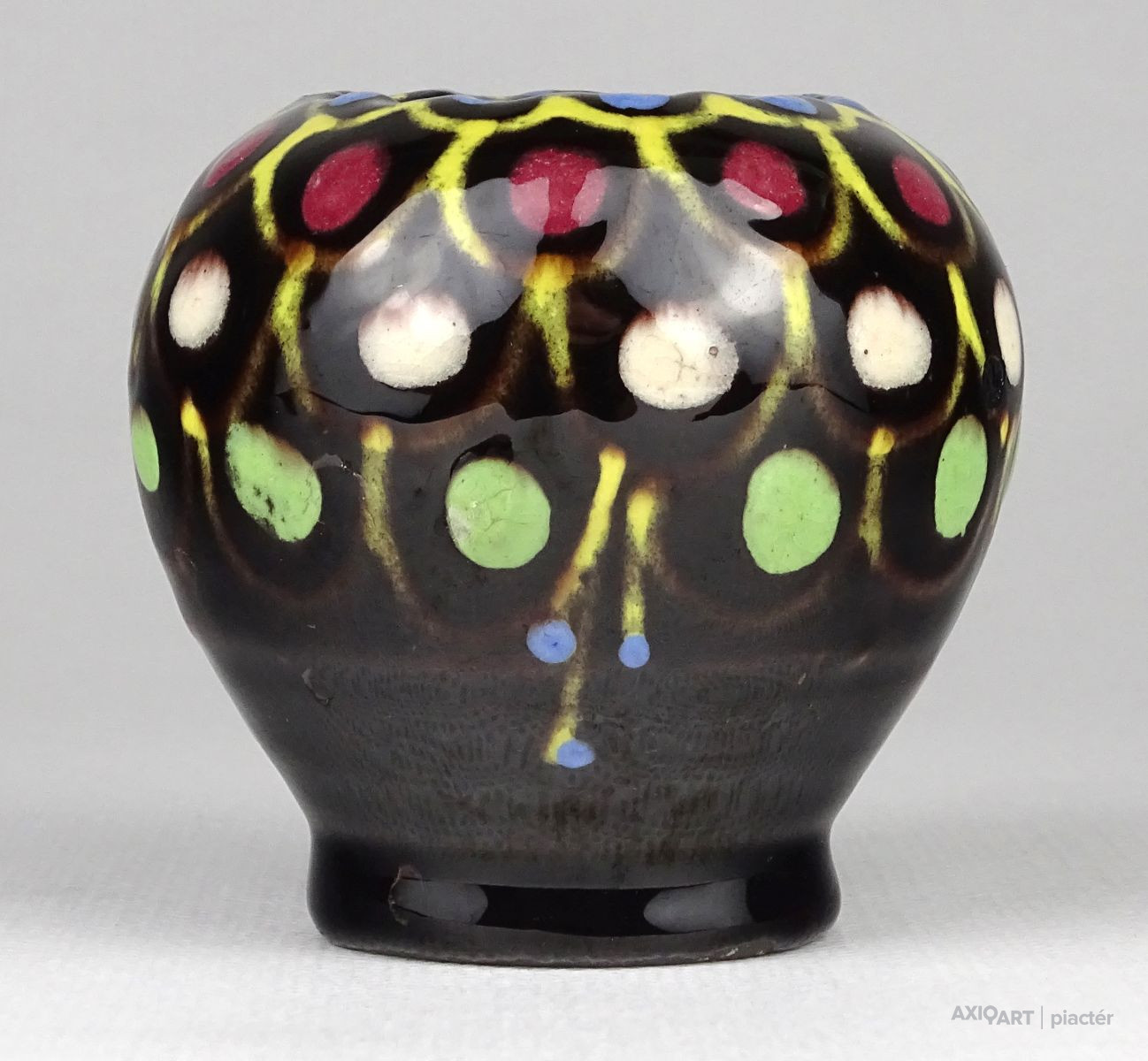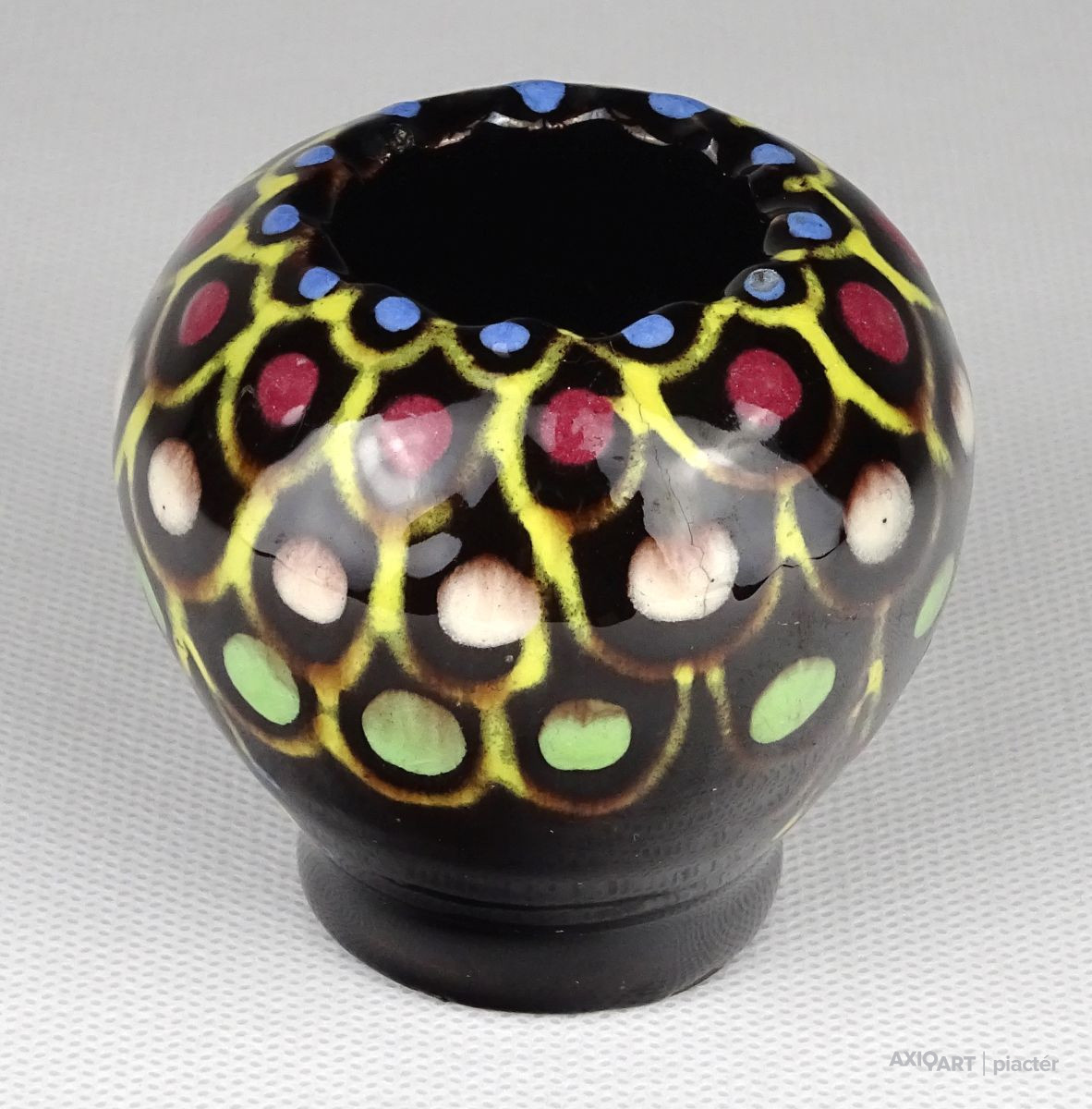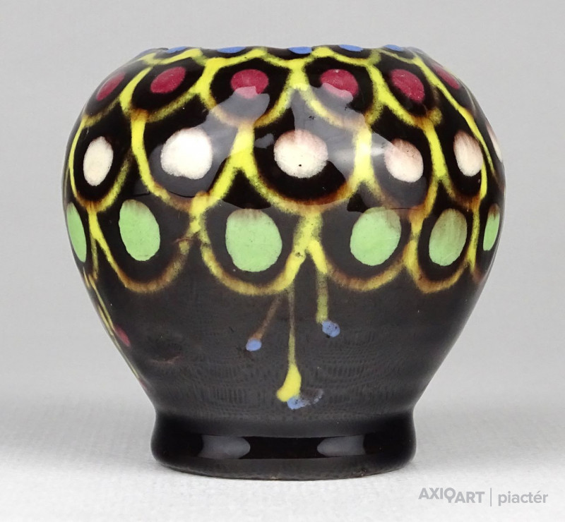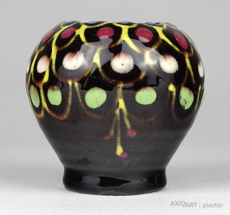 [1M660/X110] 25% ÁRENGEDMÉNY MINDEN TERMÉKÜNKRE Dec. 14-ig Régi, szép állapotú, kézzel festett, mázas kis méretű kerámia váza, ibolyaváza. Oldalán három sorban írókázott pettyezéses trikoloros díszítés. Magasság: 6.3 cm Szélesség: 7 cm Súly: 0.11 kg