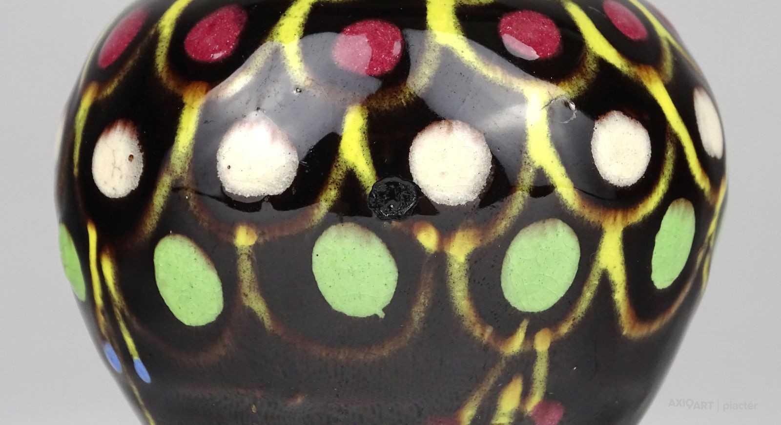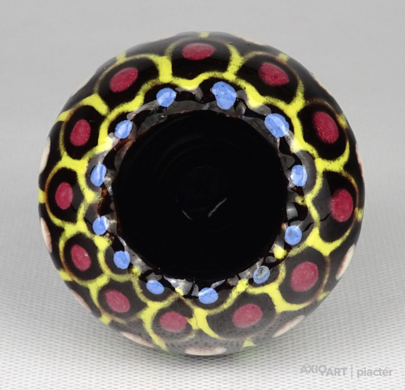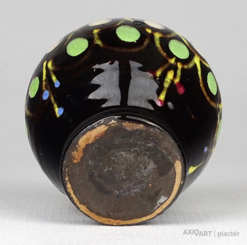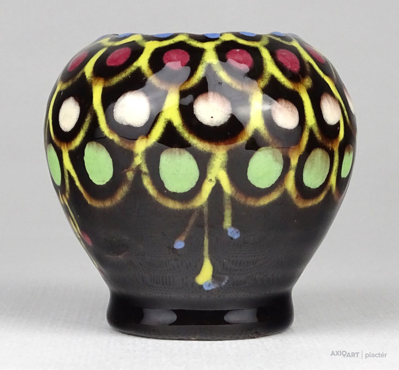 [1M660/X110] 25% ÁRENGEDMÉNY MINDEN TERMÉKÜNKRE Dec. 14-ig Régi, szép állapotú, kézzel festett, mázas kis méretű kerámia váza, ibolyaváza. Oldalán három sorban írókázott pettyezéses trikoloros díszítés. Magasság: 6.3 cm Szélesség: 7 cm Súly: 0.11 kg