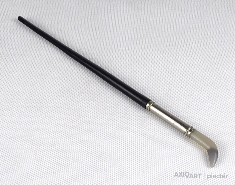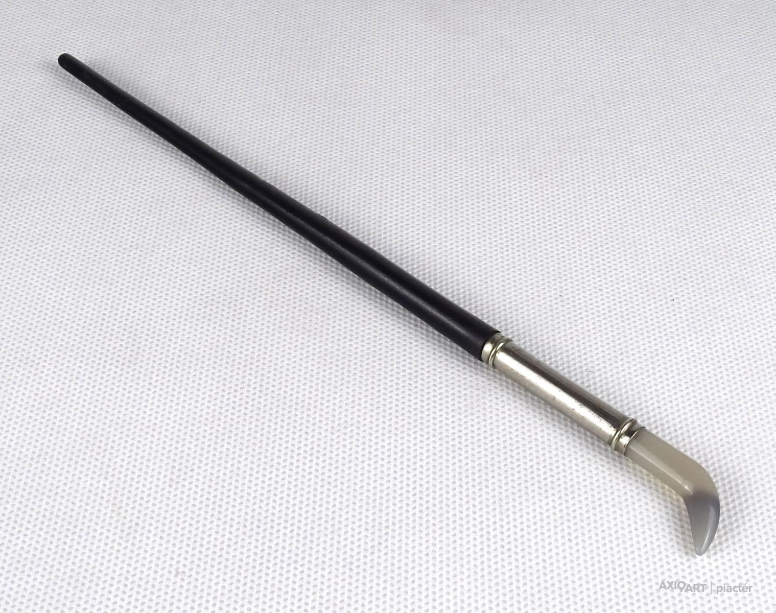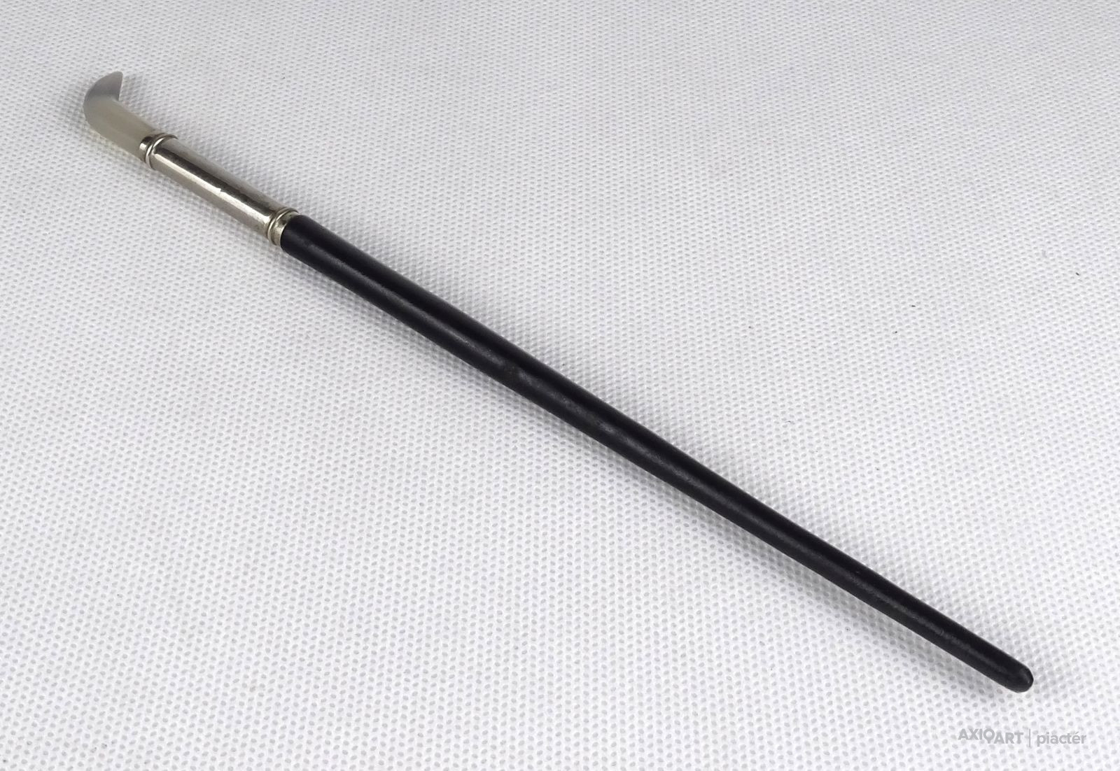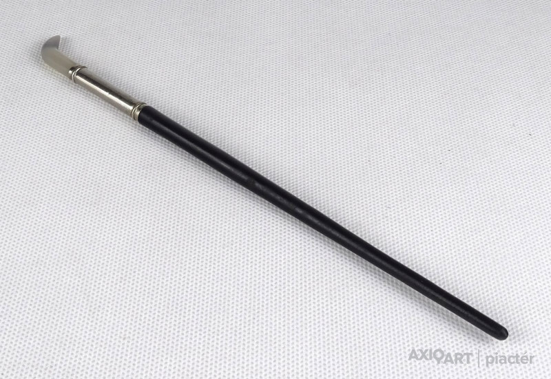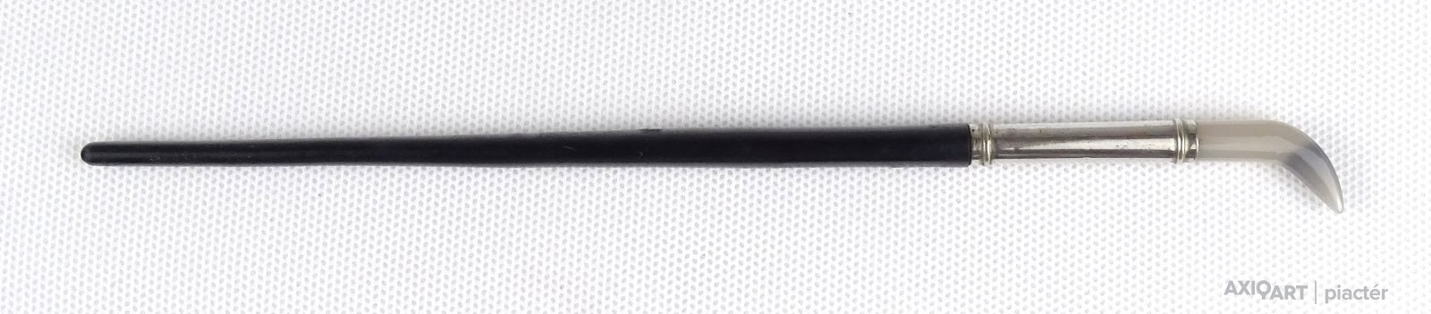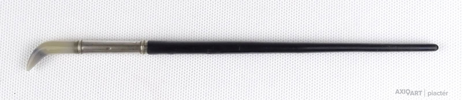Régi, szép állapotú, hosszú fekete fa szárral rendelkező írószerszám, toll, penna. A fém hüvelybe egy görbe üveg fej rész van foglalva. Ritka darab.
