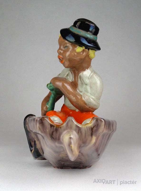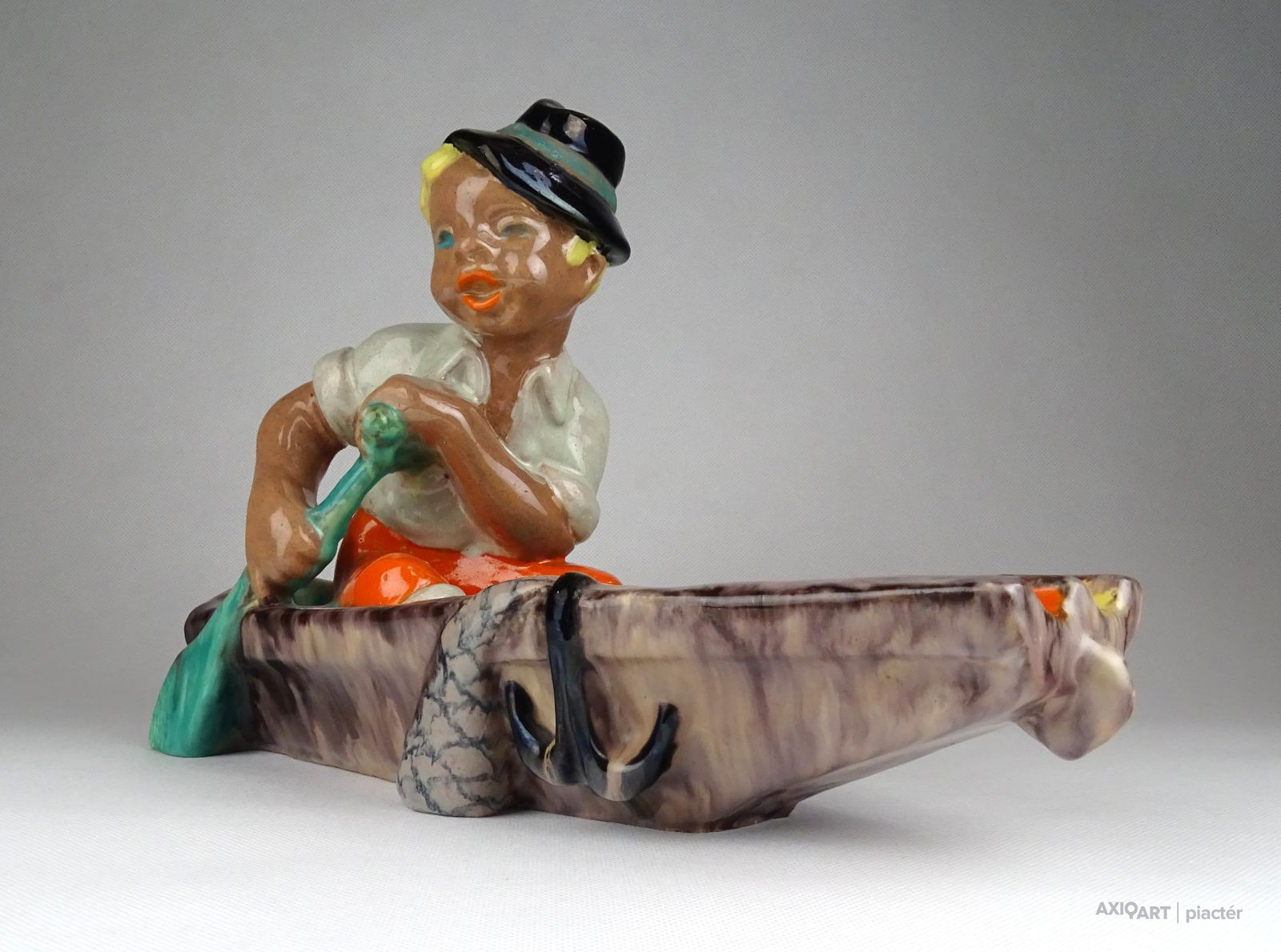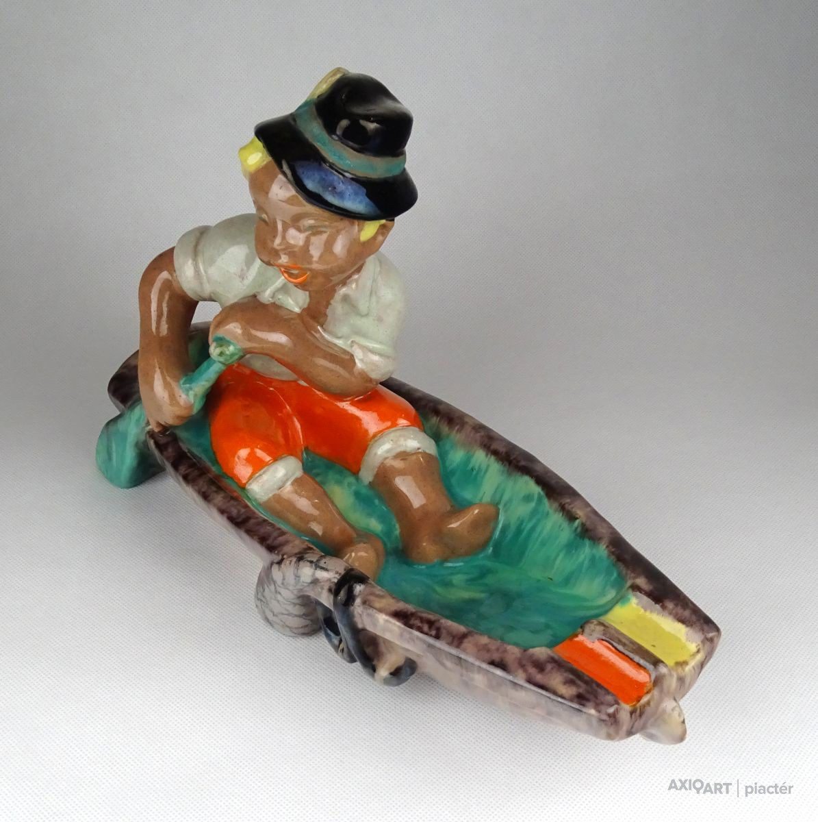 Régi, ép állapotú, art deco Komlós kerámia figurális hamutál. Csónakban ülő kalapos fiú. Az evezőt profi restaurátor javította.
