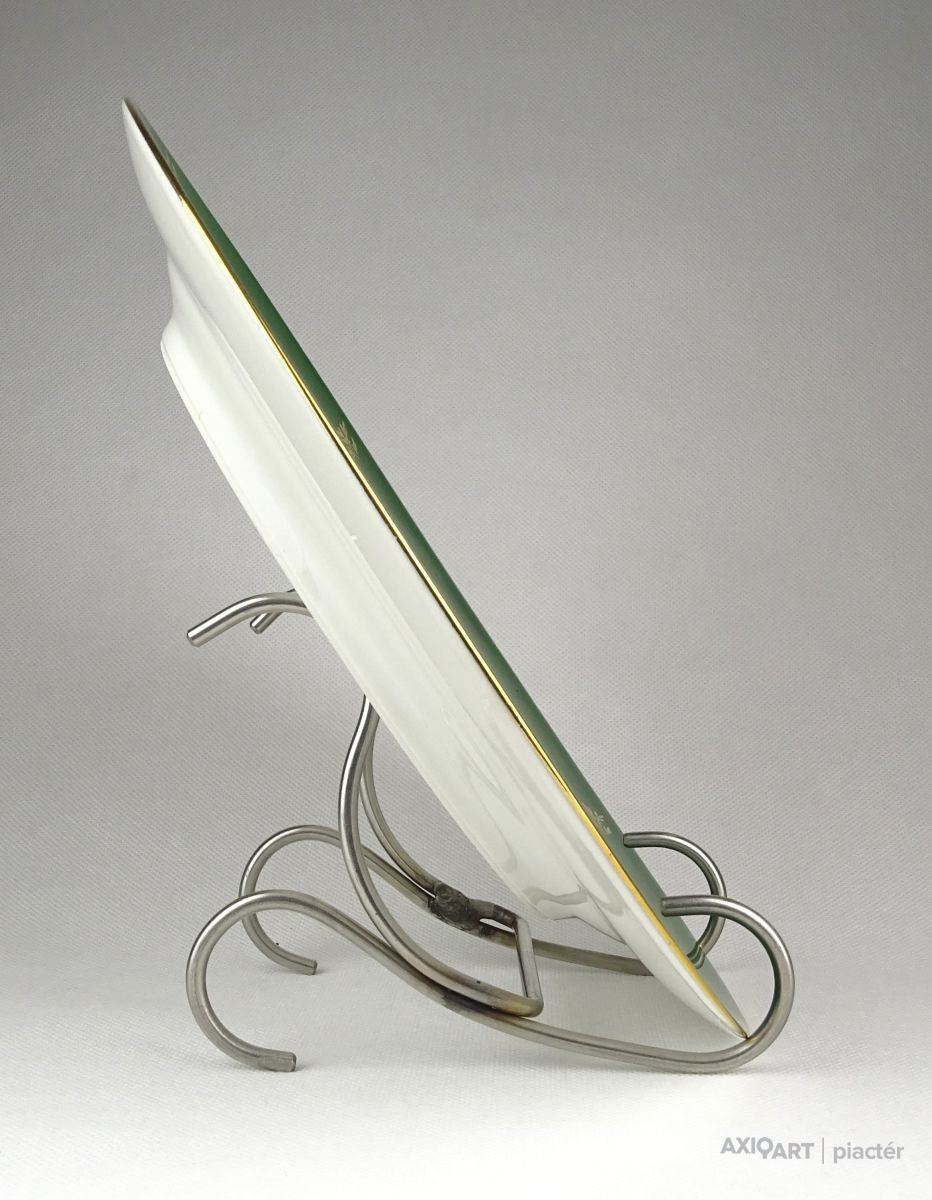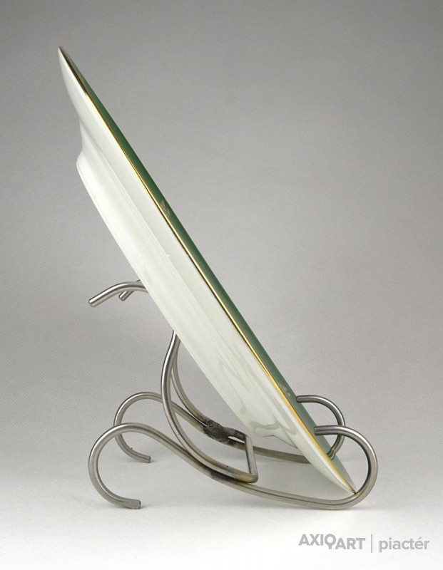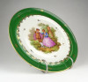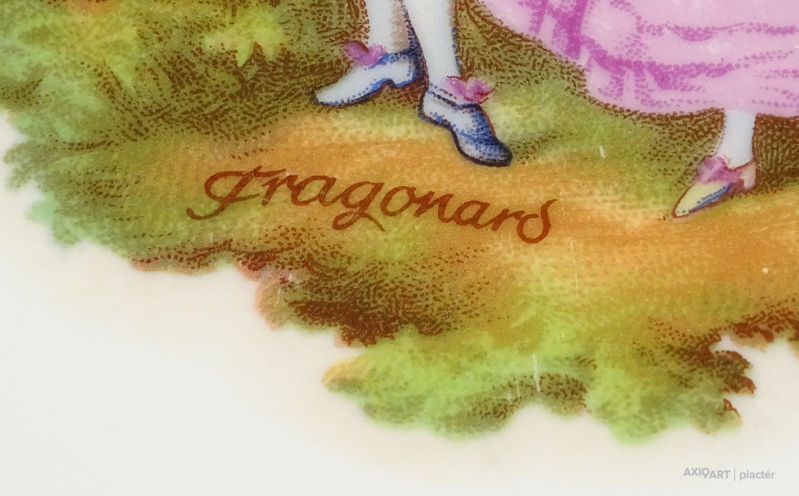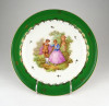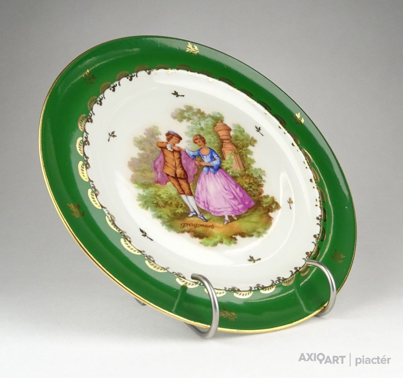 Régi, hibátlan állapotú, zöld szegélyes, aranyozott porcelán dísztányér, dísztál. Közepében kétalakos fűúri, szerelmes jelenet kastélykertben látható. Alatta felirat: FRAGONARD