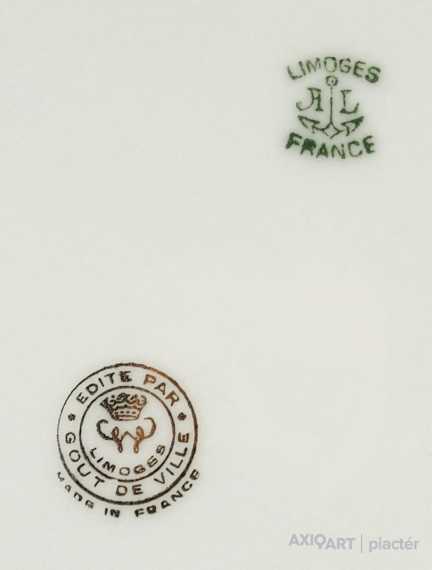 [0Z885/X245] Régi, hibátlan állapotú, zöld szegélyes, aranyozott porcelán dísztányér, dísztál. Közepében kétalakos fűúri, szerelmes jelenet kastélykertben látható. Alatta felirat: FRAGONARD Alján zöld vasmacskás jelzés: AL LIMOGES FRANCE Jelzés arannyal: LIMOGES EDITE PAR GOUT DE VILLE MADE IN FRANCE Szélesség: 23.5 cm Súly: 0.395 kg