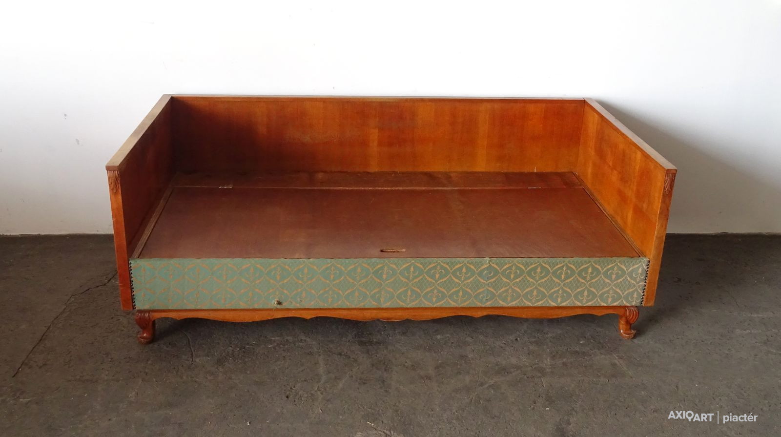 [1S731/DEV] Régi LINGEL, neobarokk lábas nagy méretű heverő, kanapé, ágy. Ágyneműtartóval rendelkezik. Rajta szépen kárpitozott epedarugós, kényelmes matracok találhatók. A kárpit egy helyen kissé sérült, lásd fotó. Párdarabját is árulom. Magasság: 73 cm Szélesség: 102 cm Hosszúság: 202 cm