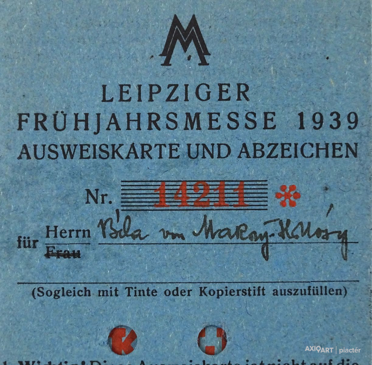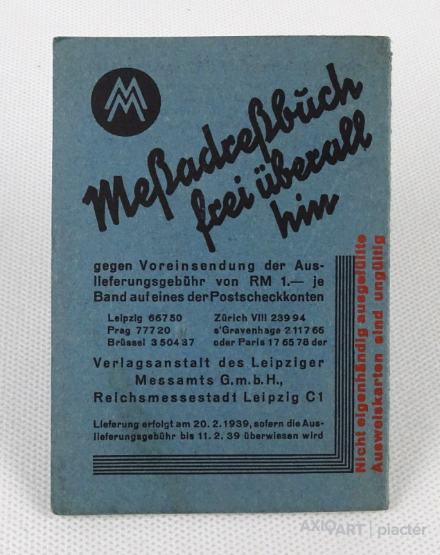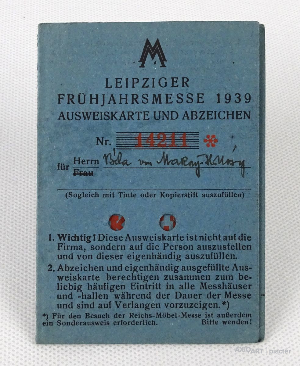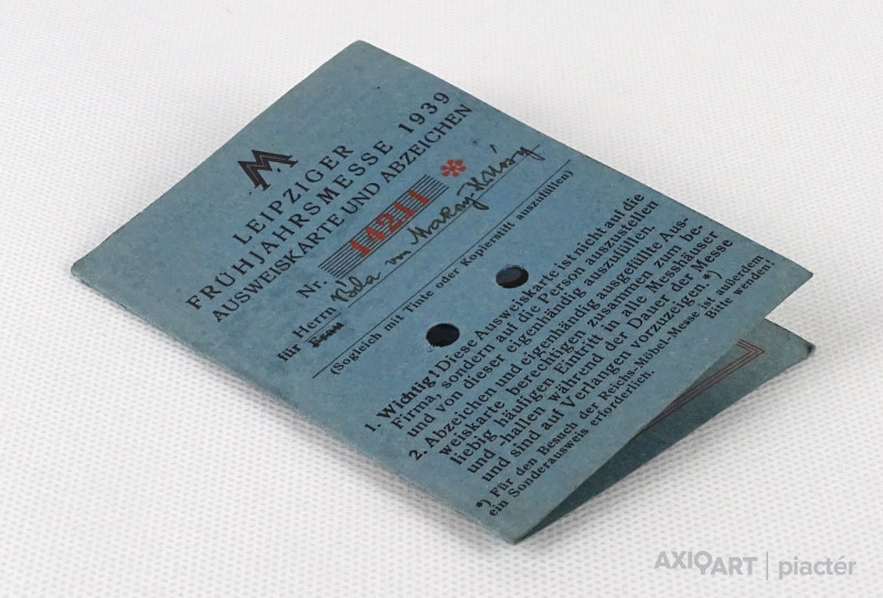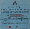 [1O278/X319] Régi, szép állapotú, személyre szóló irat, okmány, papírrégiség a második világháború kezdetének idejéből. Felirat: LEIPZIGER FRÜHJAHRSMESSE 1939 AUSWEISKARTE UND ABZEICHEN Szélesség: 7.4 cm Hosszúság: 10.5 cm Súly: 0.015 kg