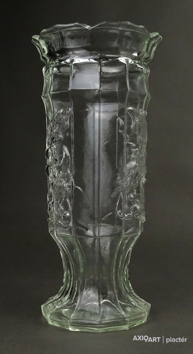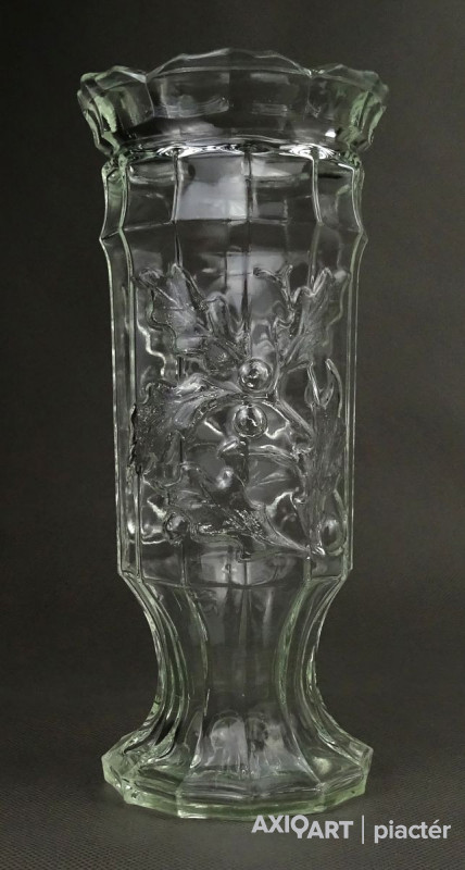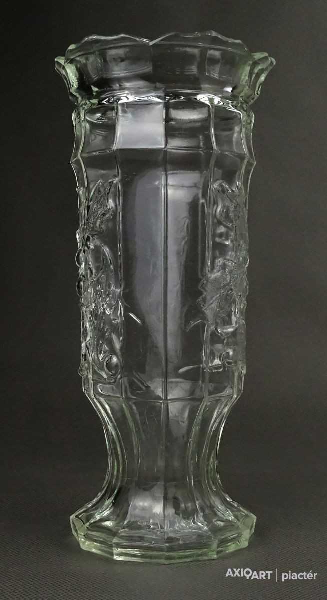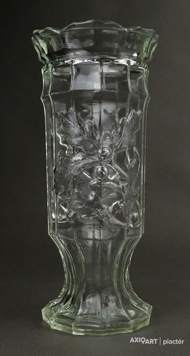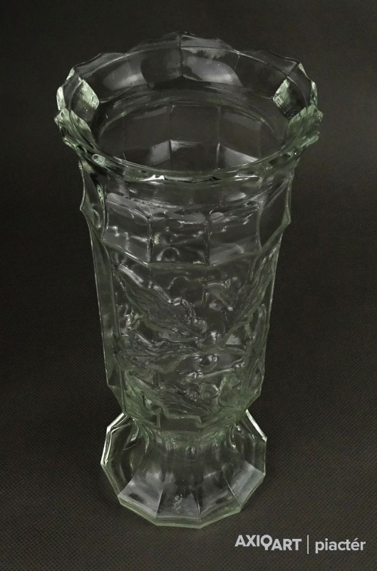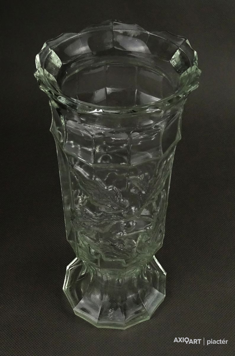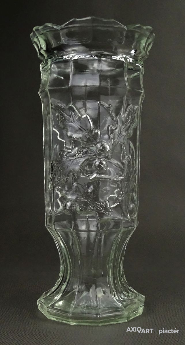 Régi formába préselt üveg váza, virágváza. Oldalán plasztikus magyal díszítés látható. Formába préselt üveg váza.