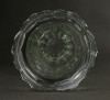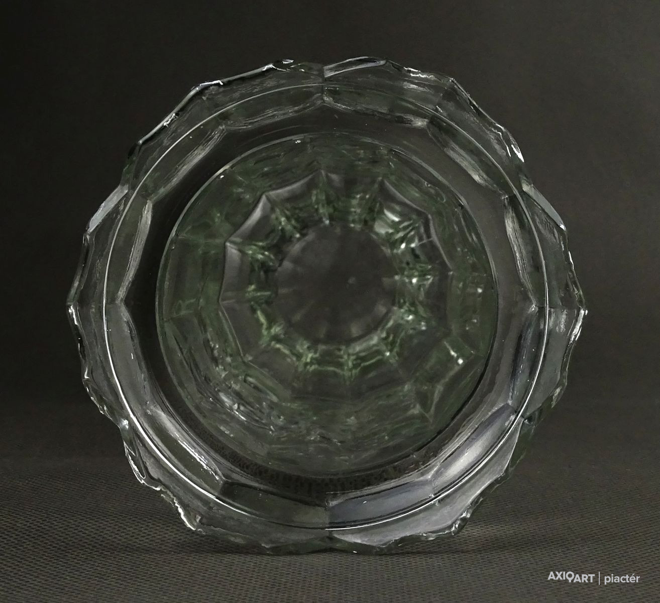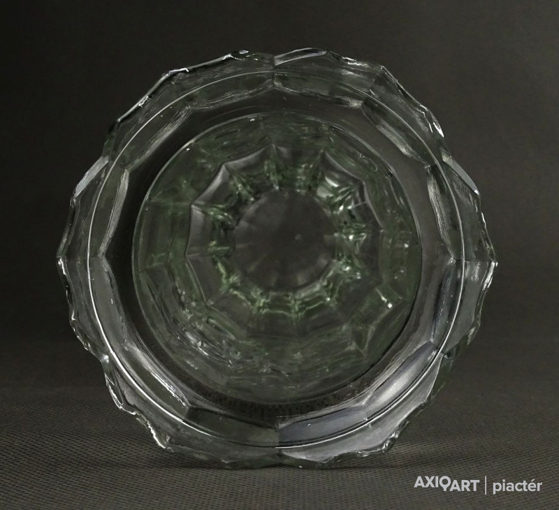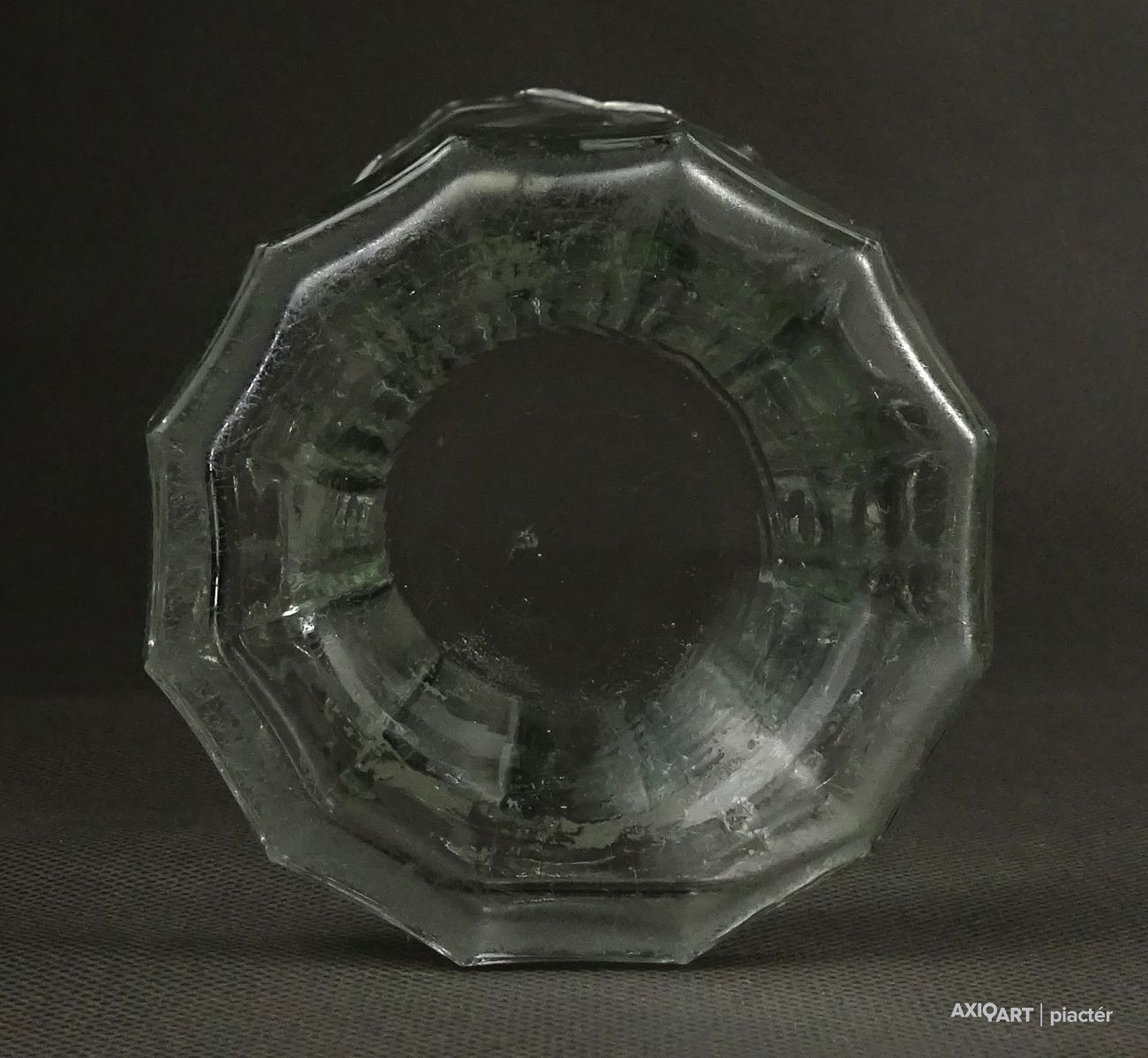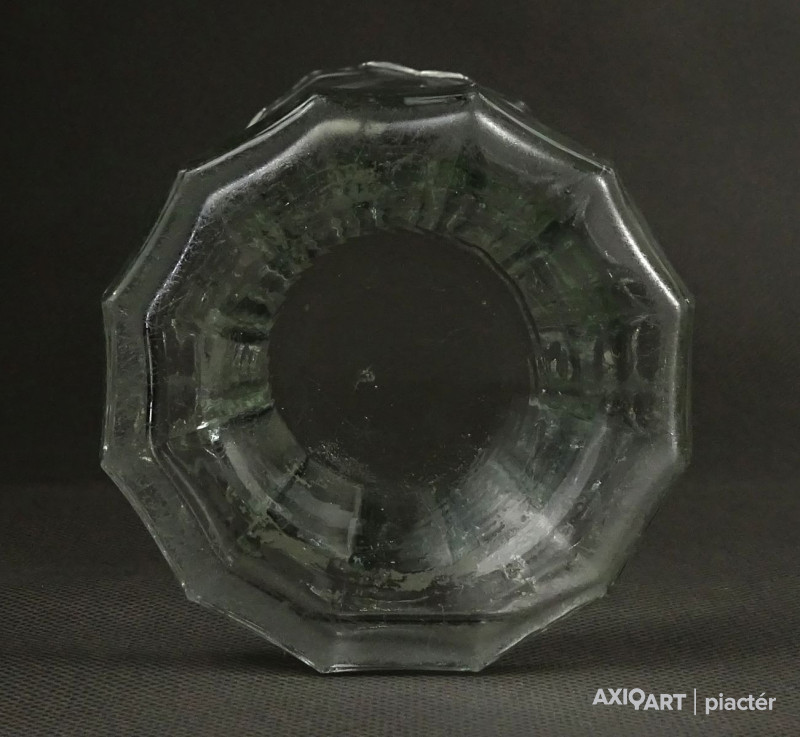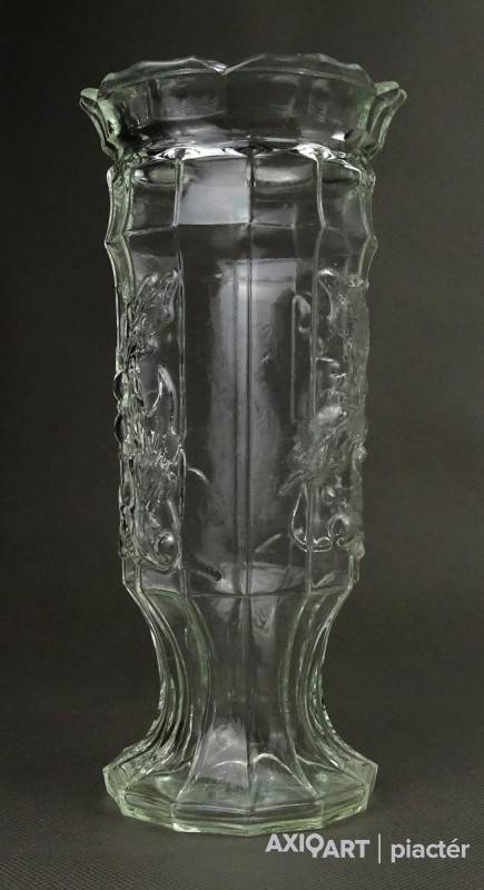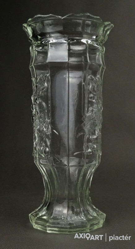 Régi formába préselt üveg váza, virágváza. Oldalán plasztikus magyal díszítés látható. Formába préselt üveg váza.