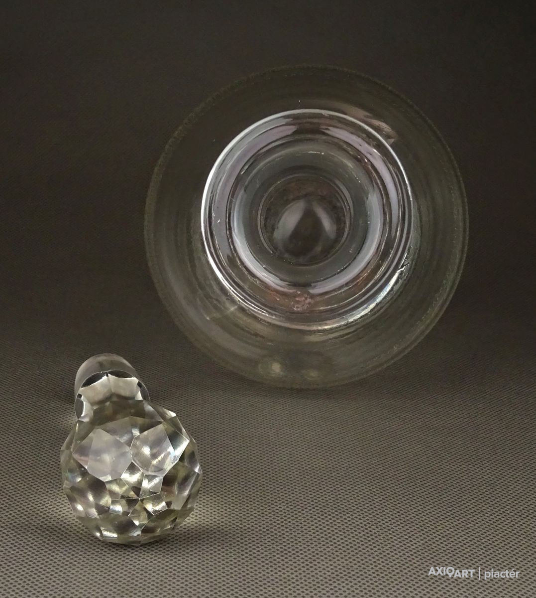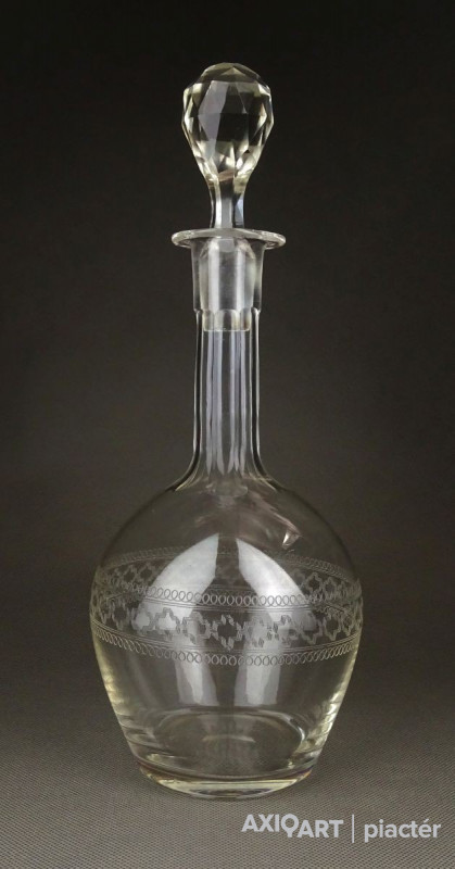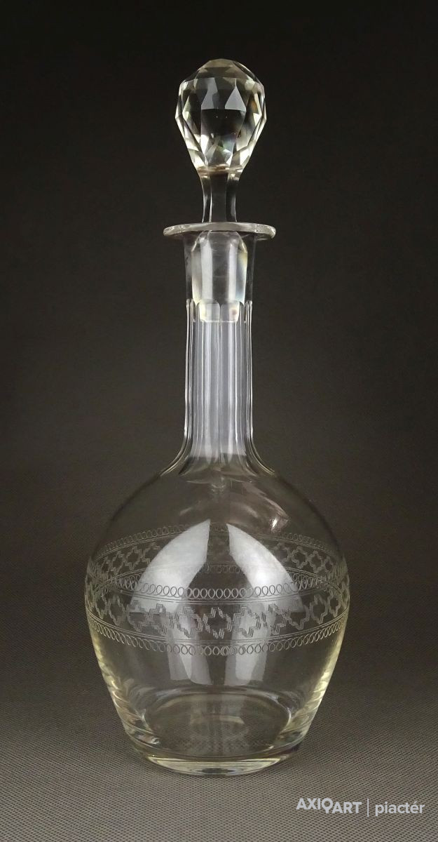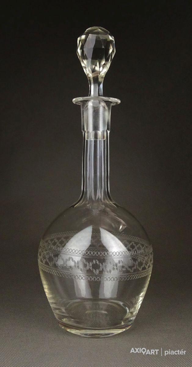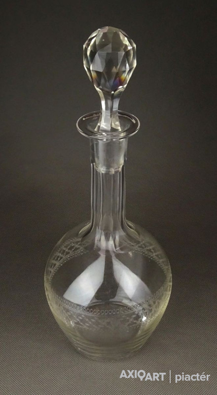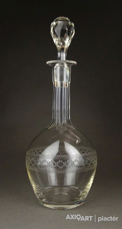 [1F967/X123] Hibátlan állapotú, régi fújt francia, csiszolt, maratott üveg kiöntő, hibátlan üveg dugóval. Oldalán kőrben gyönyörű maratott díszítés. Az alján a fújás, szakítás nyoma szépen ki lett csiszolva. Magasság: 29 cm Szélesség: 11 cm Súly: 0.48 kg