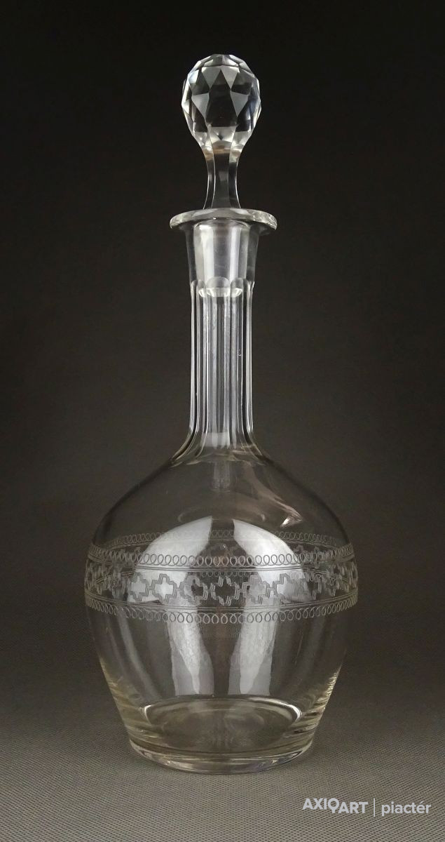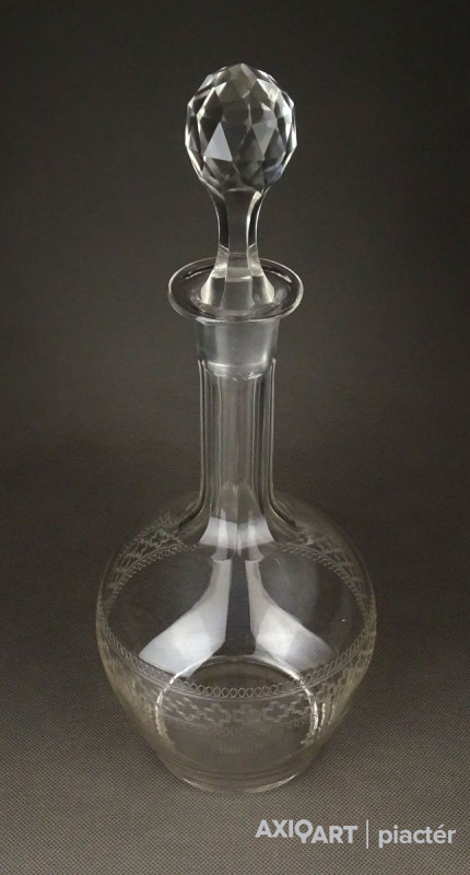 [1F969/X123] Hibátlan állapotú, régi fújt francia, csiszolt, maratott üveg kiöntő, hibátlan üveg dugóval. Oldalán kőrben gyönyörű maratott díszítés. Az alján a fújás, szakítás nyoma szépen ki lett csiszolva. Magasság: 32 cm Szélesség: 12.3 cm Súly: 0.59 kg