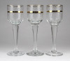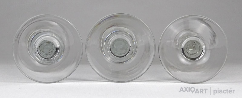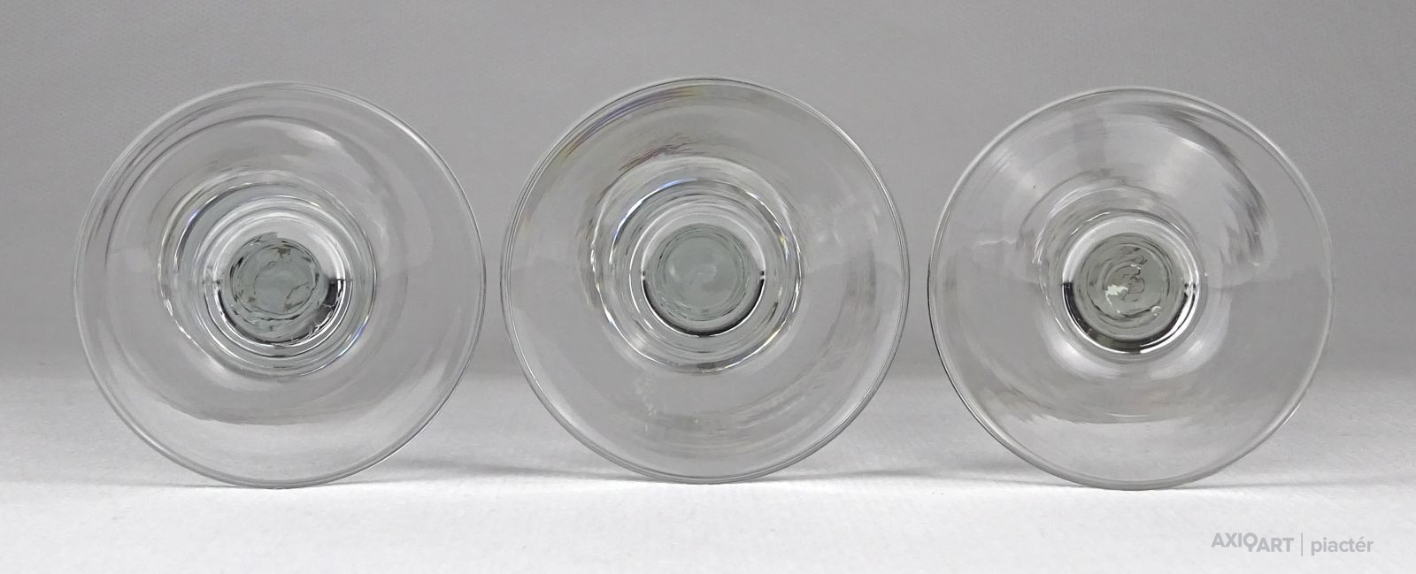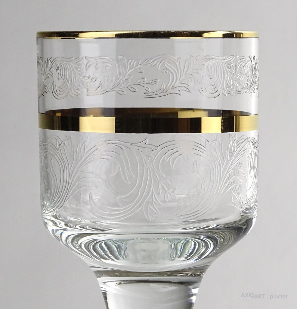 Hibátlan állapotú, vékonyfalú, gyönyörű, gazdag indás maratott motívumokkal díszített talpas üvegpohár. Három darab pálinkás, stampedlis, röviditalos poharak.