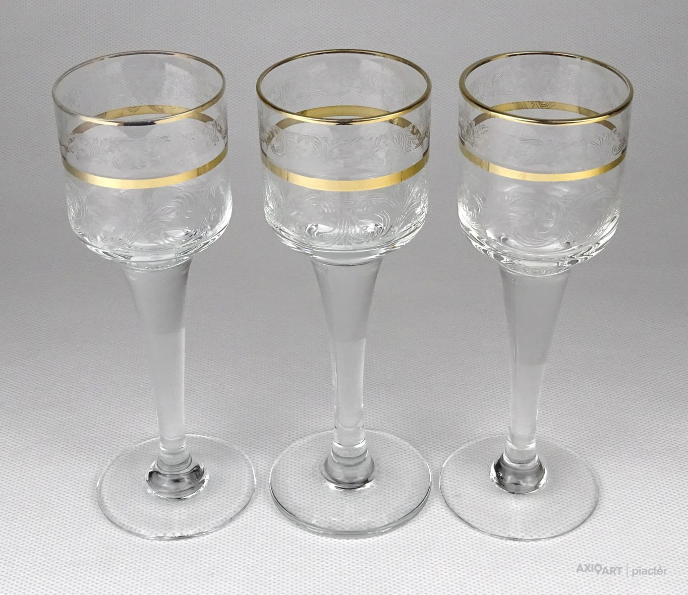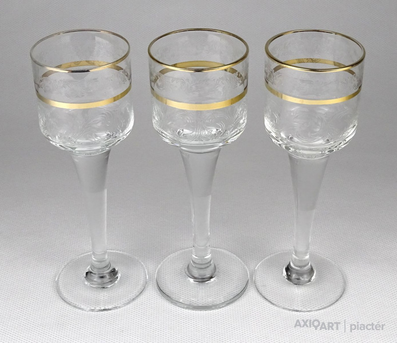 [1O638/X093] Hibátlan állapotú, vékonyfalú, gyönyörű, gazdag indás maratott motívumokkal díszített talpas üvegpohár. Három darab pálinkás, stampedlis, röviditalos poharak. Magasság: 14 cm Szélesség: 5 cm Súly: 0.25 kg