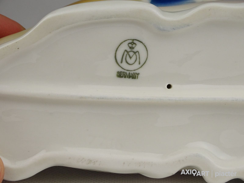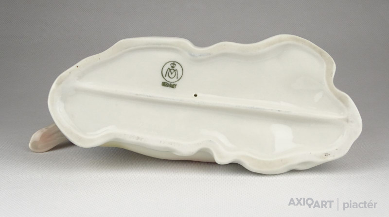[0Z595/Z010] Hibátlan állapotú, talapzaton ülő, nagyméretű régi jelzett porcelán vadkacsa. Alján zöld koronás márkajelzés: METZLER & ORTLOFF GERMANY Formaszám: 7716 Magasság: 9.5 cm Szélesség: 8 cm Hosszúság: 20 cm Súly: 0.405 kg Porzellanfabrik Metzler & Ortloff Fabrikgebäude Die Porzellanfabrik Metzler & Ortloff war ein Porzellanhersteller aus Ilmenau (Thüringen), der zwischen 1873 und 1976 bestand und vor allem für seine kunstvollen Porzellanartikel bekannt war. Die Marke „Metzler & Ortloff“ ist auch heute noch in Sammlerkreisen geschätzt. Das Unternehmen war der zweitgrößte Porzellanhersteller in Ilmenau, des Weiteren gab es noch die Unternehmen Henneberg-Porzellan, Galluba & Hoffmann sowie die Porzellanfabrik Arno Fischer.   Inhaltsverzeichnis   [Verbergen]  1Geschichte 1.1Gründung des Unternehmens 1.2Zwischen 1880 und 1945 1.3Nach dem Zweiten Weltkrieg 2Siehe auch 3Literatur 4Weblinks   Geschichte[Bearbeiten | Quelltext bearbeiten] Gründung des Unternehmens[Bearbeiten | Quelltext bearbeiten] Das Werksgelände um 1860 Die Geschichte des Unternehmens beginnt als der Ilmenauer Kaufmann Adolf Höhn 1863 das Gelände des ehemaligen Carl-August-Schachtes in der Weimarer Straße in Ilmenau kaufte, um dort eine Fabrik zu gründen. Der Carl-August-Schacht wurde 1856 errichtet. Er bestand aus einem Malakow-Turm und angeschlossenen Werkshallen. Der Schacht sollte Kupferschiefer fördern. 1859 wurde der Betrieb jedoch wegen Unrentabilität eingestellt und anschließend zum Verkauf angeboten. 1865 kaufte Höhn noch die Kleine Massenmühle (im Bereich der heutigen GO!-Tankstelle in der Schleusinger Allee) hinzu, in der er die Porzellan-Rohmasse für seine Fabrik fertigen lassen wollte. 1873 konnte Höhn die Brüder Rudolf und Robert Metzler aus Sonneberg von einer Teilhaberschaft überzeugen, da er, um die Fabrik aufzubauen, noch Kapital und erfahrene Unternehmer benötigte. Es wurde ein Unternehmen namens Höhn & Metzler gegründet, das am 18. April 1873 in das Handelsregister des Amt Ilmenau eingetragen wurde. Jedoch waren die ersten Jahre des Unternehmens nicht von Erfolg geprägt, weswegen Adolf Höhn 1875 als Teilhaber ausschied und sein Kapital abzog. Daraufhin suchten die Gebrüder Metzler nach einem neuen Teilhaber und fanden diesen in Person von Hugo Ortloff. Daraufhin wurde die Fabrik 1875 in Metzler & Ortloff umbenannt und es begann eine erfolgreichere Phase. Zwischen 1880 und 1945[Bearbeiten | Quelltext bearbeiten] Die Porzellanfabrik erlebte nach 1875 einen stabilen Aufschwung, sodass sie 1890 bereits etwa 120 Mitarbeiter zählte. Hergestellte Produkte waren zu dieser Zeit vor allem Geschirr, Apothekerutensilien, Figuren, Nippesartikelund Puppen sowie Puppenteile, die in der Ilmenauer Spielwarenindustrie weiterverarbeitet wurden. Die Produktpalette umfasste etwa 2000 verschiedene Artikel, wovon im Jahr etwa 3,5 Millionen Stück hergestellt wurden. Der Erste Weltkrieg und seine Folgen brachten das Unternehmen erneut in Schwierigkeiten. So kam es in den frühen 1920er-Jahren immer wieder zu Streiks in der Belegschaft, die erst 1923 nachließen, als sich der damalige Unternehmensbesitzer Hugo Ortloff jun. hart zeigte und Verhandlungen ablehnte. Nach der Weltwirtschaftskrise 1929 geriet die Fabrik in eine desolate Finanzlage und musste die Produktion häufig kurzzeitig einstellen und zahlreiche Mitarbeiter entlassen. Bis zum Beginn des Zweiten Weltkrieges 1940 besserte sich die Lage des Unternehmens - entgegen dem allgemeinen Trend - nur langsam. Der Zweite Weltkrieg selbst bescherte der Fabrik hingegen volle Auftragsbücher, die aber wegen Rohstoffmangels und verringerter Belegschaft nur langsam abgearbeitet werden konnten. Ein Großteil der Produktion ging in den Export. Die Erfolge des Unternehmens beruhten nicht zuletzt auf der Persönlichkeit von Hugo Ortloff, dem Sohn des Unternehmensgründers. Er trat 1900 nach abgeschlossenem Studium der Chemie und Kunstgeschichte mit 25 Jahren ins Unternehmen ein. Die Produktion wurde auf Zierporzellan wie Figuren, Vasen, Leuchter, Schalen usw. ausgedehnt. Die Porzellanmasse, Glasuren und Brenntechnik wurden verbessert und die Unterglasurmalerei erlebte eine Blütezeit. Für das Unternehmen arbeiteten bedeutende Bildhauer und Bildhauerinnen wie Paul Wynand, Siegismund Wernekinck, Erich Schmidt-Kestner, Carl Nacke, August Bornkessel, Karl Röhrig, Paul Zeiller, Gustav Oppel,Hans Knesl, Walter Bosse, Helmut Diller, Fritz Diller, Franz Lippert, Klára Herczeg, Horst Aschermann, Josef Baier, Richard Scheibe, Max Sauerbrey, Erich Legler, C. Graser, C. Mutzenbacher, Karl Kemedinger, Hoffmann, Jeuthe, Winkler und Wessel. Nach dem Zweiten Weltkrieg[Bearbeiten | Quelltext bearbeiten] Nach dem Zweiten Weltkrieg produzierte Metzler & Ortloff nach wie vor mehrheitlich für den Export, was jedoch der staatlichen Planungsbehörde der DDR missfiel, sodass angeordnet wurde weniger für den Export und mehr für den Binnenmarkt zu produzieren. Die Zahl der Mitarbeiter lag in den 1950er- und 1960er-Jahren bei etwa 125. Erst am 1. Januar 1959 wurde die Fabrik verstaatlicht und in eine Kommanditgesellschaft umgewandelt. DieGesellschafter wurden enteignet und ihre Anteile wurden der Deutschen Investitionsbank übergeben, die fortan der Besitzer des Betriebes war. 1968 wurde der Betrieb von der Deutschen Investitionsbank an die Porzellanfabrik Lichte übergeben, die wiederum unter das Kombinat Henneberg-Porzellan in Ilmenau untergeordnet war. Als 1975 der neue Fabrikkomplex von Henneberg-Porzellan am Eichicht in Ilmenau in Betrieb ging, wurde die alte Fabrik geschlossen, was das Ende der Marke „Metzler & Ortloff“ bedeutete. Das Unternehmensgelände wird heute von verschiedenen Unternehmen genutzt. Es gibt u.a. dort ein Möbelhaus, eine Kampfsportschule, eine Krankenkassenfiliale und einige andere Niederlassungen. Forrás: https://de.wikipedia.org/w