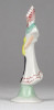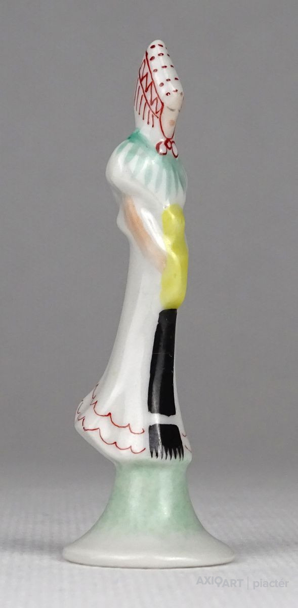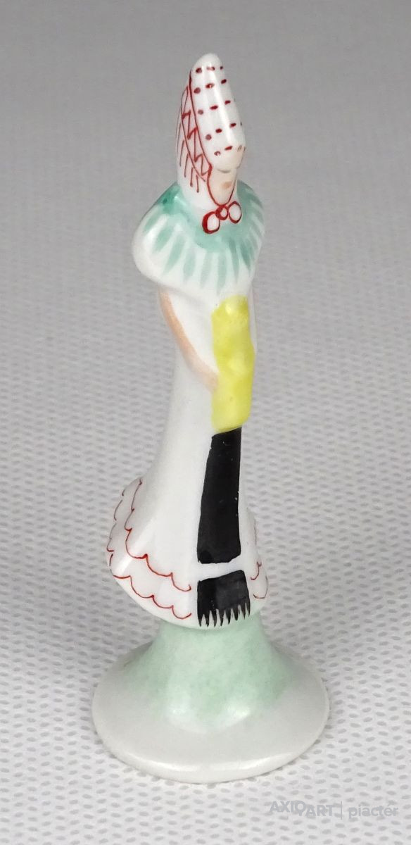 Régi hibátlan állapotú, kis méretű jelzett talapzaton álló népviseletes, fejkendős nő porcelán szobor, figura.