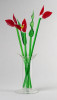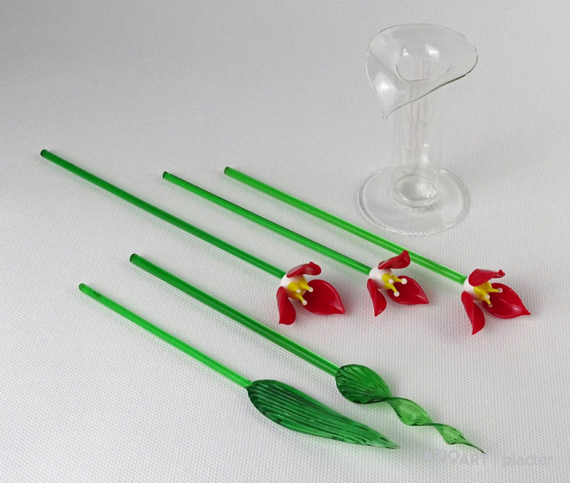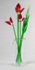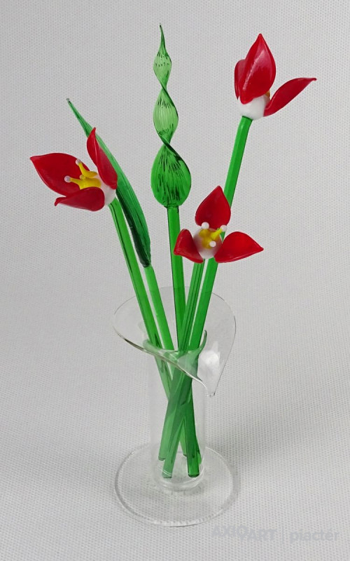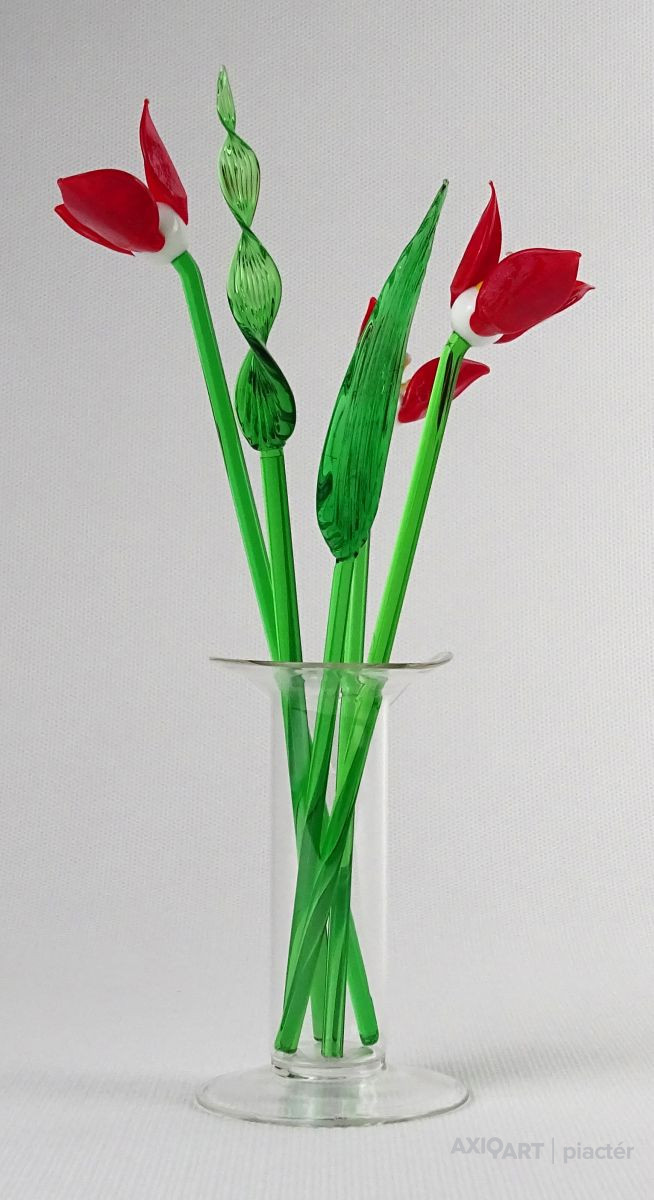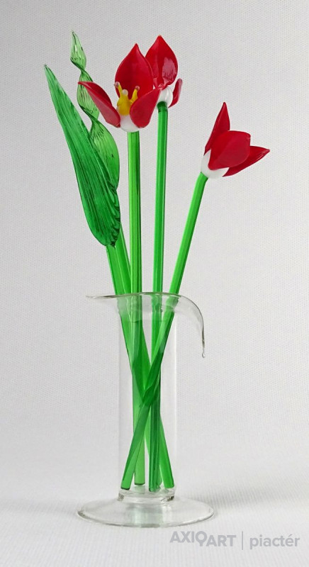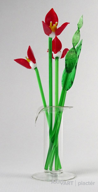 [1M436/X011] Régi fújt üveg virágcsokor fújt üveg vázában. A szett részei: - 1 darab váza (8.5 x 5.3 cm) - 3 darab virág (15.3, 17, 19 cm) - 2 darab száras levél (17, 18.7 cm) Súly: 0.147 kg