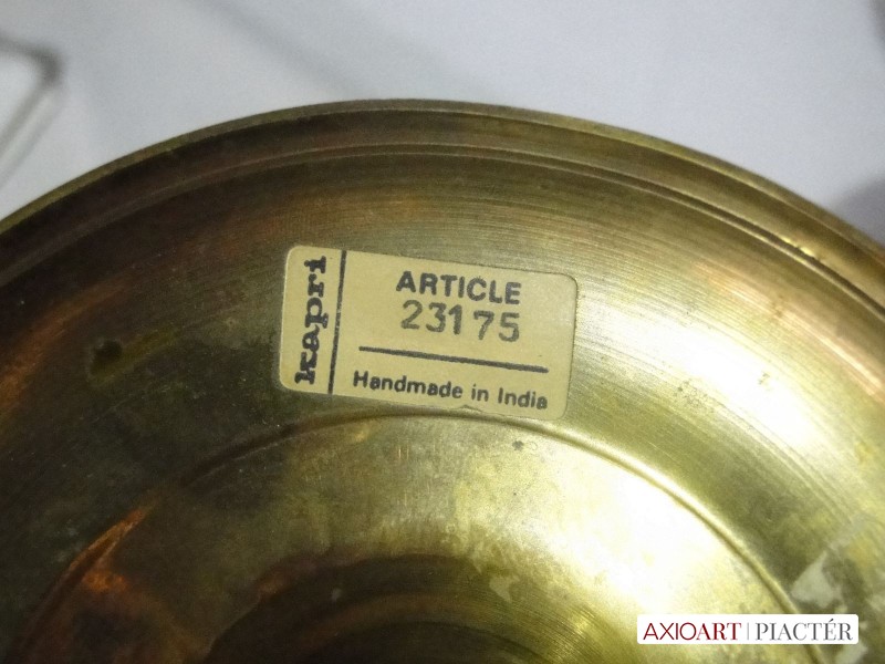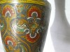 [8735/X036] Gyönyörű színes zománc festéssel díszített nagy méretű talpas, jelzett réz váza. Alján papírvignetta: KAPRI ARTICLE 23175 HANDMADE IN INDIA A váza testén egy kisebb horpadásnyom látható. Magasság: 47 cm Szélesség: 11.5 cm Súly: 1.327 kg