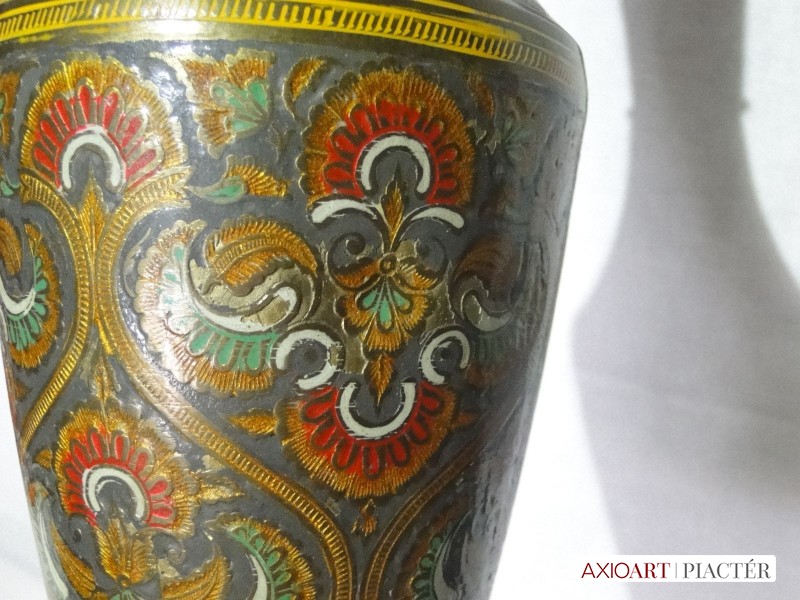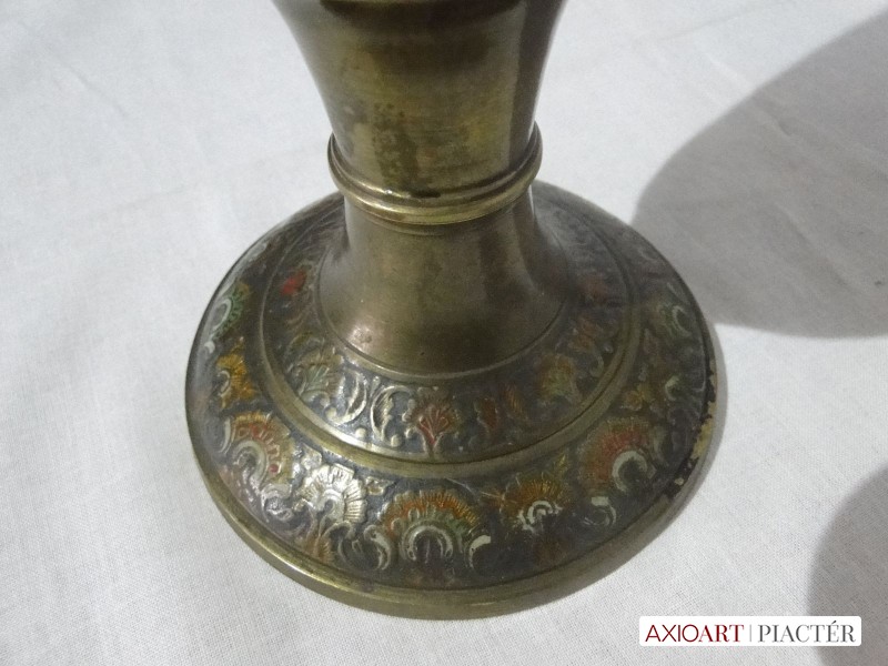 Gyönyörű színes zománc festéssel díszített nagy méretű talpas, jelzett réz váza.