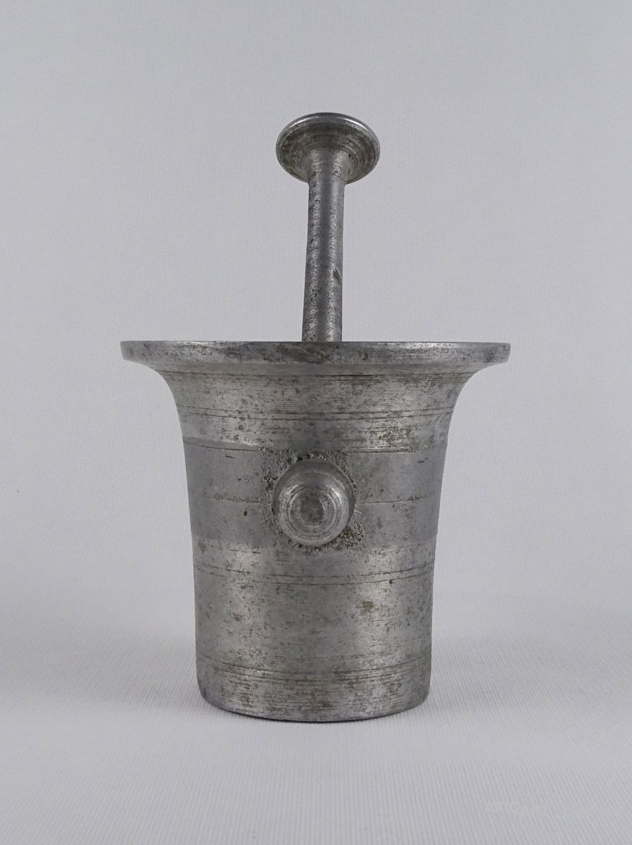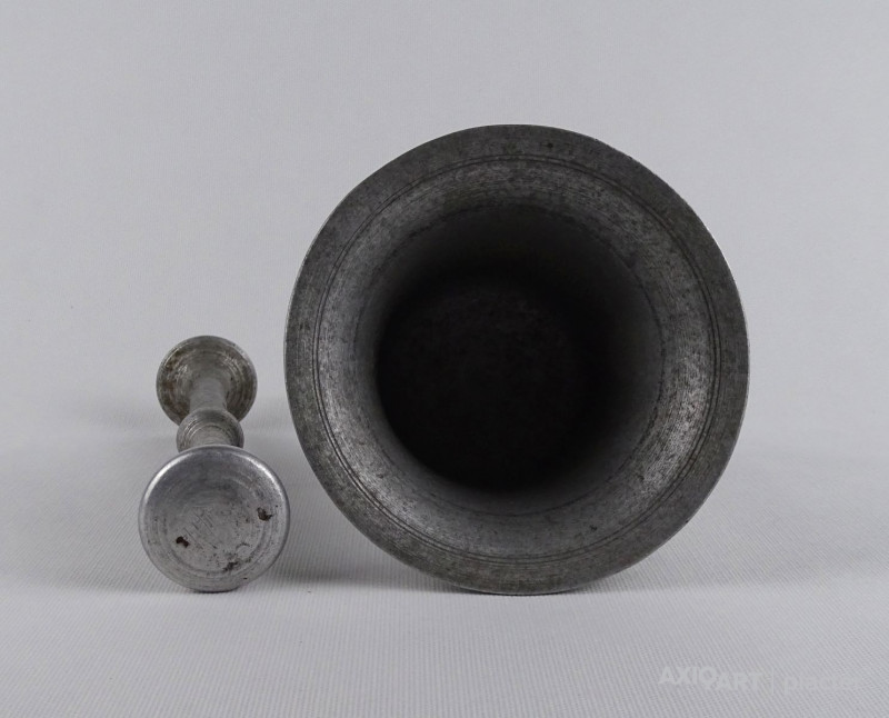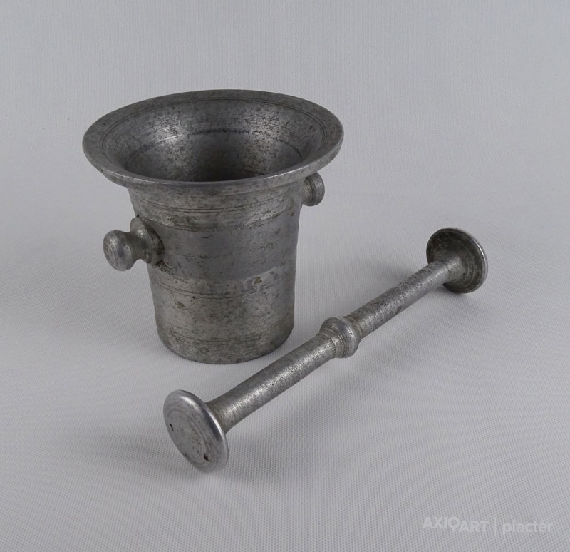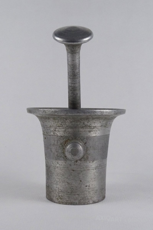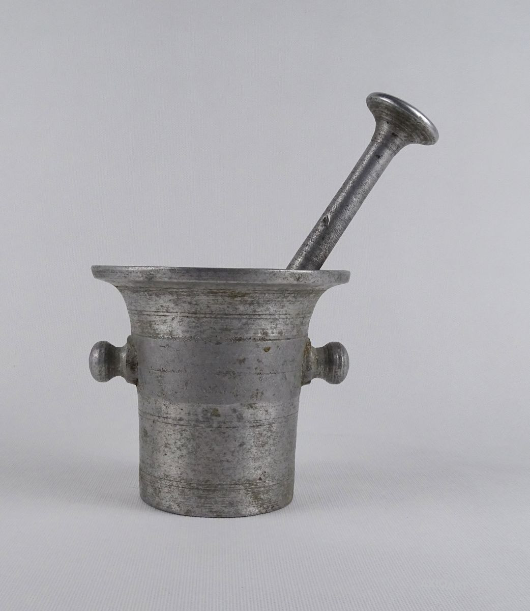 Régi, szép állapotú, nagyméretű alumínium mozsár törővel együtt.
