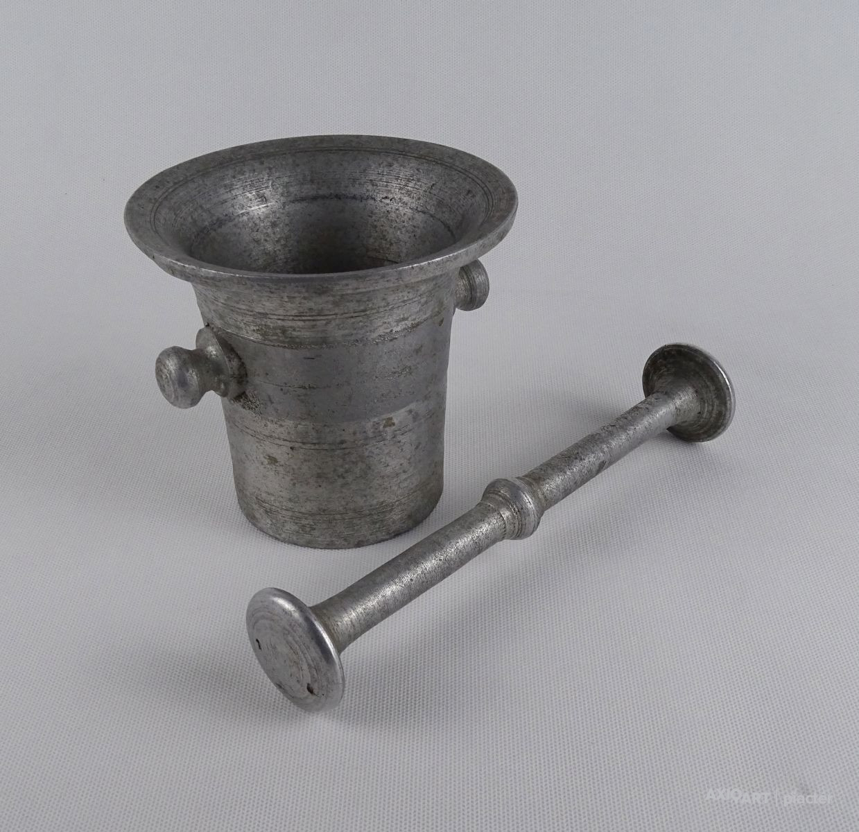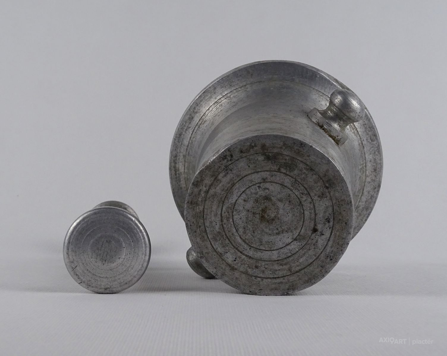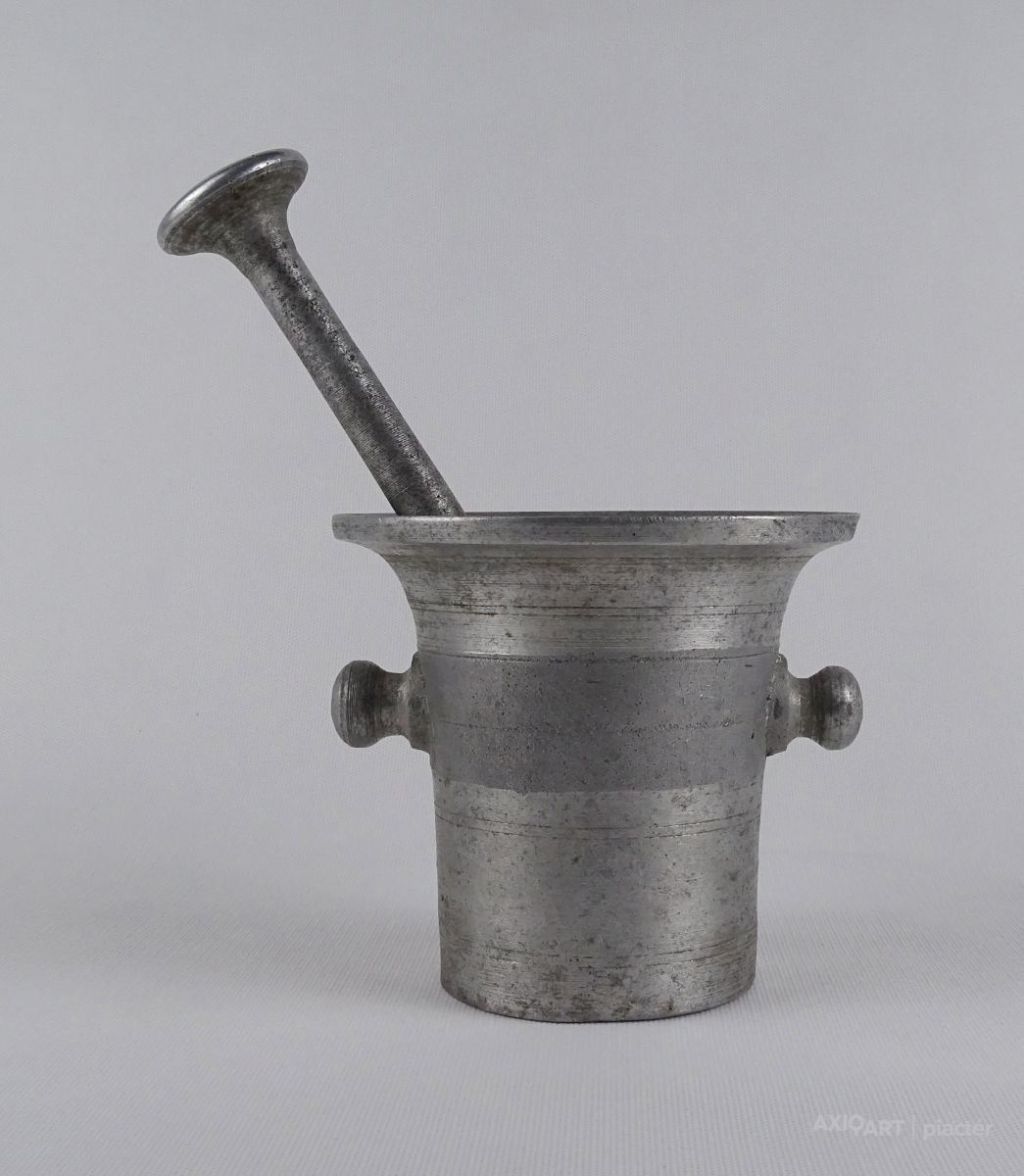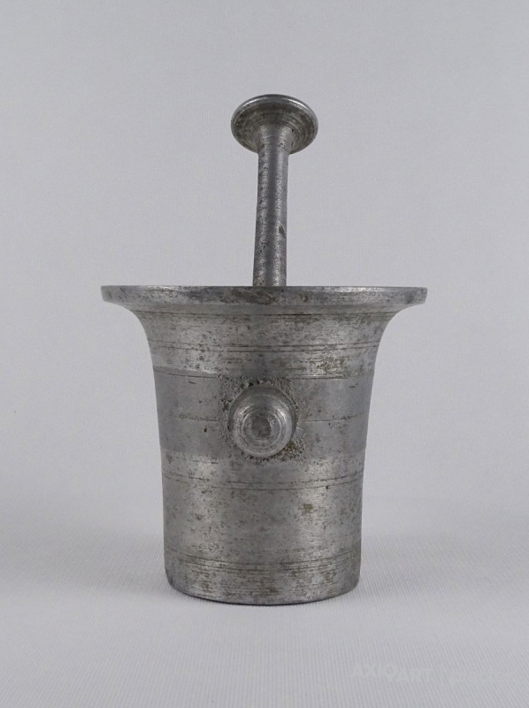 Régi, szép állapotú, nagyméretű alumínium mozsár törővel együtt.