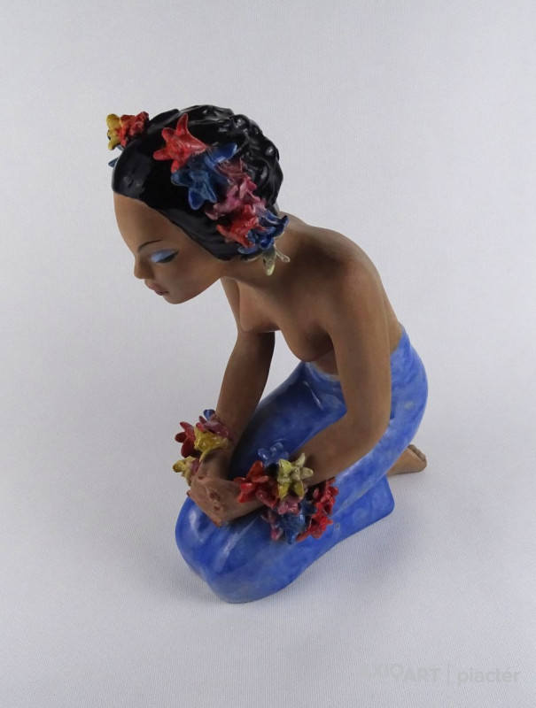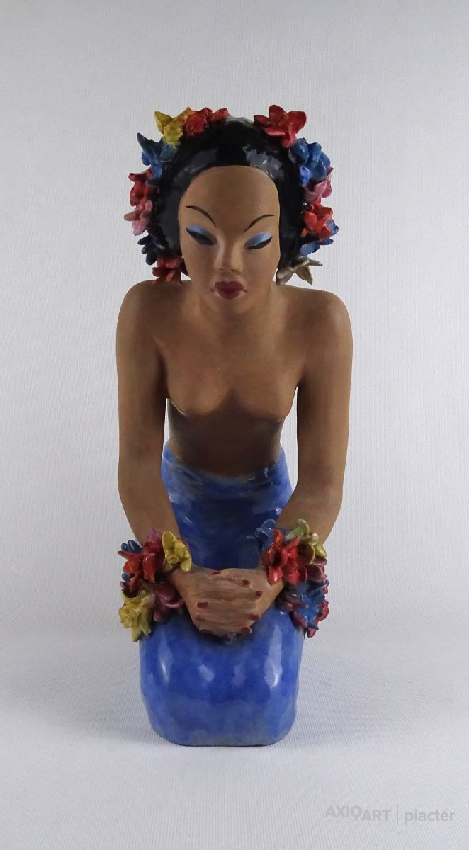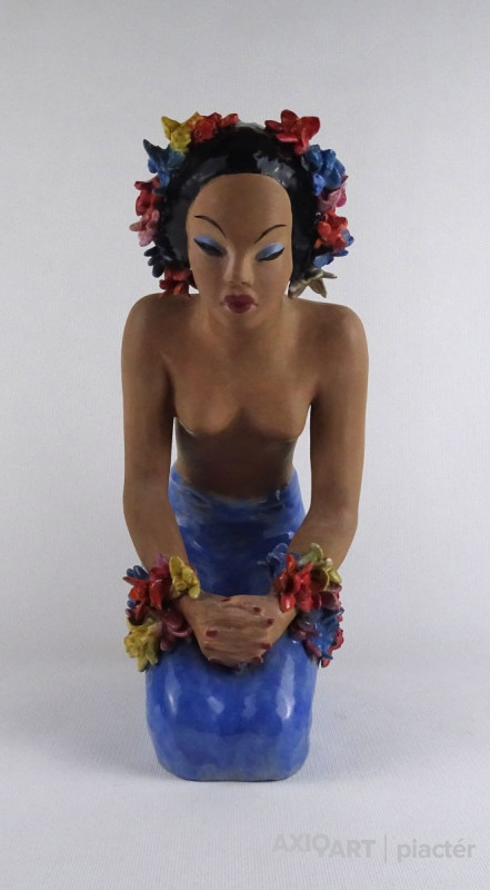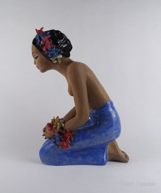 Régi, 1930-as évekből való, hibátlan állapotú félmeztelen art deco kerámia szobor. Haja, ruhája és a virágok mázasak, felső teste fedetlen és máz nélküli, "vászon" felület. Fején és csuklóján plasztikus virágfüzér látható. A nő nyakát, kezét és virágait profi restaurátor javította.