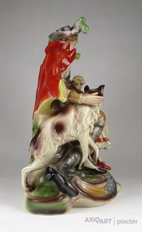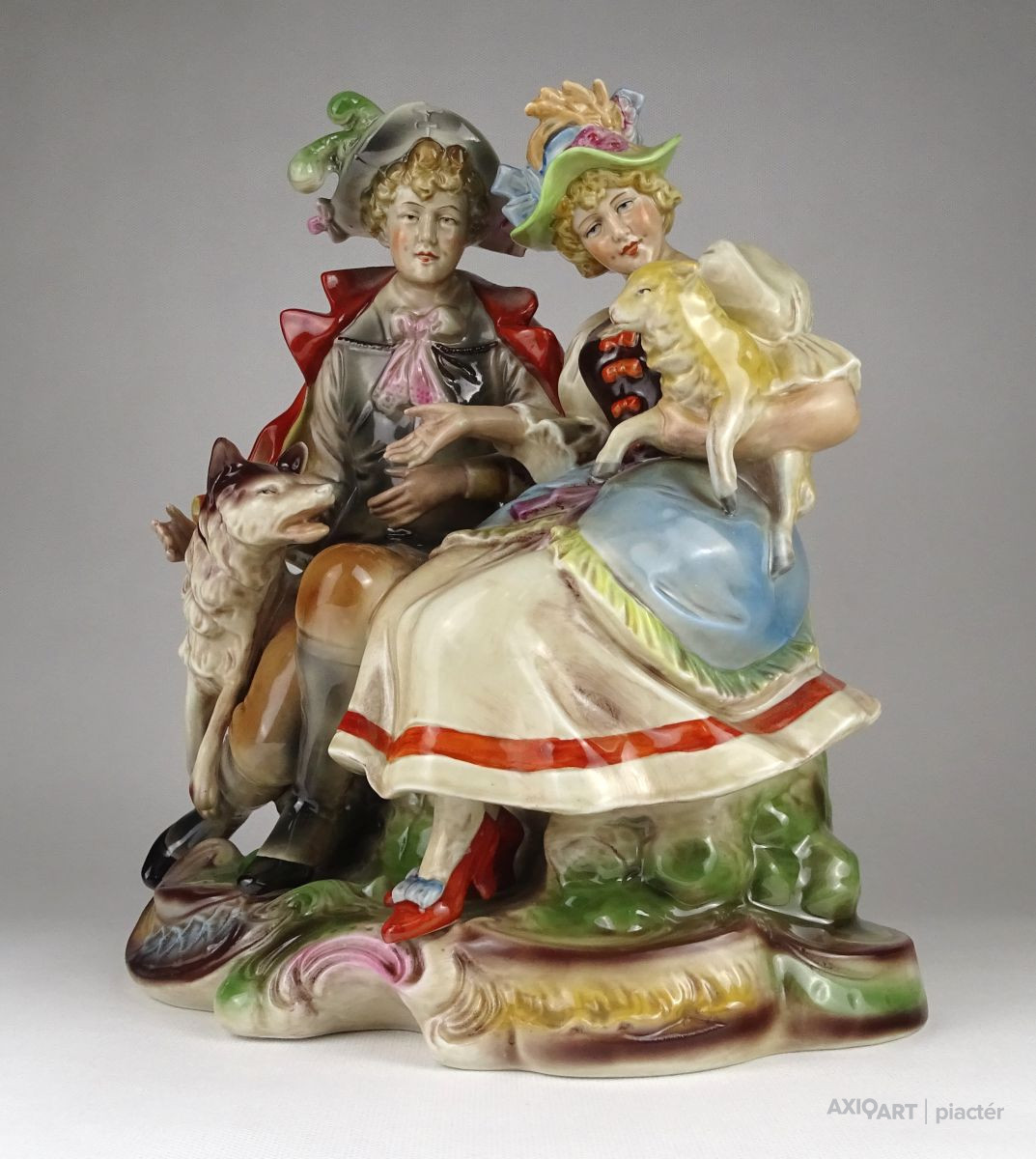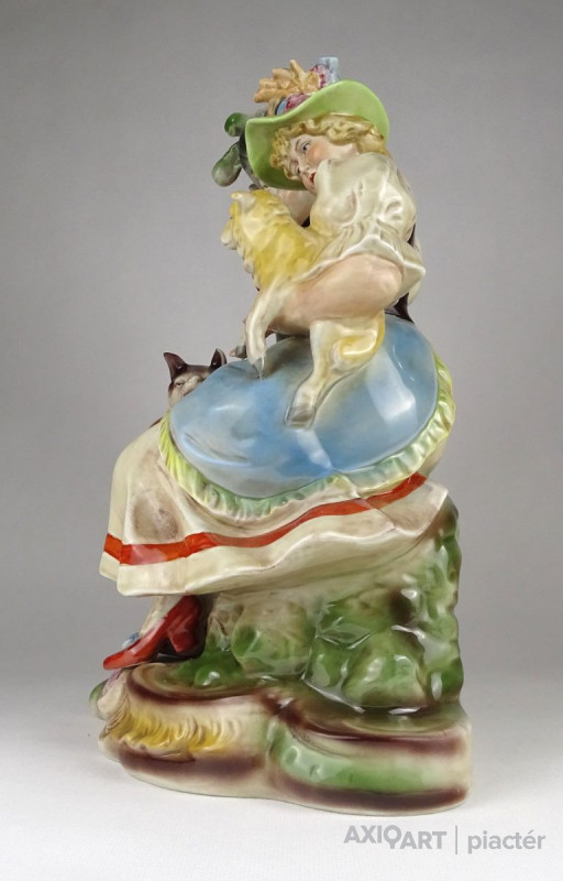Hibátlan állapotú, nagy méretű porcelán szobor pár talapzaton. Kalapos hölgy báránnyal és kalapos férfi kutyával.