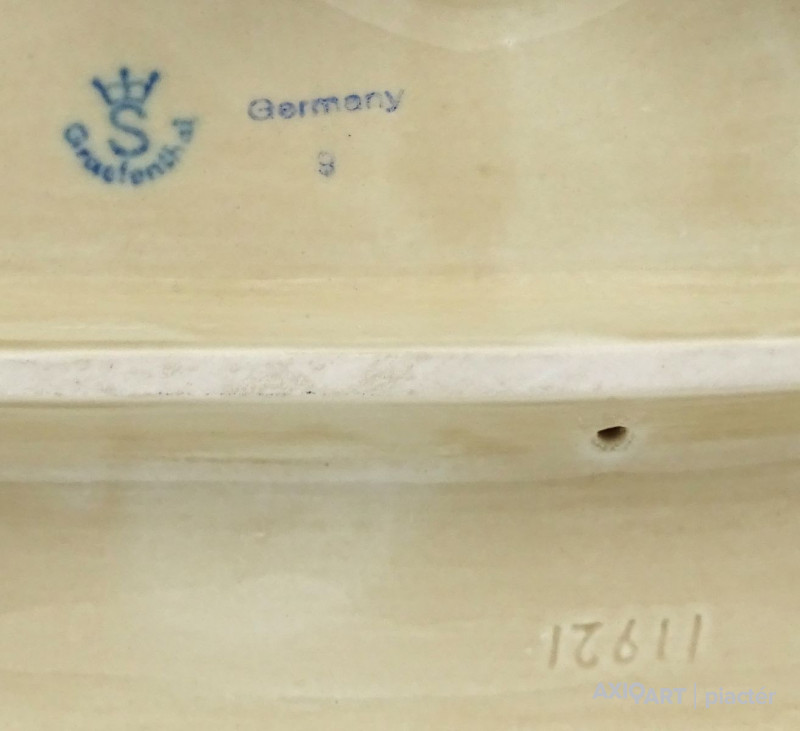 [1P886/UZ-K] Hibátlan állapotú, nagy méretű porcelán szobor pár talapzaton. Kalapos hölgy báránnyal és kalapos férfi kutyával. Alján kék koronás jelzés: S GRAEFENTHAL GERMANY Formaszám: 11921 Magasság: 31 cm Szélesség: 15.5 cm Hosszúság: 29 cm Súly: 3.115 kg