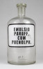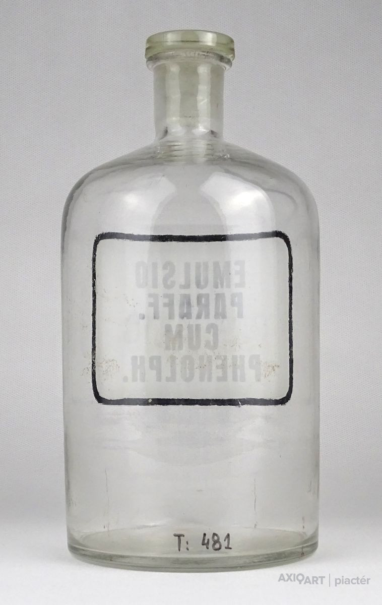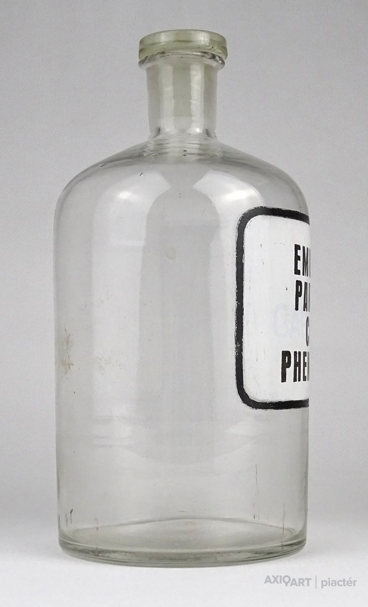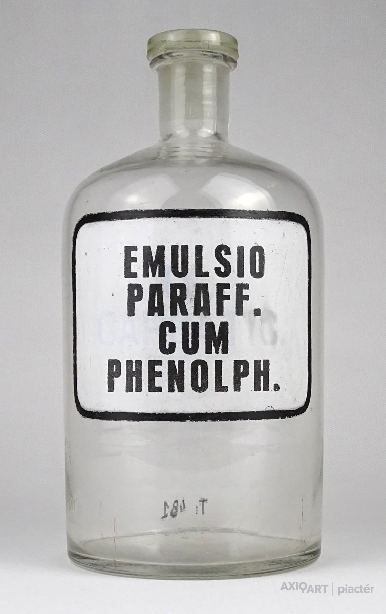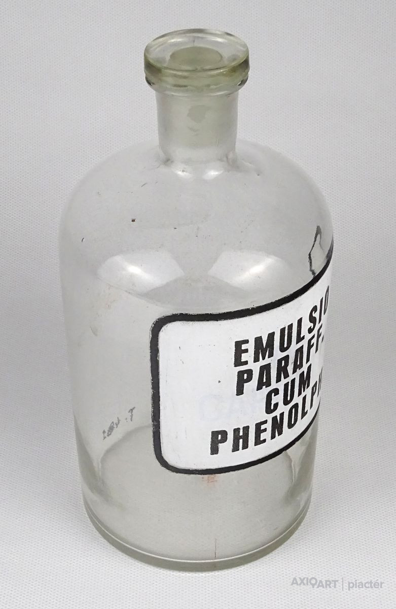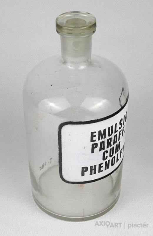[1O596/X092] Régi hibátlan állapotú gyógyszertári üveg, patikaüveg. Oldalán felirat: EMULSIO PARAFF. CUM PHENOLPH. Magasság: 20.5 cm Szélesség: 10 cm Súly: 0.52 kg   Magassága 19 cm, átmérője 7 cm. Súlya 437 g.