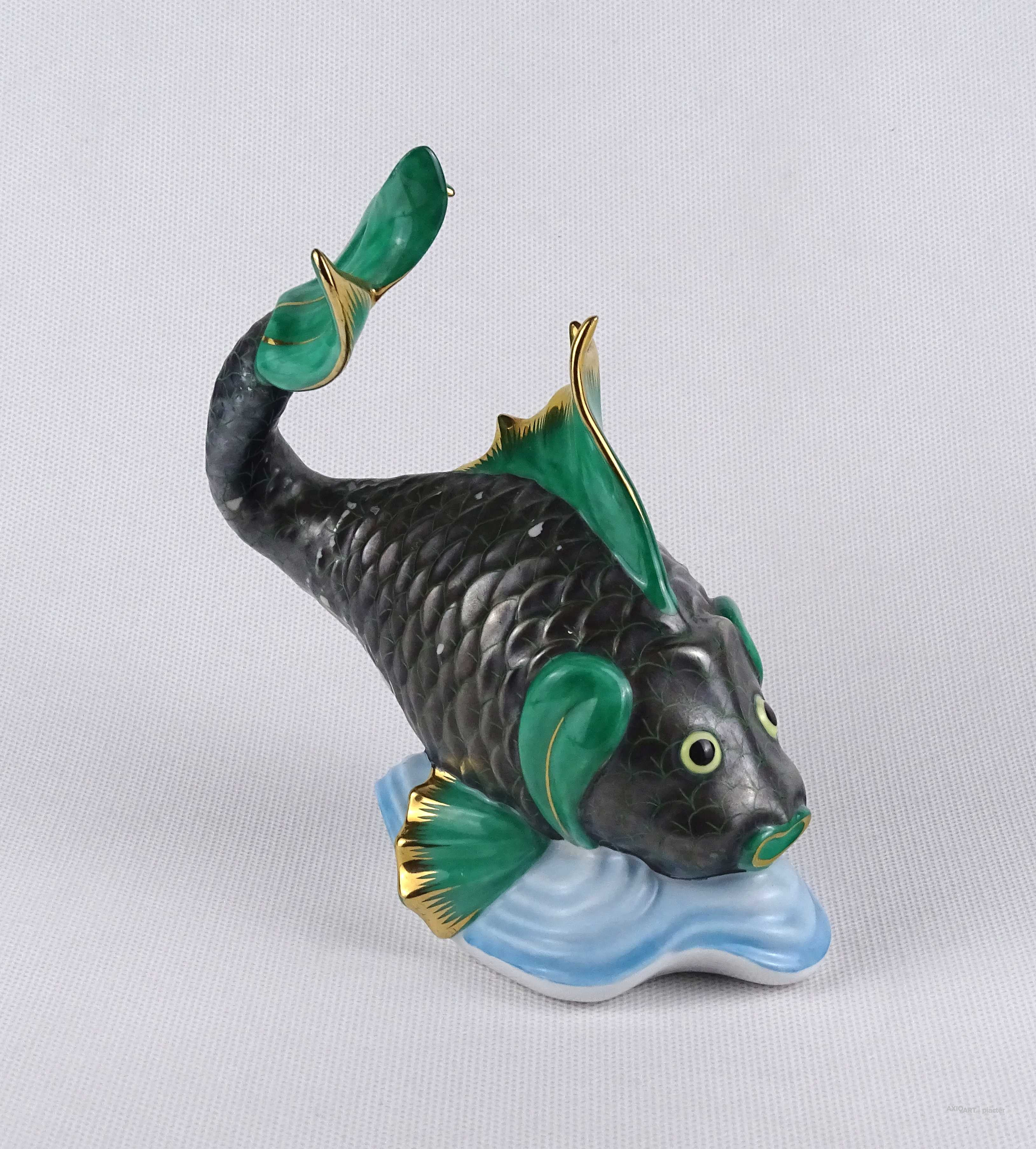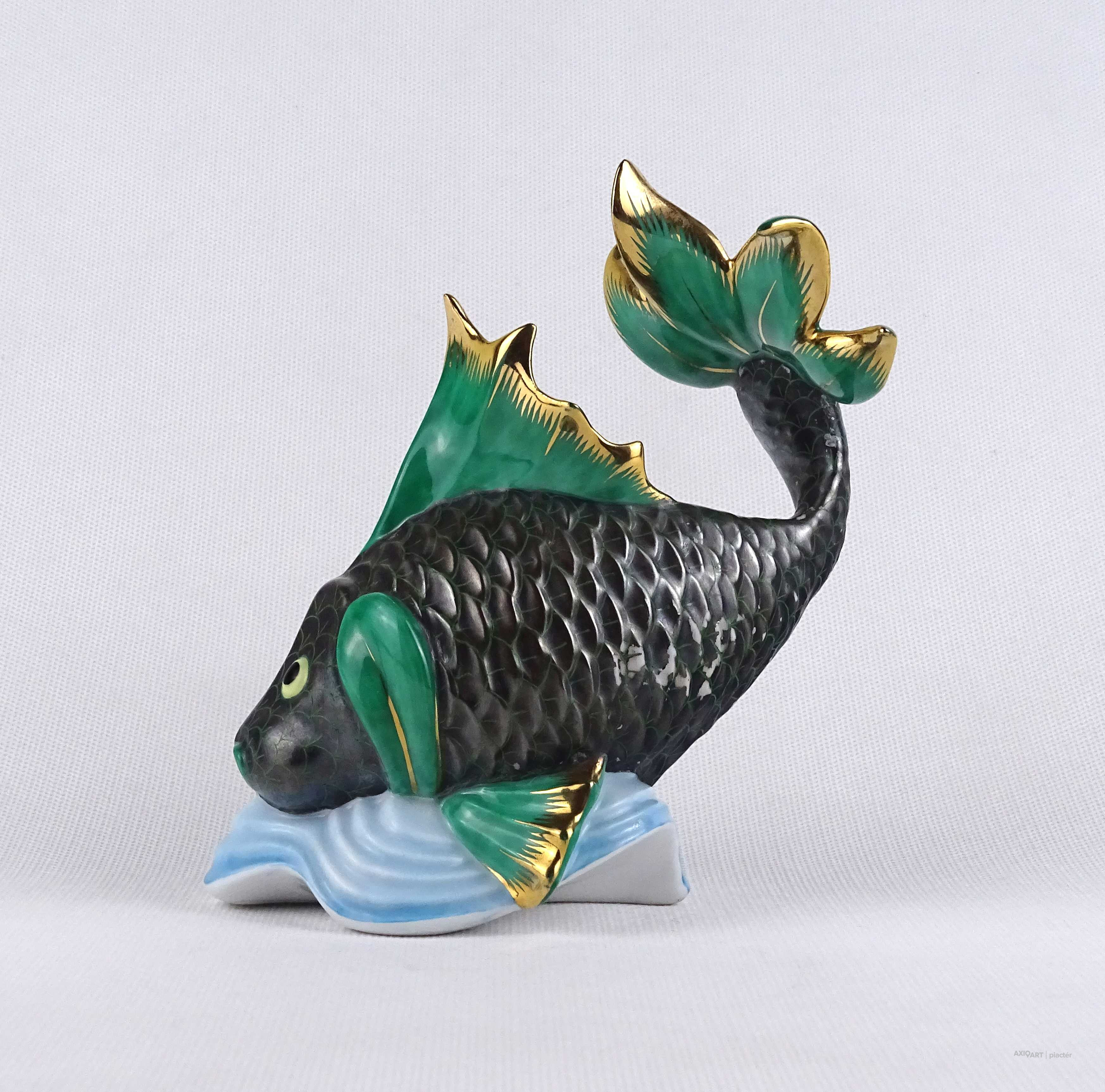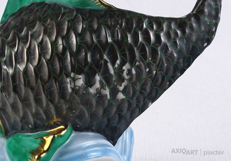 Régi nagyméretű szép állapotú, kínai mintás, jelzett Herendi porcelán hal, aranyhal talapzaton.