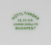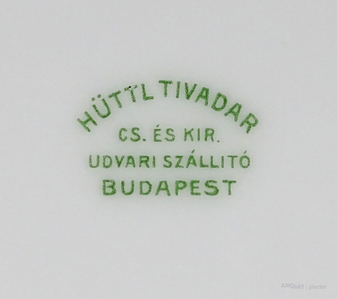 [1L490/X291] Régi jelzett nagy méretű porcelán tányér pár. Pereme aranyozott. Alján zöld jelzés: HÜTTL TIVADAR CS. ÉS KIR. UDVARI SZÁLLÍTÓ BUDAPEST Szélesség: 25.5 cm Súly: 0.85 kg Hüttl Tivadar (nagykereskedő)    Hüttl Tivadar Hüttl Tivadar mellképe id. Vastag György festménye után Született 1841. február 2. Loket Elhunyt 1910. április 4. (69 évesen) Budapest Állampolgársága Osztrák Szilézia cseh osztrák osztrák–magyar Gyermekei hat gyermek: Hüttl Tivadar Szülei „Hüttl Ede” „Bayer Katalin” Foglalkozása nagykereskedő gyáriparos Kitüntetései Ferenc József-rend Sírhelye Fiumei Úti Sírkert Id. Hüttl Tivadar (Loket, 1841. február 2. – Budapest, 1910. április 4.) porcelán- és üvegáru nagykereskedő, kereskedelmi tanácsos. 1903-ban saját porcelángyárat alapított Budapesten. A második házasságából származó ifj. Hüttl Tivadar sebész, országgyűlési képviselő, a Hüttl orvosdinasztia alapítójának édesapja.  Élete A Felső- és Alsósziléziai Hercegségben lévő Elbogen an der Eger „Deutschböhmen” városban született Hüttl Ede kereskedő és Bayer Katalin fiaként. Már édesapja is kereskedéssel foglalkozott. A család az 1850-es években települt Pestre, és 1854-ben megnyitották a Lloyd-palotában porcelán- és üvegáru kereskedésüket, ami egyúttal az elbogeni Heldingler testvérek porcelángyárának helyi képviselete is volt. Hüttl tivadar az Országos Iparegyesület igazgatósági tagjai között 1893-ban. Hüttl Tivadar porcelánboltjának reklámja az Ország-Világ 1907. Először porcelán lerakatot hoztak létre Óbudán, majd festették a porcelánt, ezt követően kezdett porcelángyártássál foglalkozni. A császári és királyi szállító címet is megszerezte. Szállított porcelánt Ferenc József uralkodónak, a magyar parlamentnek, az uralkodó tisztikarának. Az ő gyára lett az Aquincum Porcelángyár Óbudán, ugyanis az ő gyárát is államosították. Számtalan neves orvos került ki a családjából. Két házassága volt, első felesége Bayer Franciska, akit 1868. április 19-én vett feleségül a budapesti Szent István-bazilikában, s akitől később megözvegyült. Második felesége Steudemann Johanna Erzsébet, akivel 1883. október 9-én kötött házasságot szintén a budapesti Szent István-bazilikában. Tagja és vezetője volt a Budapesti Ipar- és Kereskedelmi Kamarának is. Halálát érelmeszesedés okozta.