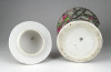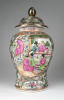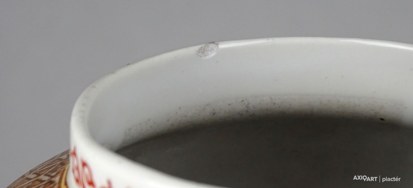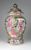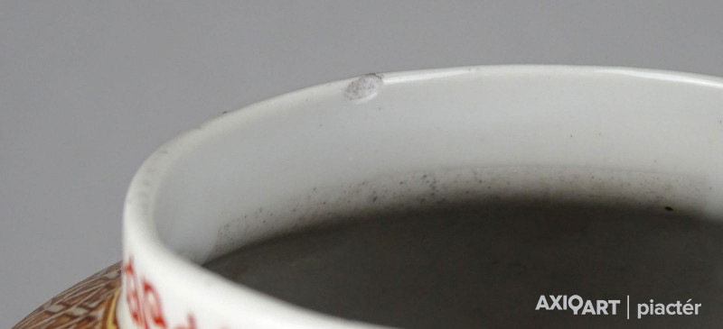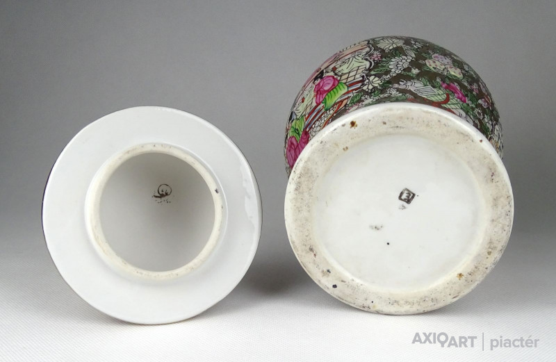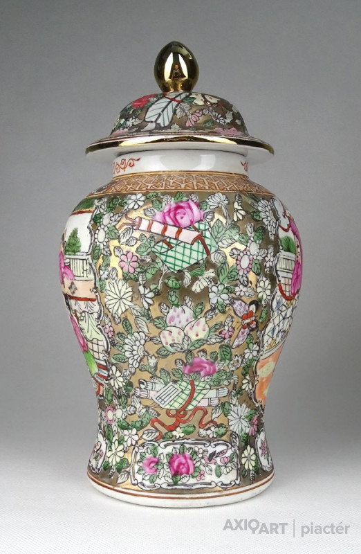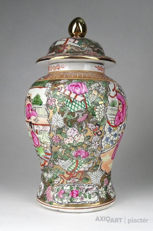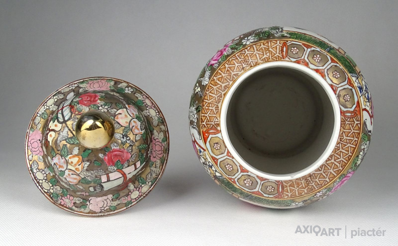 Szép állapotú keleti, japán motívumokkal gazdagon díszített porcelán váza, fedeles váza, urnaváza. Oldalán kézi festésű teljes felületen megjelenő színes hat alakos díszítés. A tető fogója aranyozott. A váza szájának belső peremén kisebb lepattanás található, lásd fotó.