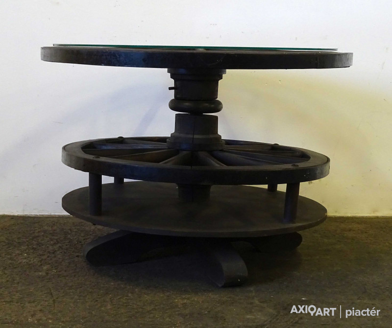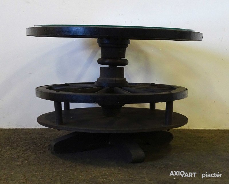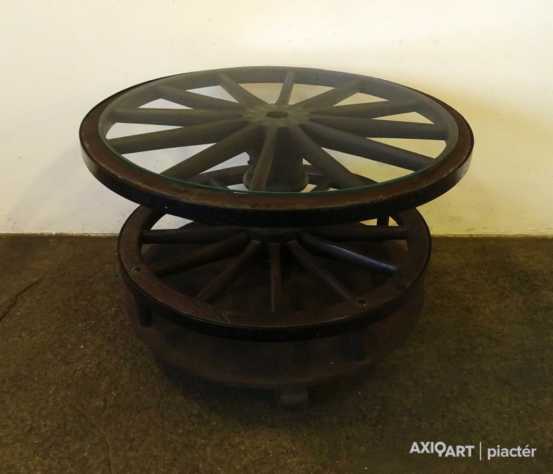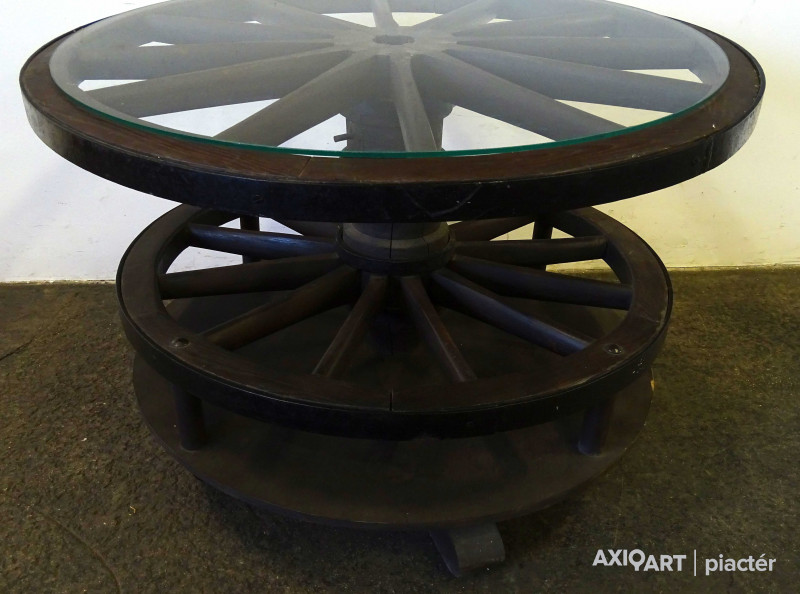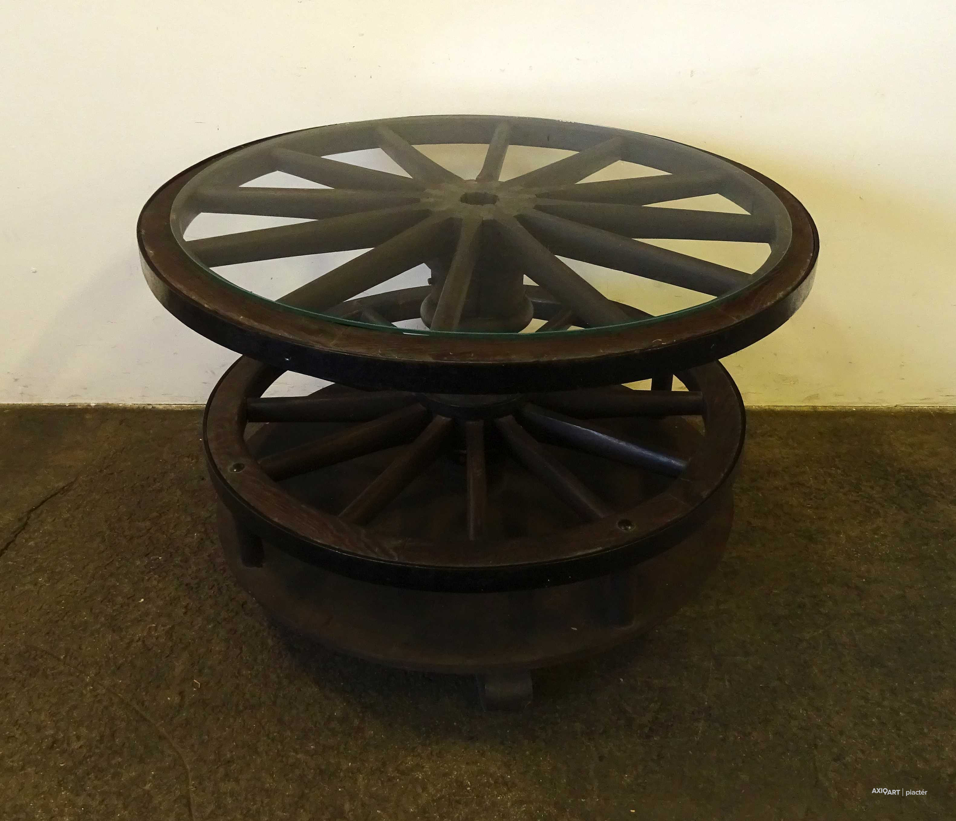Szép állapotú, nagy méretű, régi szalonasztal, körasztal. Kocsikerekekből készült asztal, tetején üveglap található. Az asztallap alatt lévő kocsikerék forgatható. Italtartóként használható, 12 részre osztott tárolóval rendelkezik.
