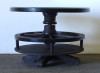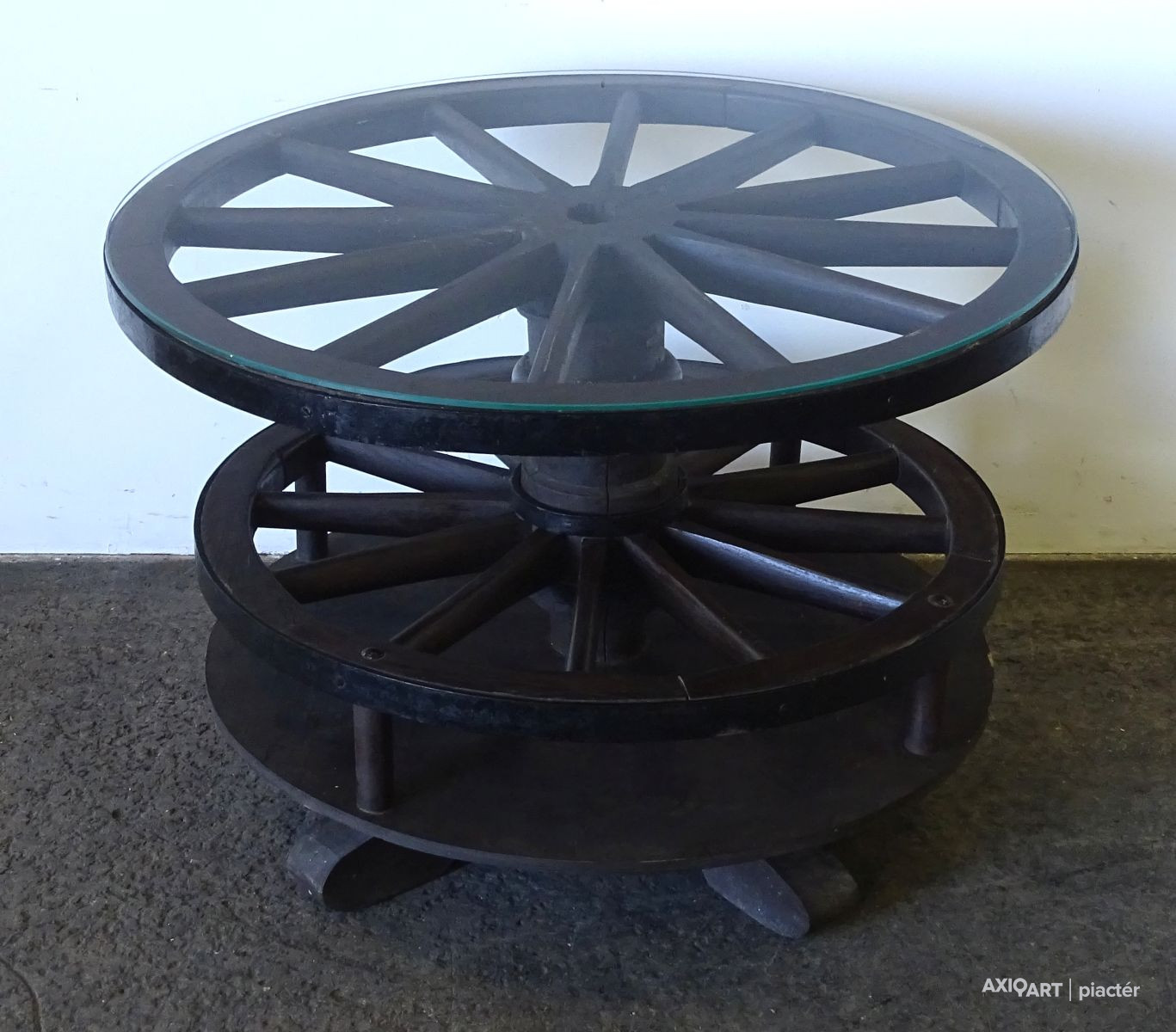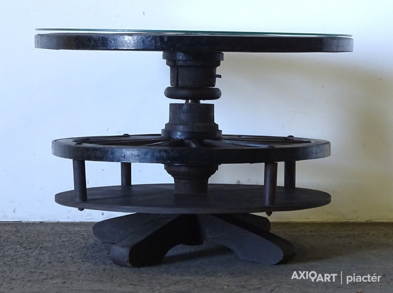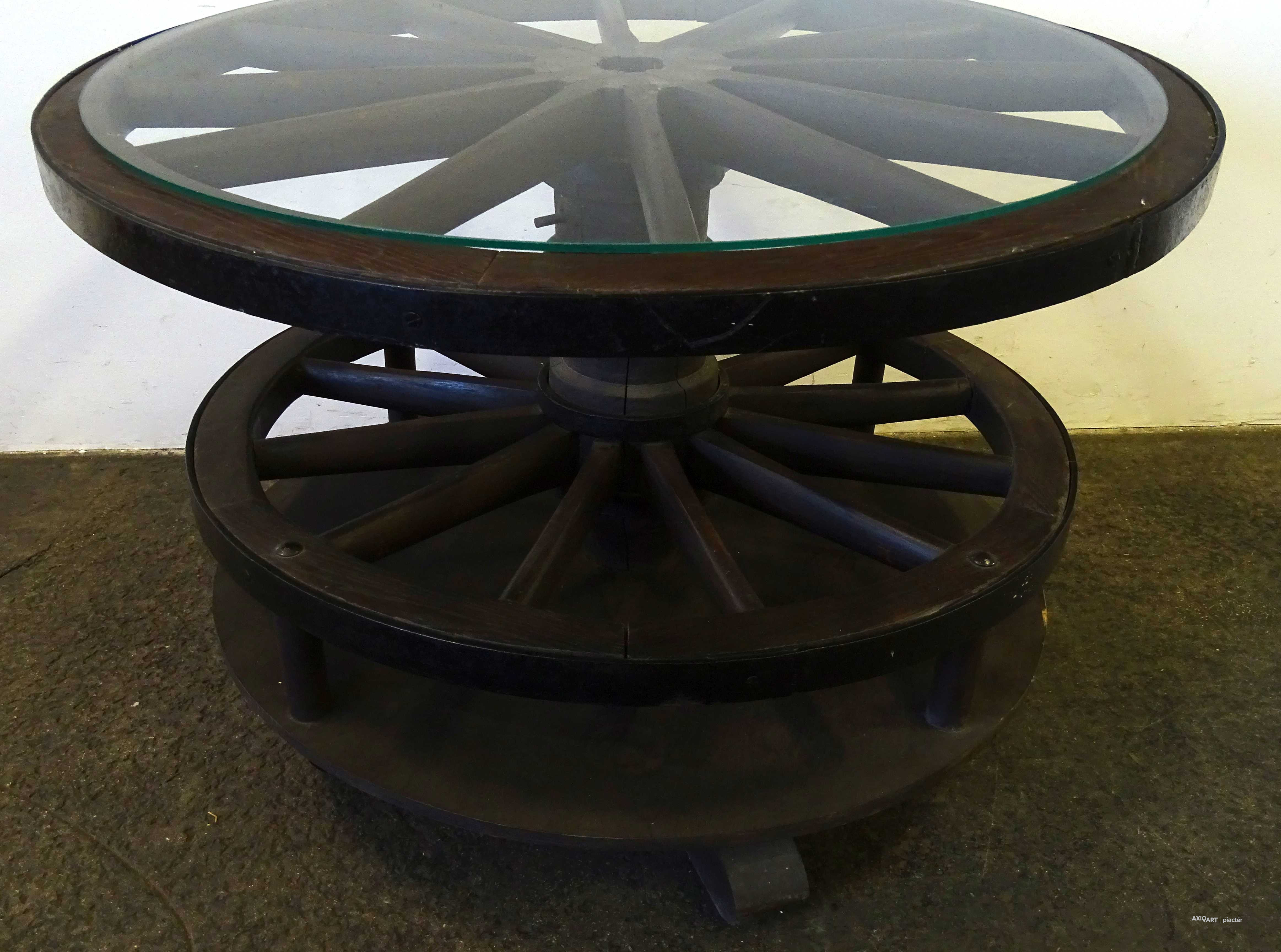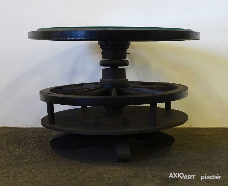 Szép állapotú, nagy méretű, régi szalonasztal, körasztal. Kocsikerekekből készült asztal, tetején üveglap található. Az asztallap alatt lévő kocsikerék forgatható. Italtartóként használható, 12 részre osztott tárolóval rendelkezik.