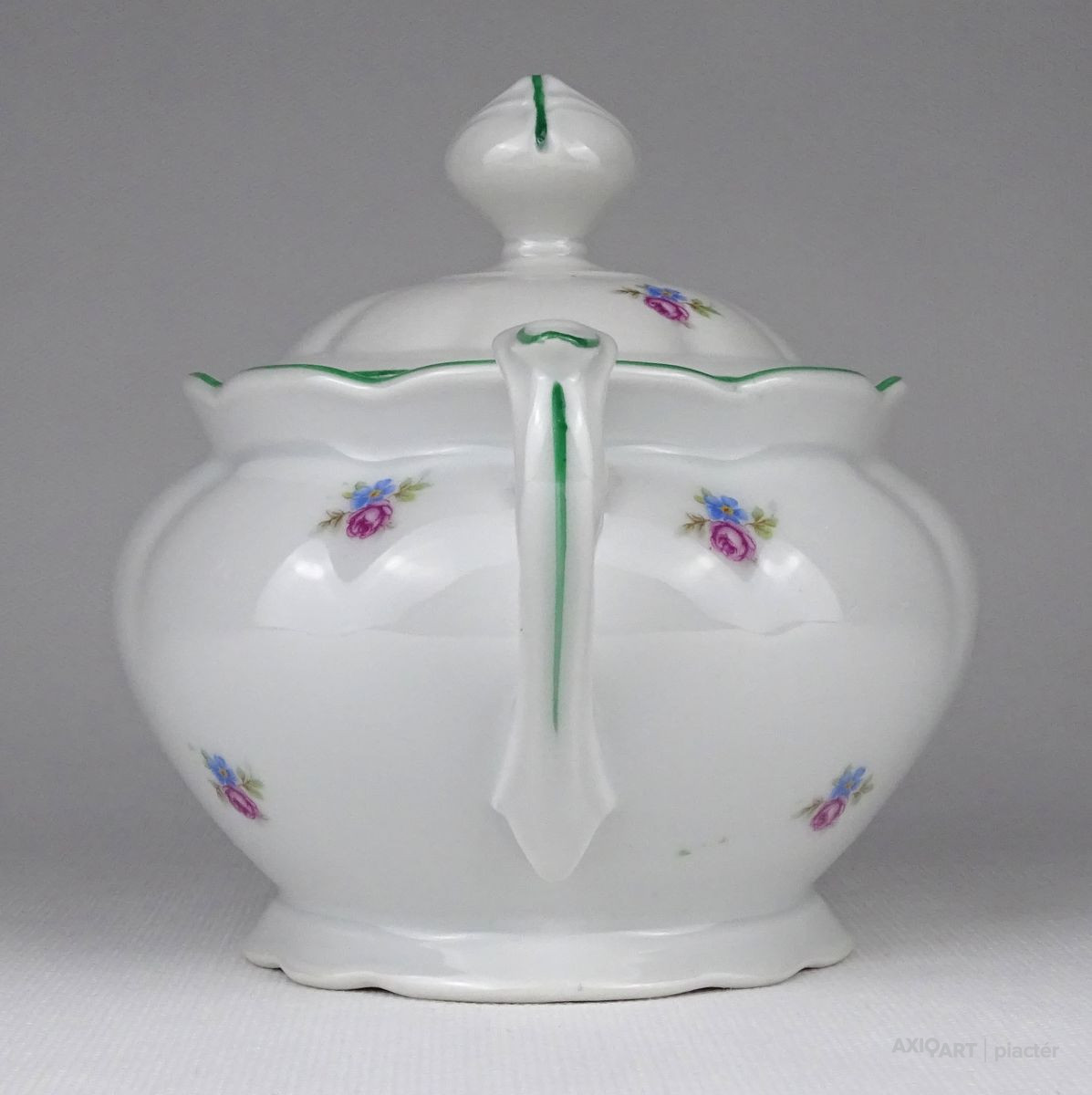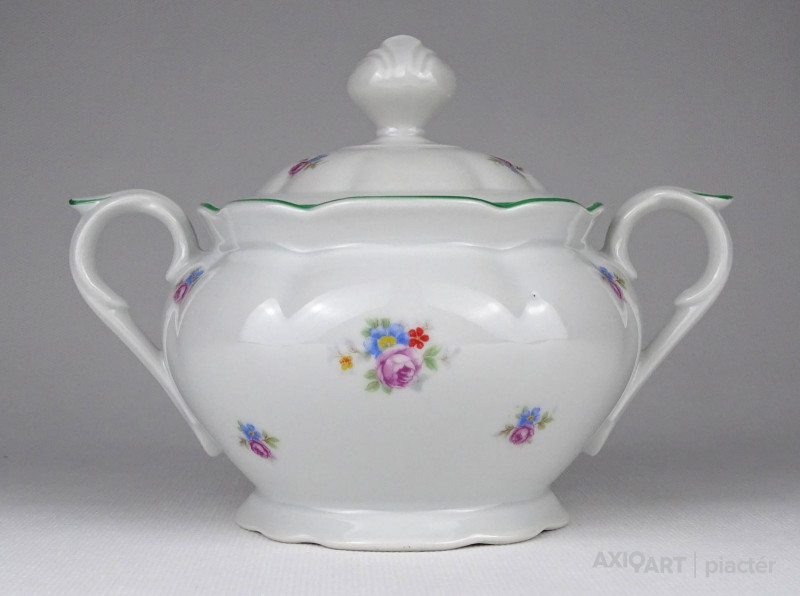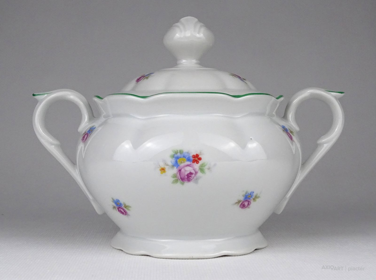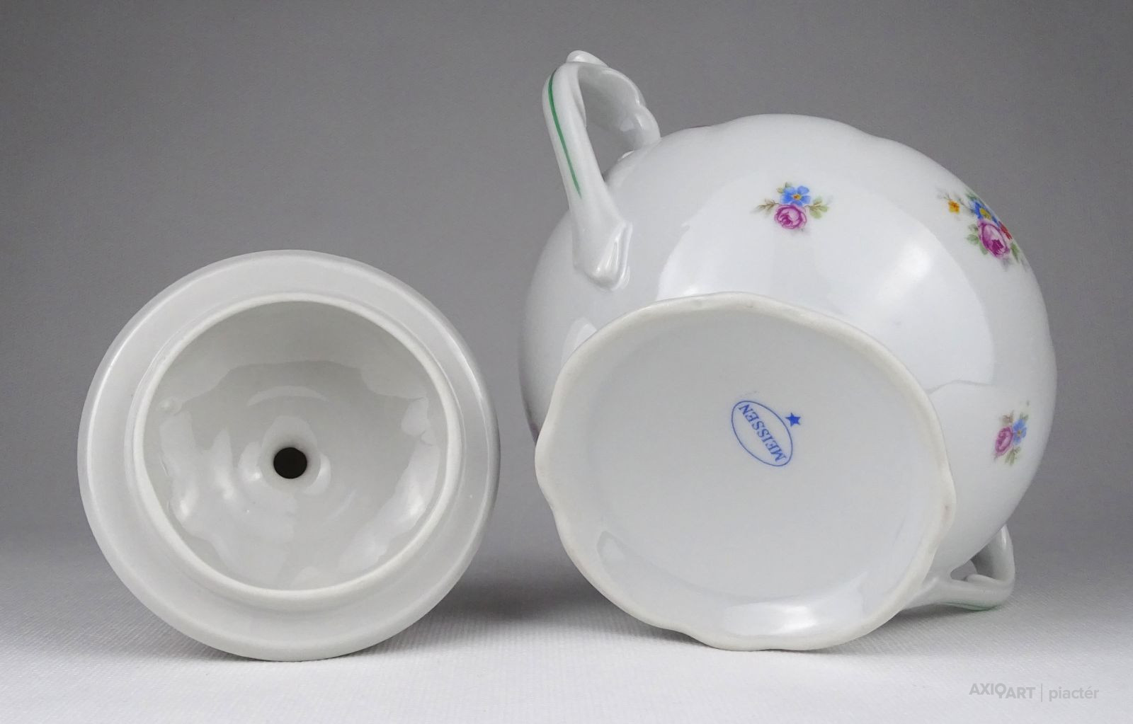 Hibátlan állapotú, jelzett, nagy méretű, virágmintával díszített Meisseni porcelán cukortartó, cukorkínáló bonbonier.
