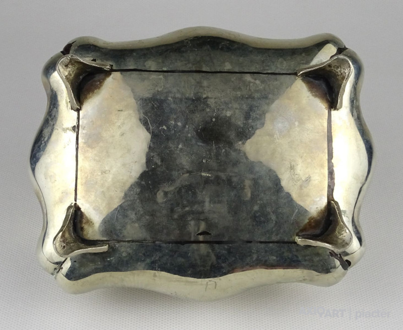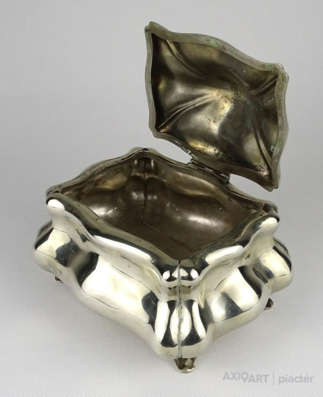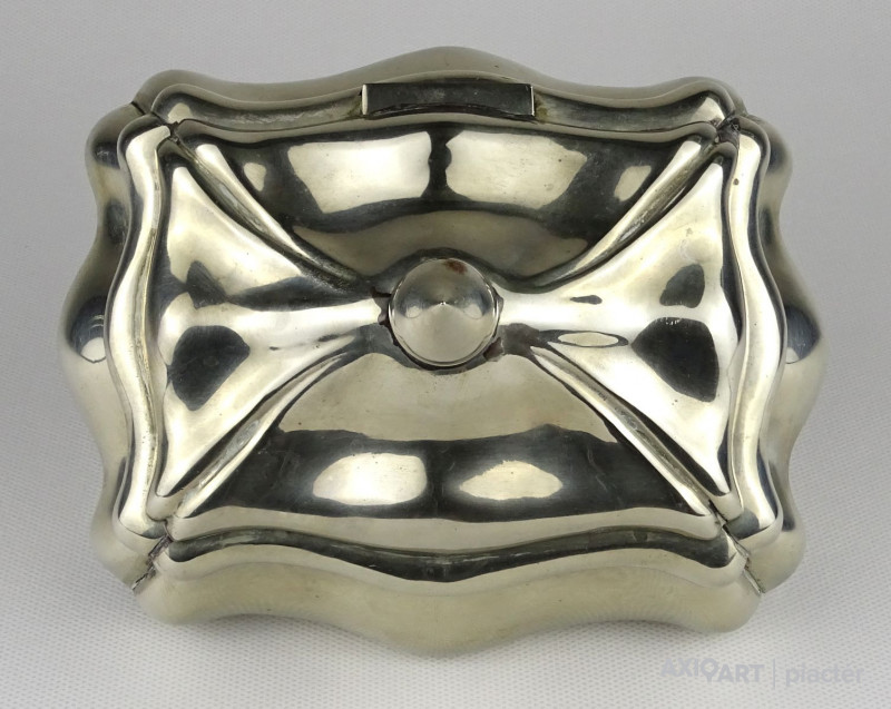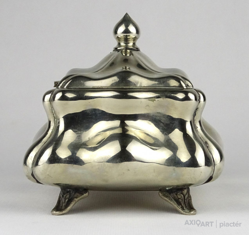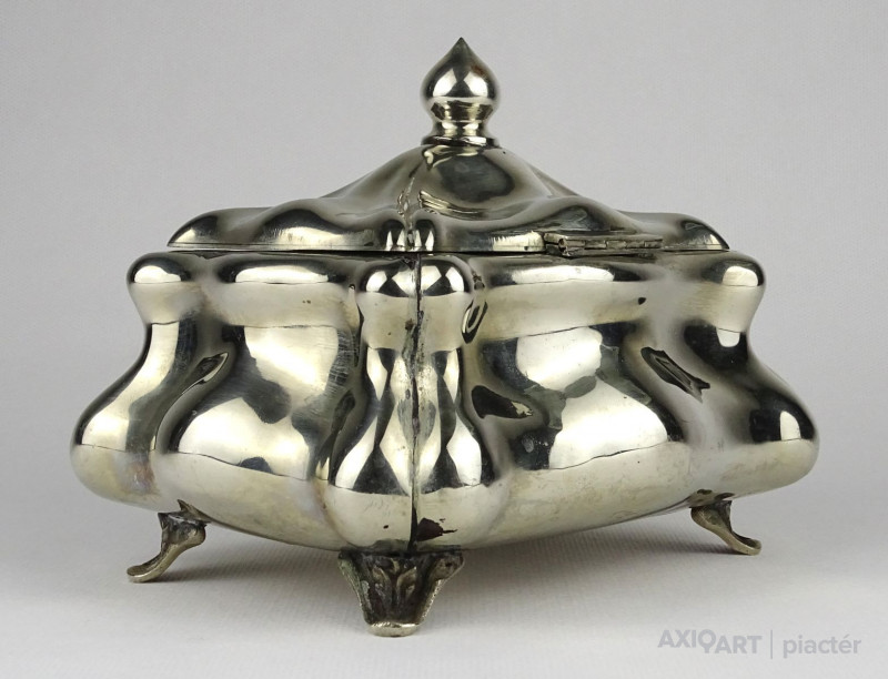 Régi, gyönyörű, nagy méretű jelzett alpakka bonbonier. Tetején hagymakupolás fogó található. Erős zsanérral rendelkezik.