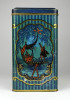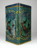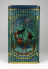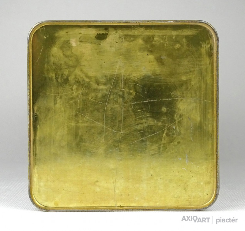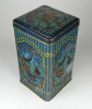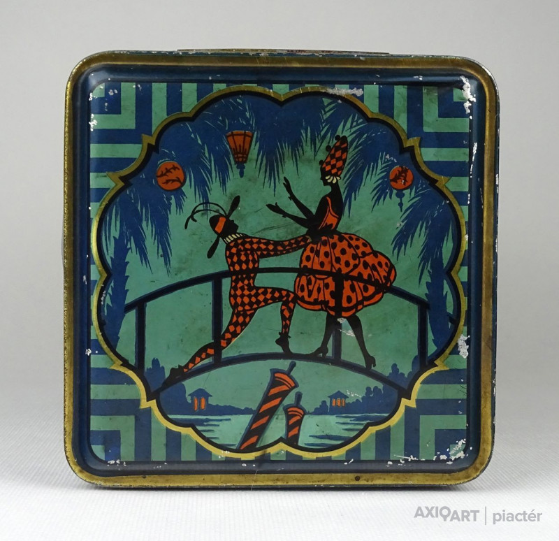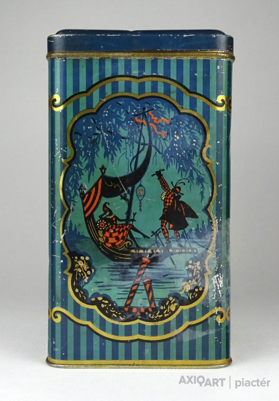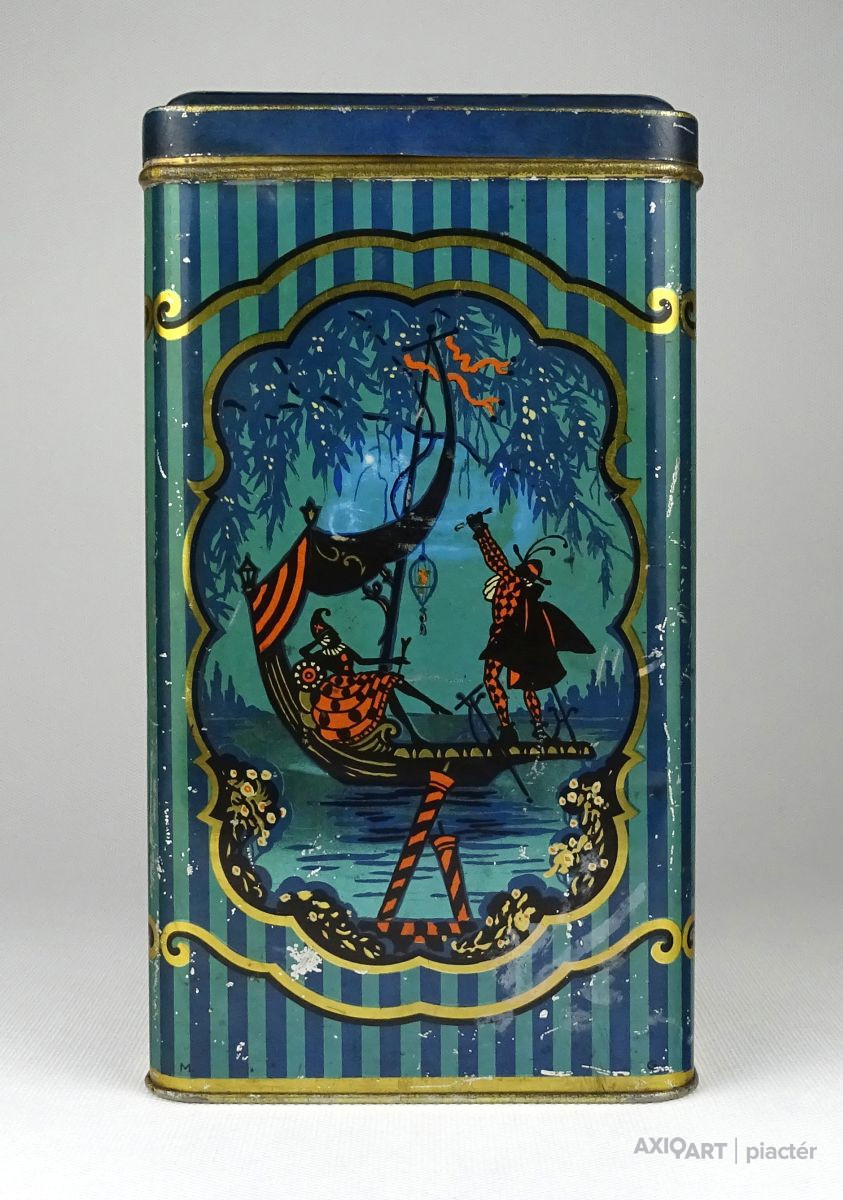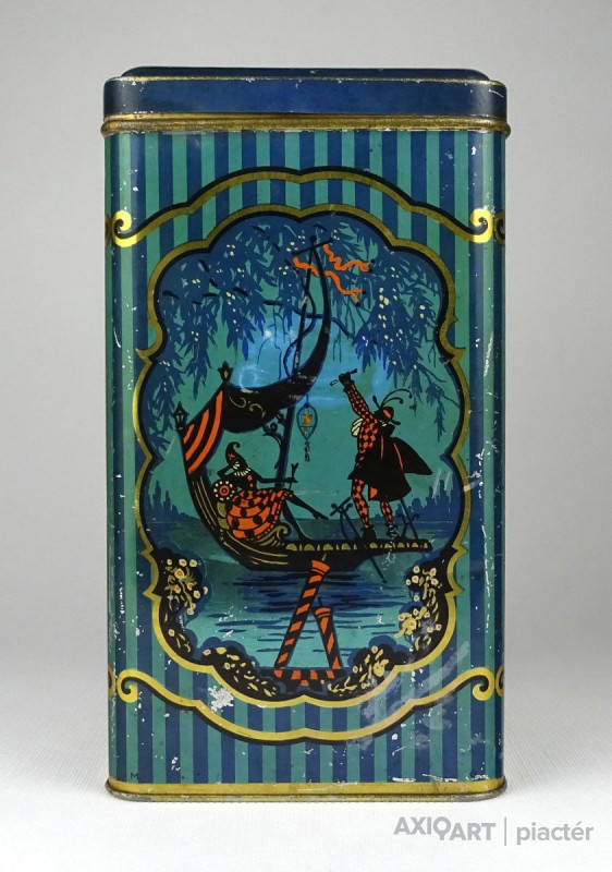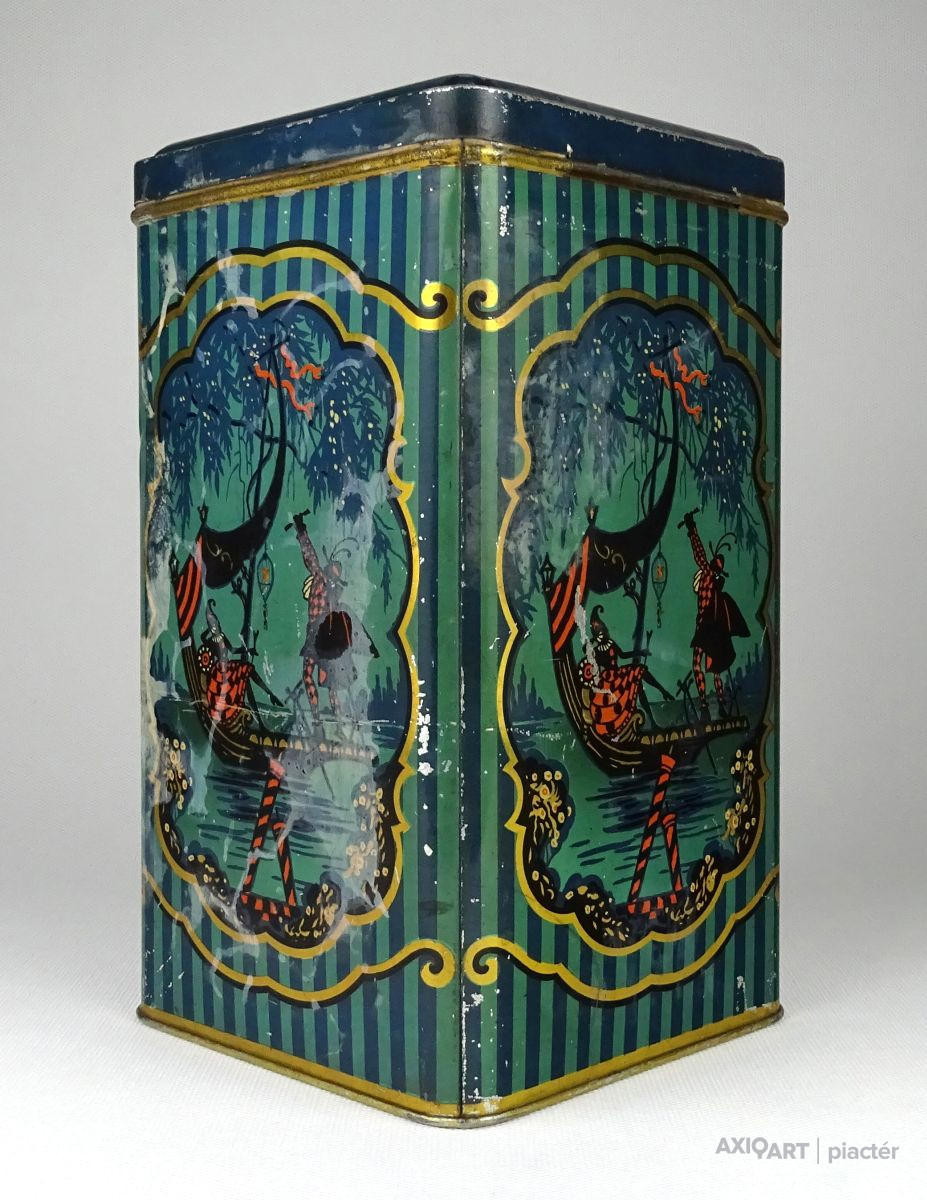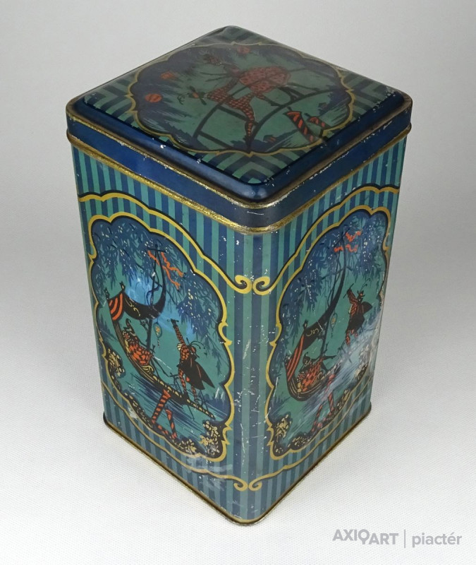 [1Q631/X007] Régi, szép állapotú, nagy méretű teás pléhdoboz, tároló, oldalán körben kétalakos díszítésekkel. Magasság: 23.5 cm Szélesség: 13 cm Súly: 0.375 kg