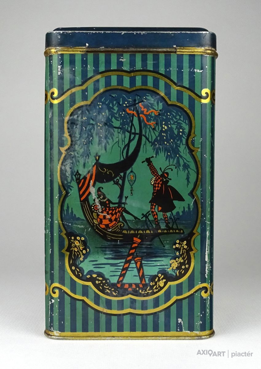 Régi, szép állapotú, nagy méretű teás pléhdoboz, tároló, oldalán körben kétalakos díszítésekkel.