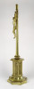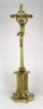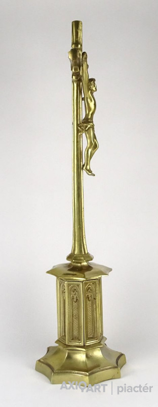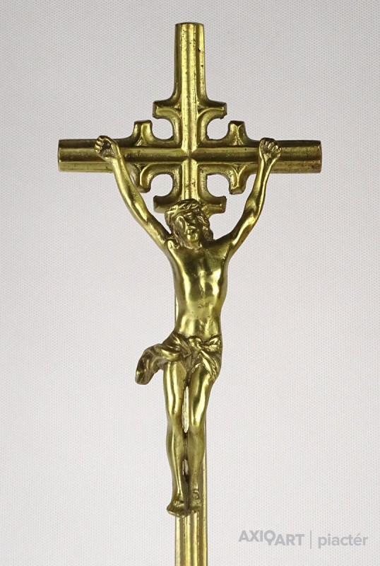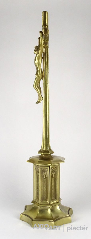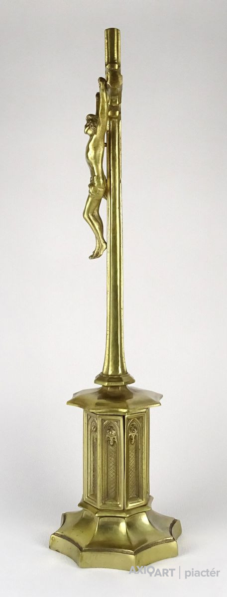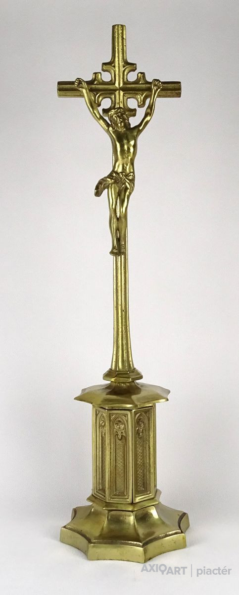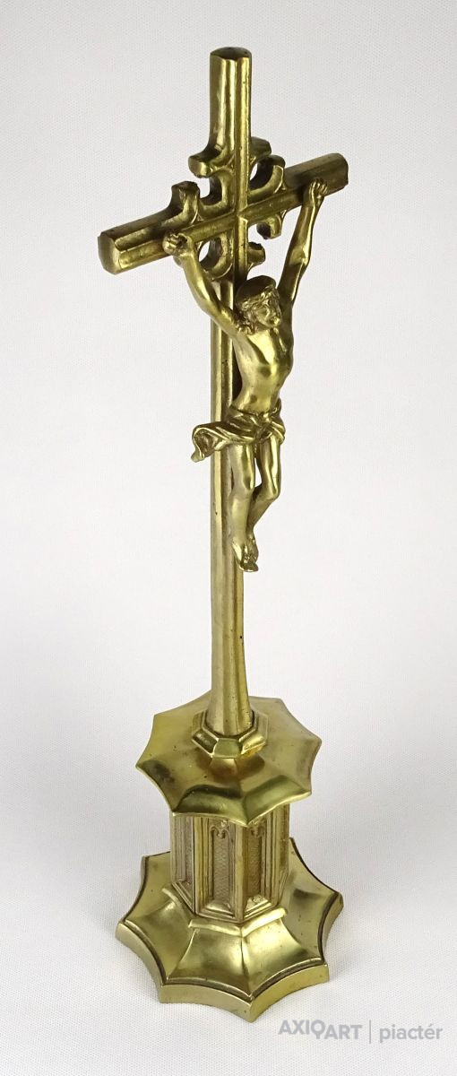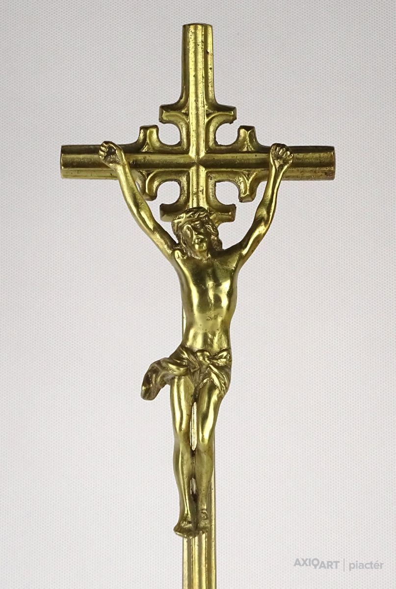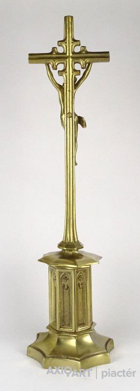 Hatalmas méretű hibátlan állapotú sárgaréz feszület, rajta keresztre feszített Jézus. Gyönyörű nyolc kazettás historizáló gótikus talapzaton áll. Liturgikus, vallási kegytárgy.