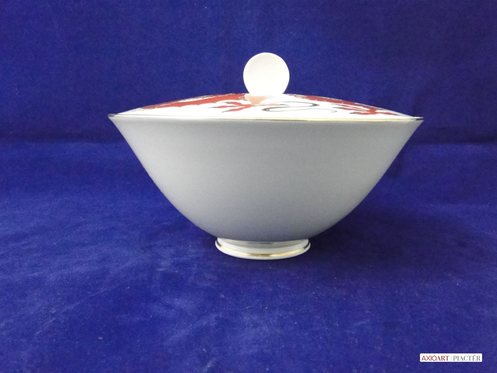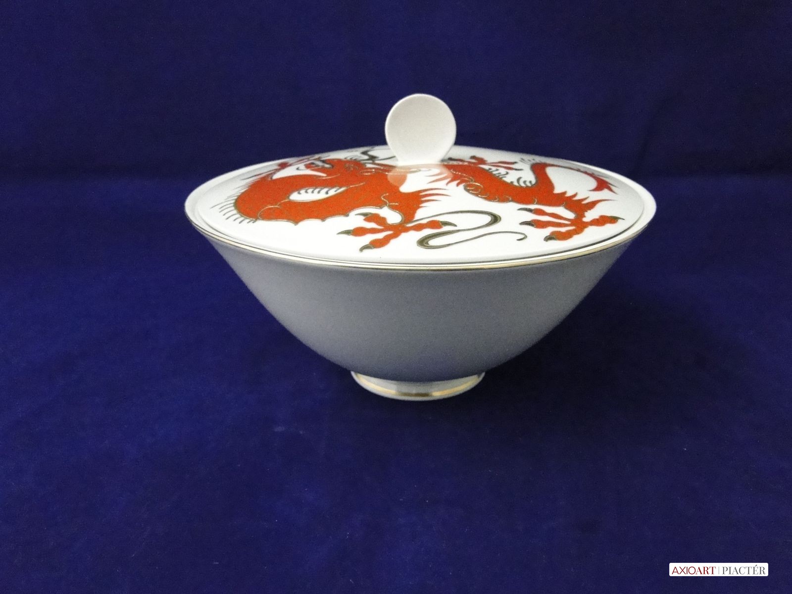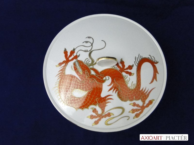 [7866/X112] Régi extra nagyméretű hibátlan állapotú gyönyörűen, arannyal gazdagon díszített sárkányos porcelán bonbonier. Alján koronás márkajelzés: 1764 Magasság: 13 cm Szélesség: 20 cm Súly: 0.745 kg