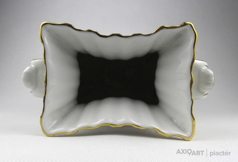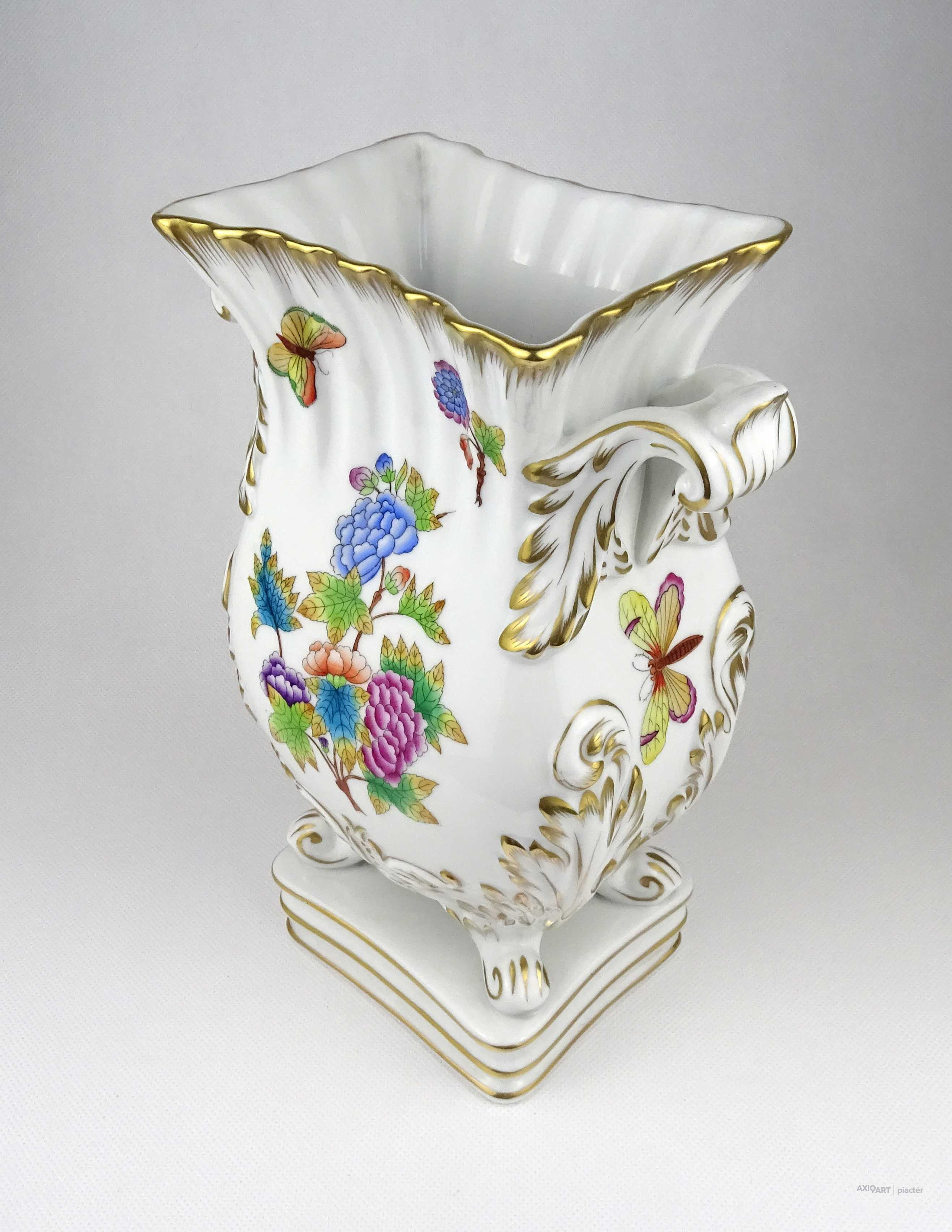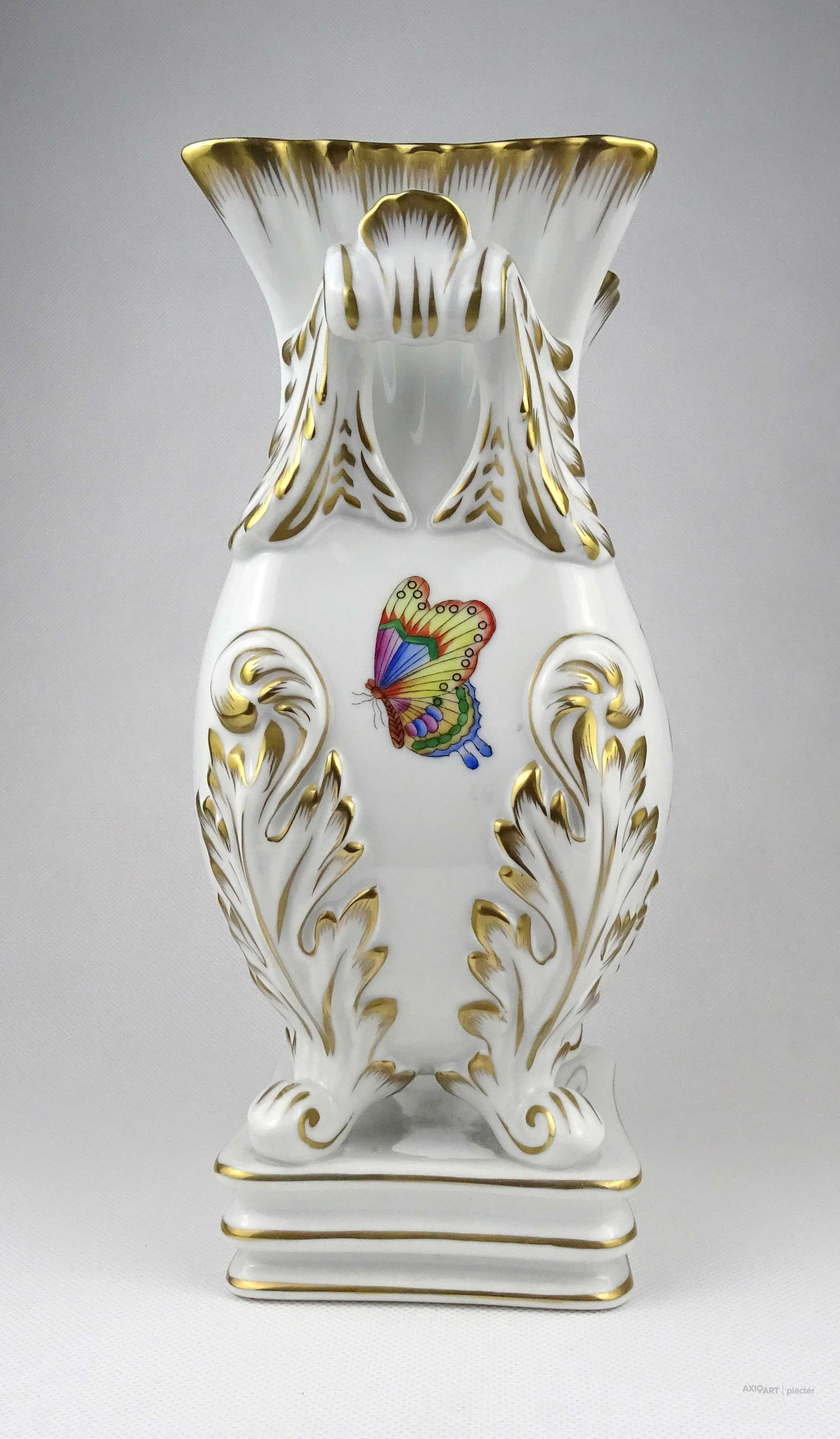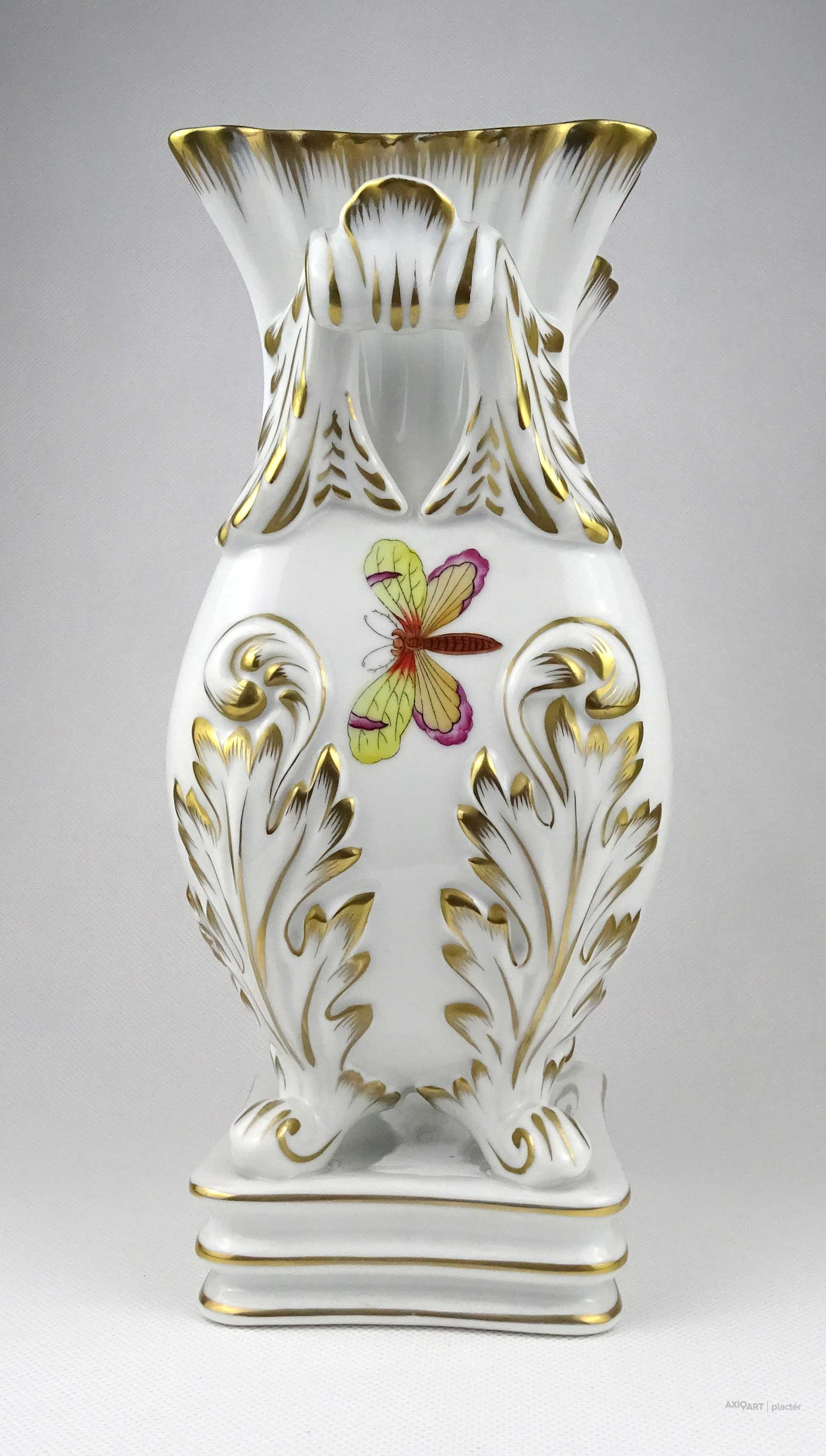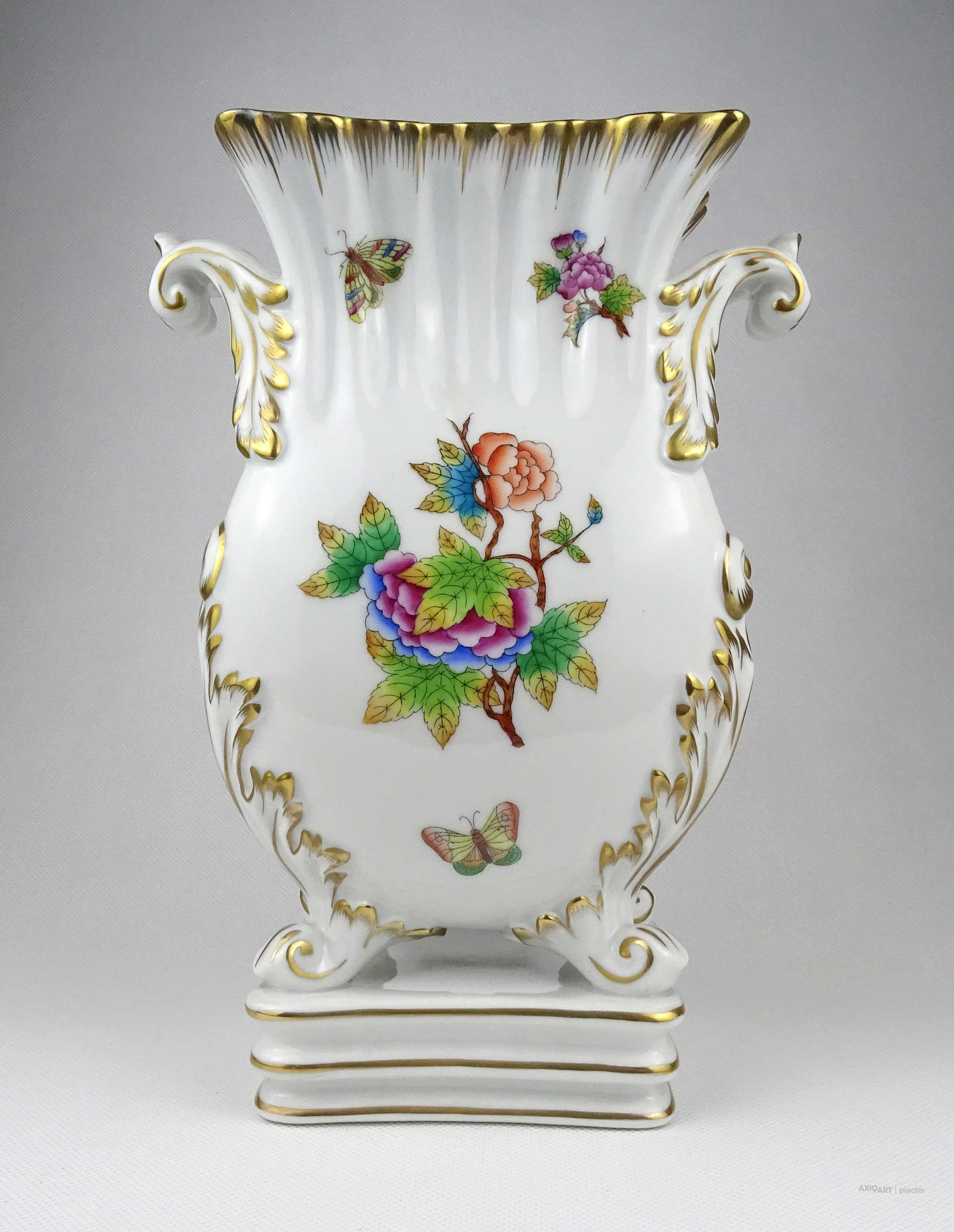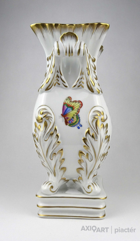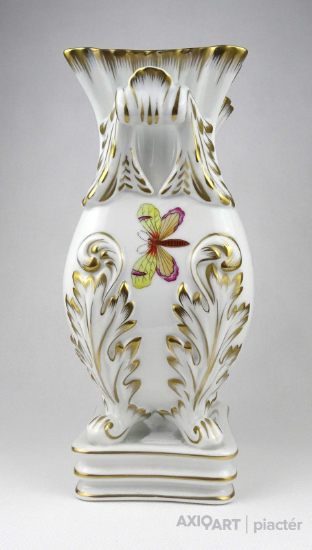 Régi négyszög alakú Viktória mintás Herendi porcelán füles díszváza 26.5 cm