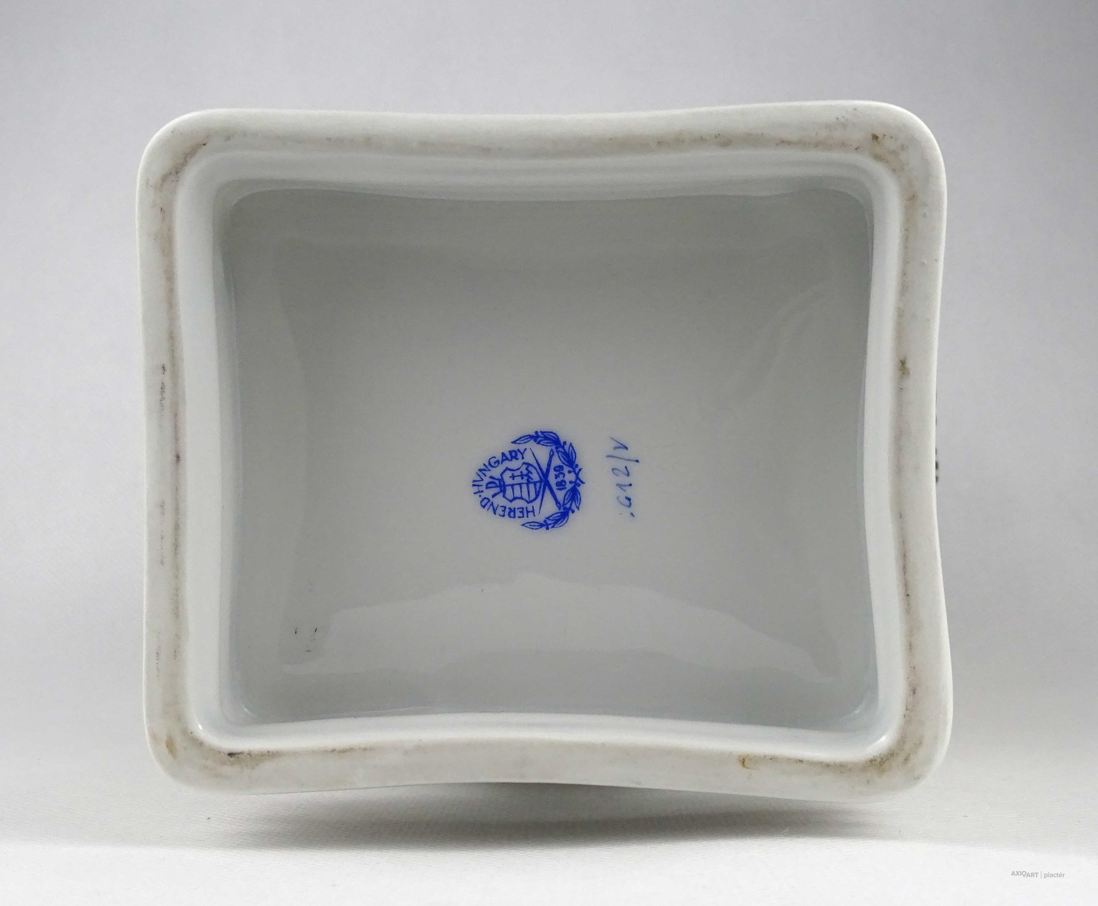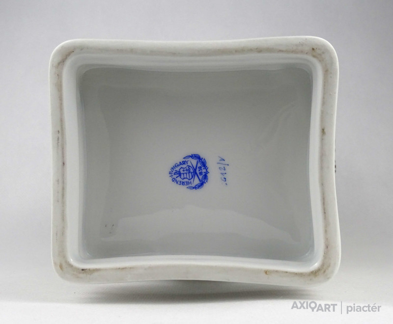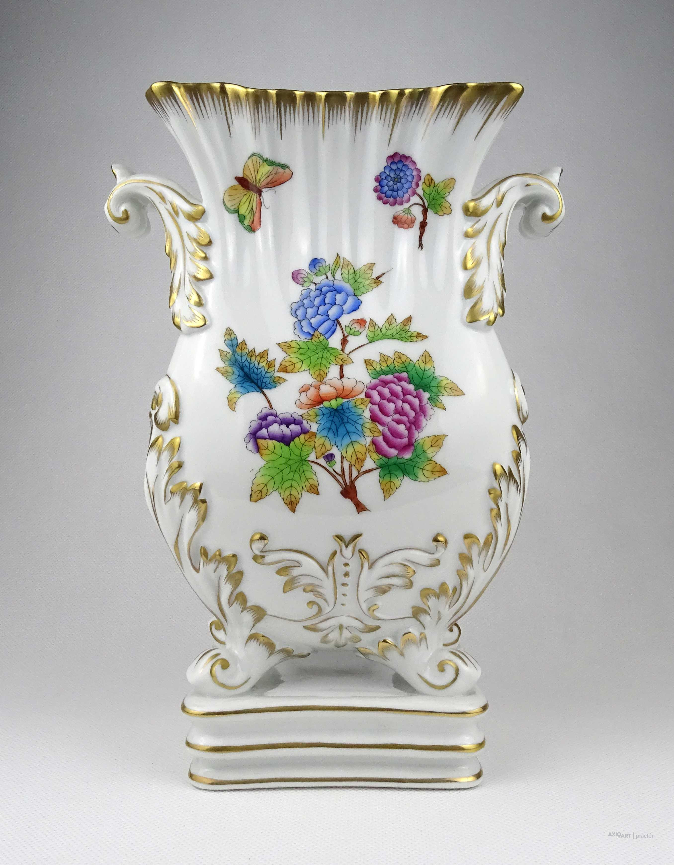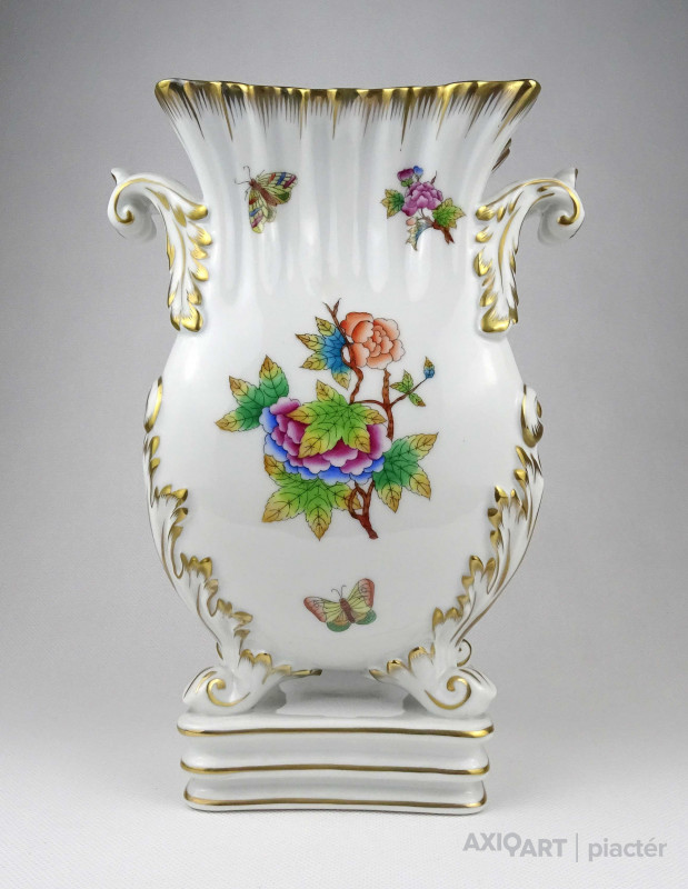 [1Y269/Z008] Hibátlan állapotú, jelzett, négyszög alakú talapzaton álló Viktória mintás Herendi porcelán váza, díszváza. Alján kék Herendi márkajelzés: HEREND HUNGARY 1839 Formaszám kékkel: 6612/V Mélynyomással: HEREND Magasság: 26.5 cm Szélesség: 19 cm Hosszúság: 12.5 cm Súly: 1.615 kg