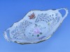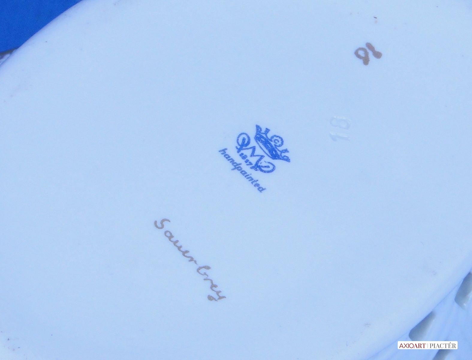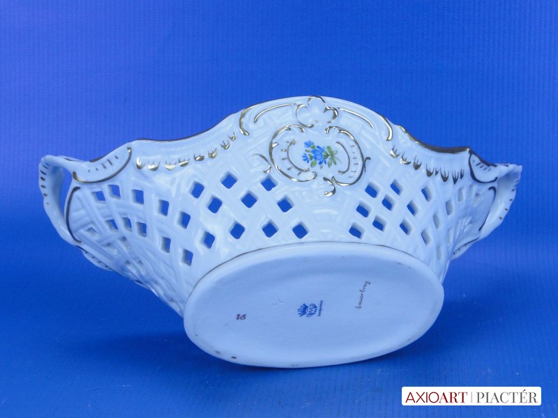 [0D492/X025] Hibátlan állapotú régi, gazdagon aranyozott, áttört német porcelán kosár, barokkos fülekkel. Külső és belső részén kézi festésű virágmintákkal díszítve. Azonnal ajándékba adható, aranyozása kopásmentes. Alján kék koronás márkajelzés: PMP 1817 HANDPAINTED PORZELLAN MANUFAKTUR PLAUE ( PMP ) THURINGIA Alatta arany színnel felirat: SAUERBREY 16 Mélynyomással formaszám: 18 Magasság: 9 cm Szélesség: 13 cm Hosszúság: 23 cm Súly: 0.288 kg