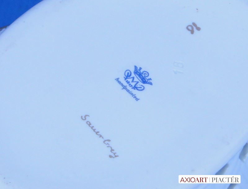 [1T504/Z040] Régi, hibátlan állapotú, talapzaton álló, szépen kidolgozott porcelán bohóc figura. Ritkán előforduló darab. Alján zöld koronás márkajelzés: ROSENTHAL SELB - BAVARIA Talapzaton formatervező neve: FRED. LIEBERMANN (Ferdinand Liebermann - Sculptor - szobrász, a Rosenthal legfontosabb, legnevesebb tervezője) Magasság: 15 cm Szélesség: 11.5 cm Súly: 0.205 kg   Ferdinand Liebermann Ferdinand Liebermann (1883–1941), the son of a toy manufacturer, was a German sculptor. He studied at the Munich School of Arts and Crafts and the Art Academy. After taking study trips to Rome and Paris, he opened a studio in 1910 in Munich. In the same year he received the Great Austrian Golden State Medal for a small bronze sculpture. Several exhibitions followed. He became one of the most important designers for the porcelain manufacturer Rosenthal AG. Liebermann’s work-spectrum encompasses bronze sculpturing, monumental sculpturing and memorials. In 1926 he received the professor title for monumental and portrait sculpturing in Munich.  After 1933, Liebermann  produced at the orders of the Nazi party 32 busts of Hitler (all 1½ life size), one of which was a commission from the city of Munich for the city hall. In appreciation he was made city councillor of the Capital of the Movement, the 'Haupstadt der Bewegung'. Liebermanns Führerbust was displayed at the XIX Venice Biennale 1934 ('Cancelliere del Reich Adolf Hitler') and also at the GDKs of 1937, 1938 and in the Münchener Kunstausttellungen 1934, 1940 and 1941. It is said that the busts designed by Liebermann were favoured by the German leader over all the others.  His sculpture 'L'Abbandoro' ('Abandoned') was displayed at the XIV Biennale 1924 in Venice; ‘Erhebung’ (‘Elevatione’ or ‘Elevation’) was displayed at the XIX Venice Biennale 1934 and later again at the GDK 1937, room 9. In 1938 his bronze ‘Abwehr’ (‘Defence’ or 'Ripulso') was displayed at the XXI Venice Biennale. Liebermann also completed a bronze bust of Hitler's half-niece Geli Raubal, who had shot herself in Hitler’s apartment in 1931. From this bust Hitler had numerous copies made for display in his residences.  At the Great German Art Exhibitions Ferdinand Liebermann was represented with 16 works, among them the two Hitler busts, the relief 'Wille’ (design for the Freikorps-monument), a bust of Riechsleiter Alfred Rosenberg, Reichsleiter Amann and two 'Kampf' sculptures.  In 1941, the year of his death, he created the massive sculpture for the  Freikorpsdenkmal in Munich. In the possession of the Bayerische Staatsgemäldesammlungen are the following works: 'Eva' (GDK 1939 room 35), 'Abwehr', 'In Erwartung', Frisches Lachen', 'Paolo', 'Rhythmus' and 'Knabe auf einem Waller reitend'. A copy of 'Eva' in bronze (72 cm high) was displayed at the exhibition ‘Kunst im 3. Reich, Dokumente der Unterwerfung’; the exhibition, instigated by the Frankfurter Kunstverein, was held from 1974 to 1975 in Frankfurt, Hamburg, Stuttgart, Ludwigshafen and Wuppertal.Ferdinand Liebermann: Ferdinand Liebermann: (1883–1941), the son of a toy manufacturer, was a German sculptor. He studied at the Munich School of Arts and Crafts and the Art Academy. After taking study trips to Rome and Paris, he opened a studio in 1910 in Munich. In the same year he received the Great Austrian Golden State Medal for a small bronze sculpture. Several exhibitions followed.r He became one of the most important designers for the porcelain manufacturer Rosenthal AG. Liebermann’s work-spectrum encompasses bronze sculpturing, monumental sculpturing and memorials. In 1926 he received the professor title for monumental and portrait sculpturing in Munich.  After 1933, Liebermann  produced at the orders of the Nazi party 32 busts of Hitler (all 1½ life size), one of which was a commission from the city of Munich for the city hall. In appreciation he was made city councillor of the Capital of the Movement, the 'Haupstadt der Bewegung'. Liebermanns Führerbust was displayed at the XIX Venice Biennale 1934 ('Cancelliere del Reich Adolf Hitler') and also at the GDKs of 1937, 1938 and in the Münchener Kunstausttellungen 1934, 1940 and 1941. It is said that the busts designed by Liebermann were favoured by the German leader over all the others.  His sculpture 'L'Abbandoro' ('Abandoned') was displayed at the XIV Biennale 1924 in Venice; ‘Erhebung’ (‘Elevatione’ or ‘Elevation’) was displayed at the XIX Venice Biennale 1934 and later again at the GDK 1937, room 9. In 1938 his bronze ‘Abwehr’ (‘Defence’ or 'Ripulso') was displayed at the XXI Venice Biennale. Liebermann also completed a bronze bust of Hitler's half-niece Geli Raubal, who had shot herself in Hitler’s apartment in 1931. From this bust Hitler had numerous copies made for display in his residences.  At the Great German Art Exhibitions Ferdinand Liebermann was represented with 16 works, among them the two Hitler busts, the relief 'Wille’ (design for the Freikorps-monument), a bust of Riechsleiter Alfred Rosenberg, Reichsleiter Amann and two 'Kampf' sculptures.  In 1941, the year of his death, he created the massive sculpture for the  Freikorpsdenkmal in Munich. In the possession of the Bayerische Staatsgemäldesammlungen are the following works: 'Eva' (GDK 1939 room 35), 'Abwehr', 'In Erwartung', Frisches Lachen', 'Paolo', 'Rhythmus' and 'Knabe auf einem Waller reitend'. A copy of 'Eva' in bronze (72 cm high) was displayed at the exhibition ‘Kunst im 3. Reich, Dokumente der Unterwerfung’; the exhibition, instigated by the Frankfurter Kunstverein, was held from 1974 to 1975 in Frankfurt, Hamburg, Stuttgart, Ludwigshafen and Wuppertal.