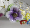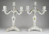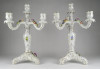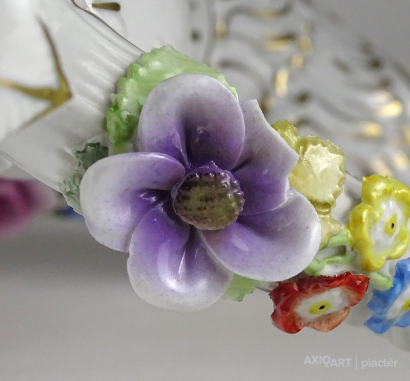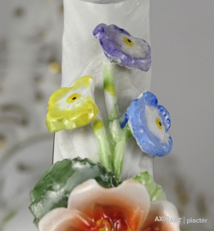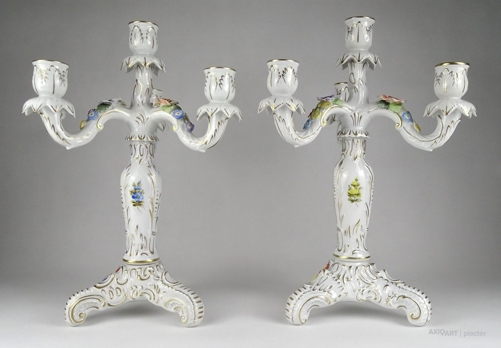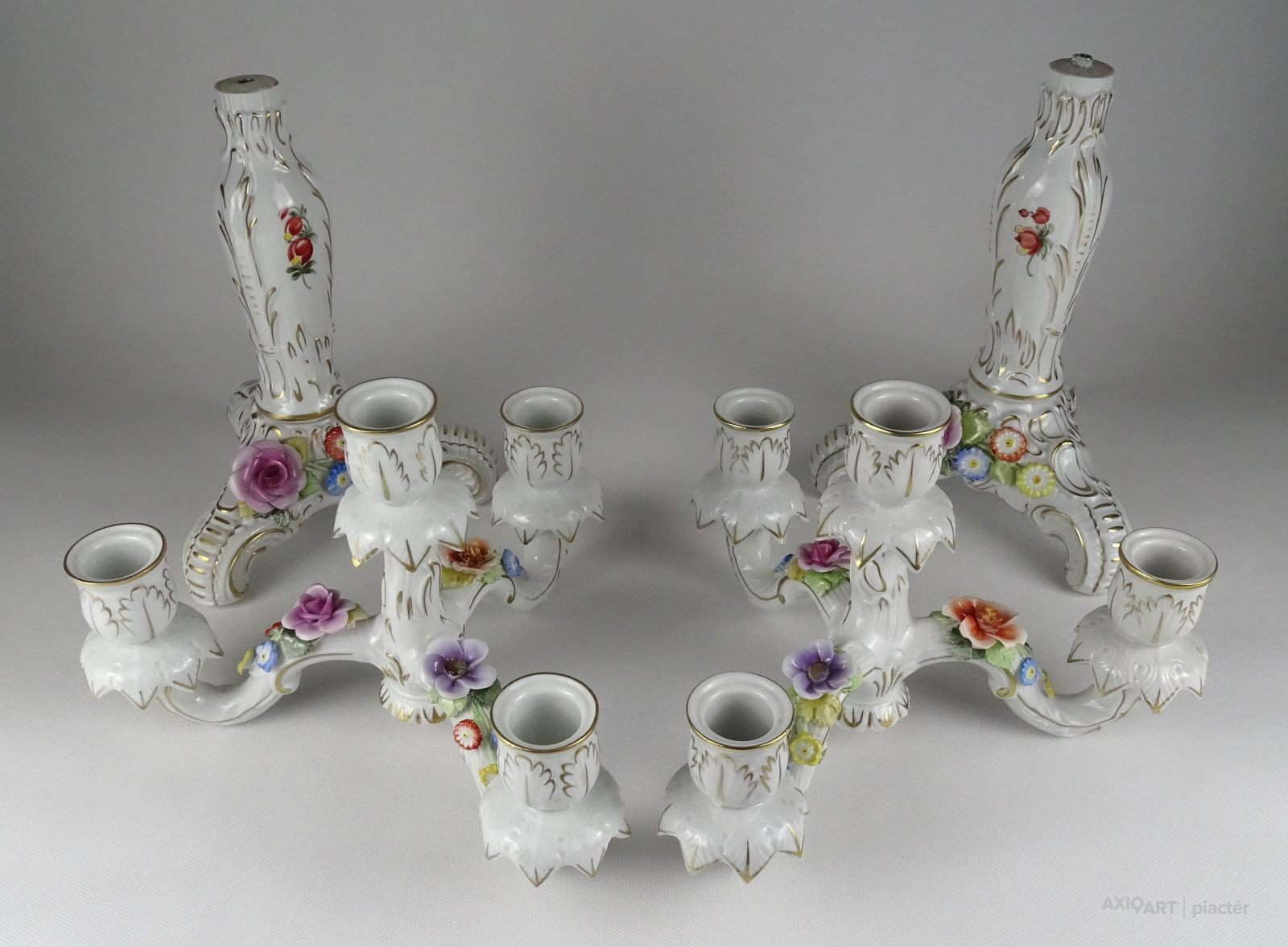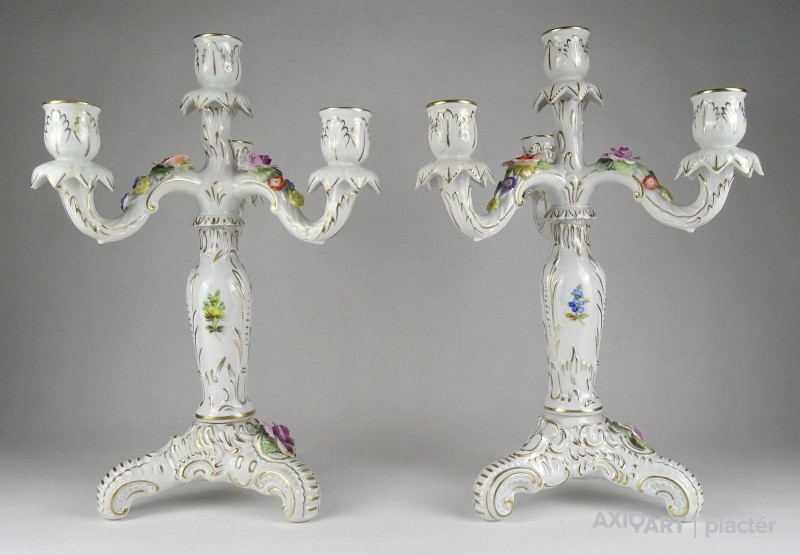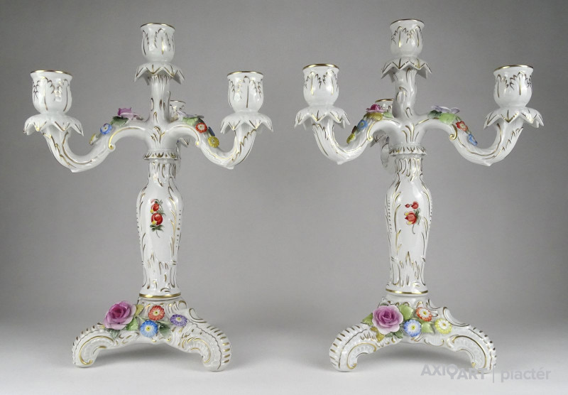 Szép állapotú, régi, aranyozott, barokkos porcelán gyertyatartó pár. Mindkettő háromágú, négygyertyás levehető felső résszel rendelkezik. A gyertyatartók plasztikus virágokkal díszítettek. Ezek közül egy-egy darabon apró sérülés található.