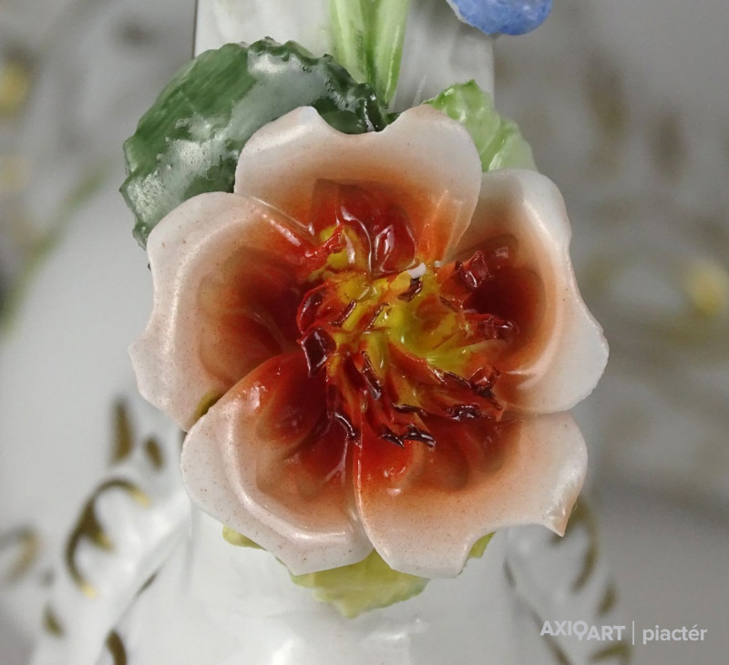 [1Q809/Z258] Szép állapotú, régi, aranyozott, barokkos porcelán gyertyatartó pár. Mindkettő háromágú, négygyertyás levehető felső résszel rendelkezik. A gyertyatartók plasztikus virágokkal díszítettek. Ezek közül egy-egy darabon apró sérülés található. Aljukon kék koronás márkajelzés: PMP 1817 HANDPAINTED (PORZELLAN MANUFAKTUR PLAUE PMP THÜRINGIA) Magasság: 37 cm Szélesség: 25 cm Súly: 2.175 kg