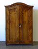 [1R269/KCS] Antik, ívelt fronttal rendelkező kétajtós akasztós szekrény, neobarokk ruhásszekrény. Hátoldala eredeti osztott, csapolt deszkás hátlap. Bal hátsó lába kijár és a bal oldalfali elem vertikális irányban egy rövidebb és egy hosszabb szakaszon repedt. Működő zárral, egy darab kulccsal rendelkezik. Hátoldalán korabeli "háztól-házig" szállítmányozási címke található, lásd fotó. Magasság: 187 cm Szélesség: 124 cm