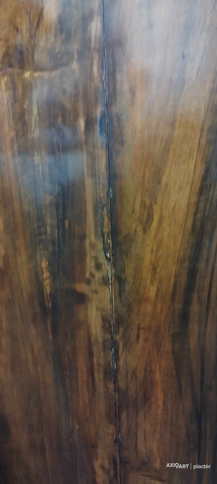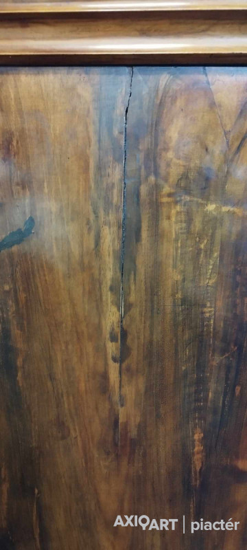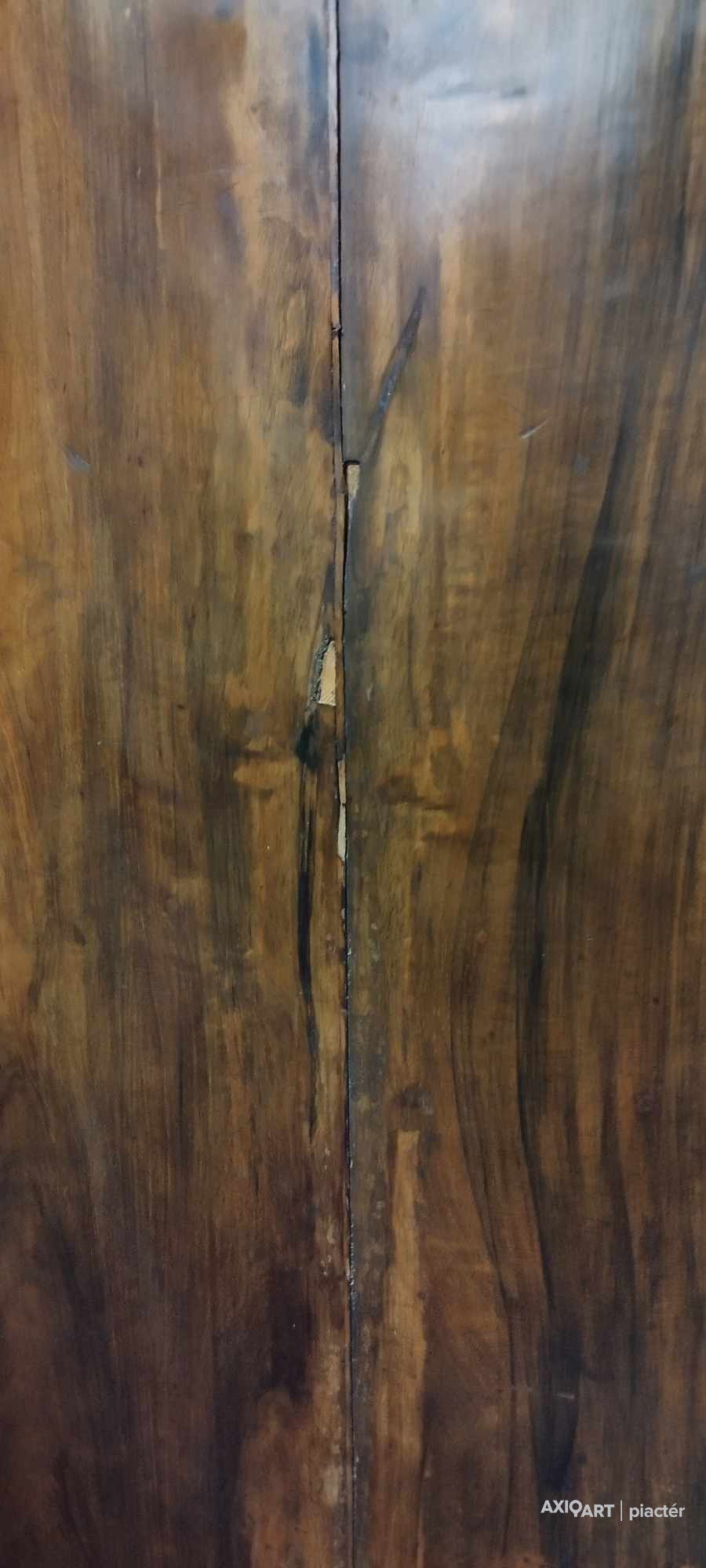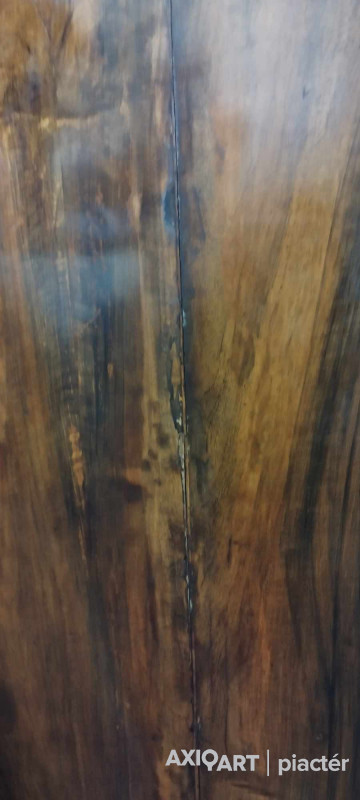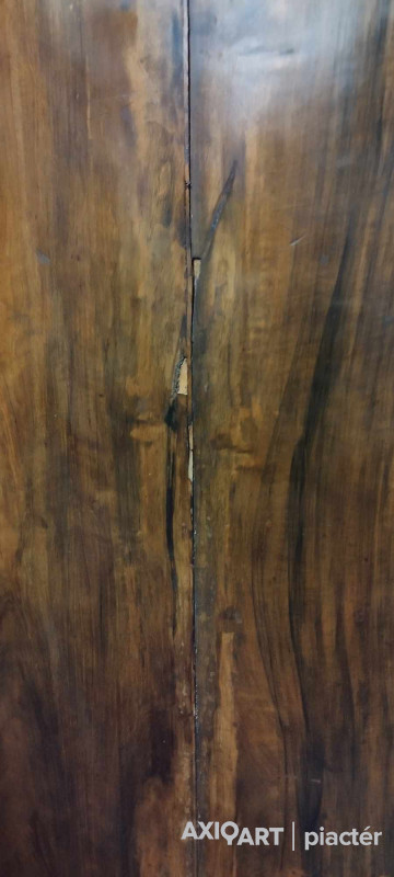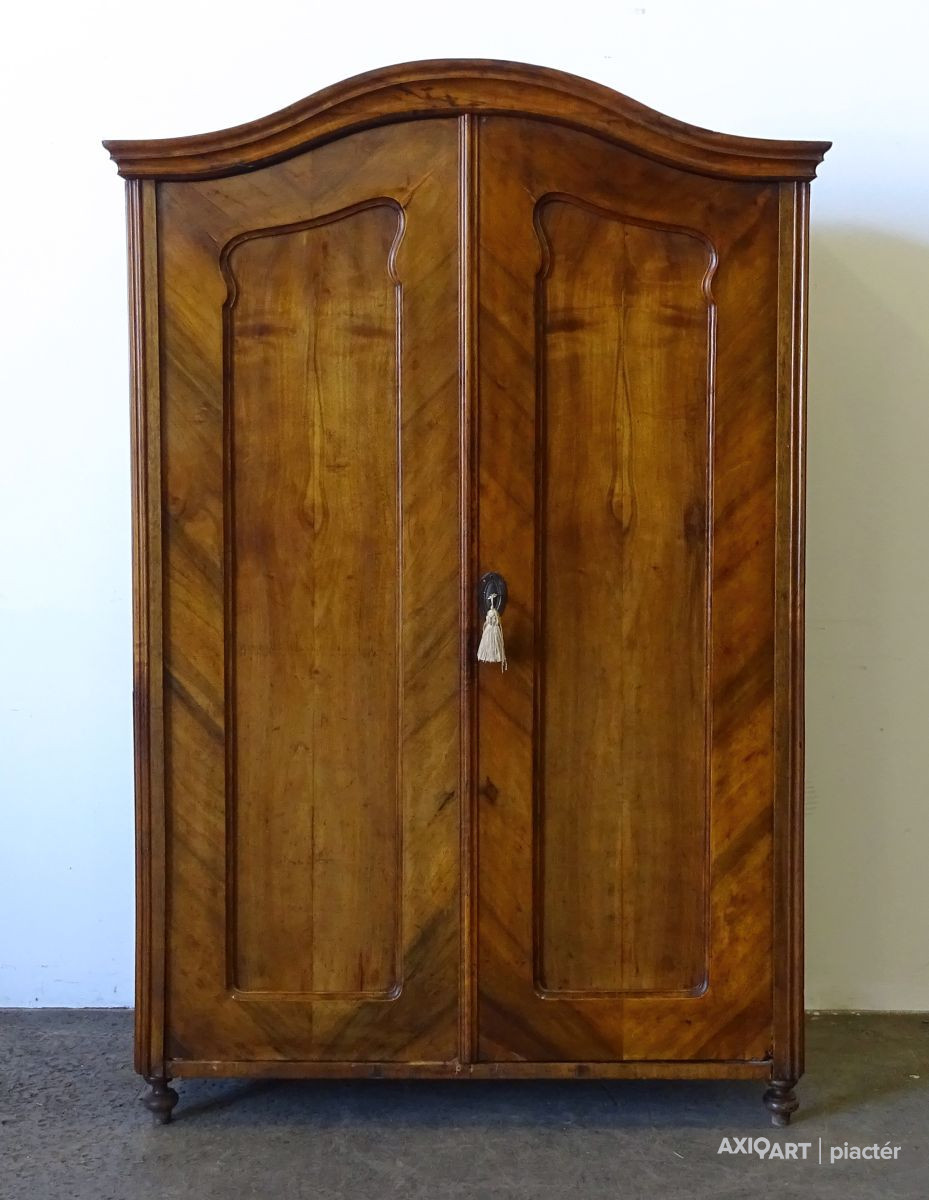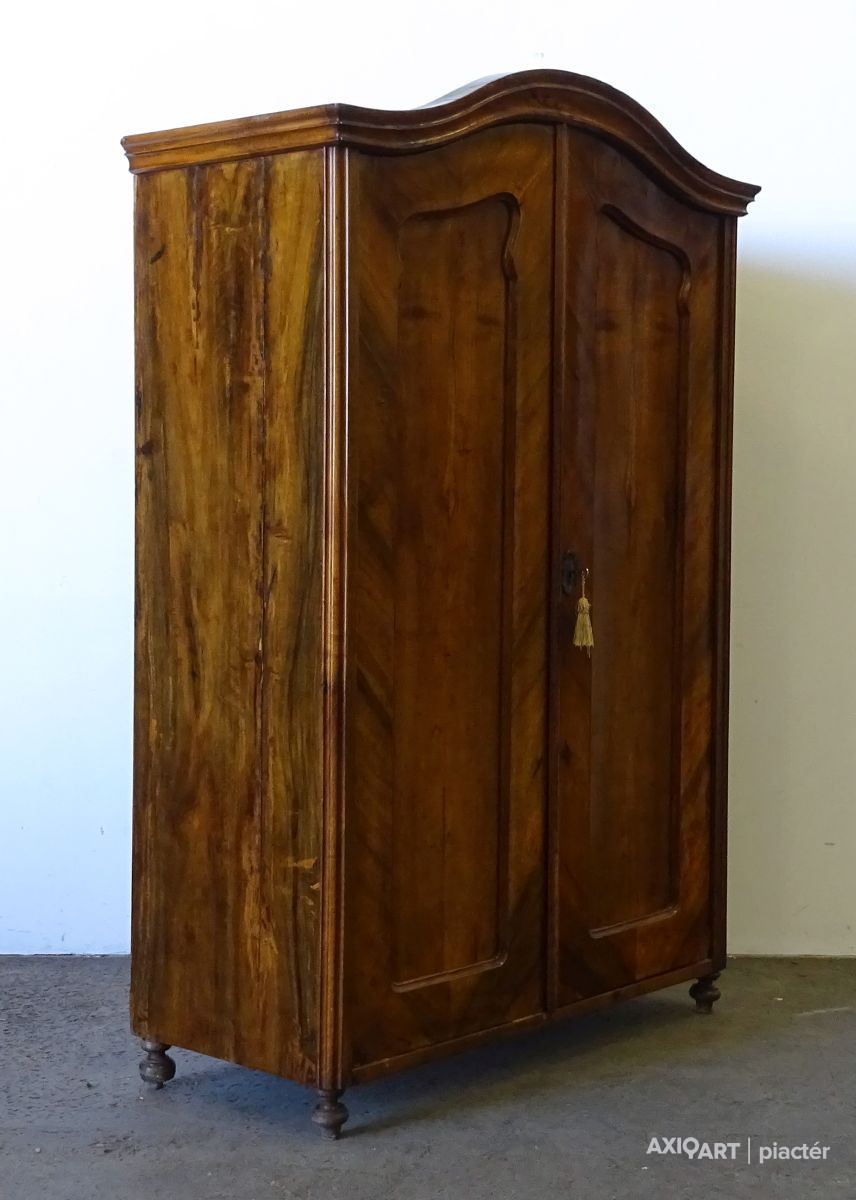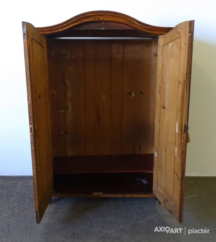 Antik, ívelt fronttal rendelkező kétajtós akasztós szekrény, neobarokk ruhásszekrény. Hátoldala eredeti osztott, csapolt deszkás hátlap. Bal hátsó lába kijár és a bal oldalfali elem vertikális irányban egy rövidebb és egy hosszabb szakaszon repedt.