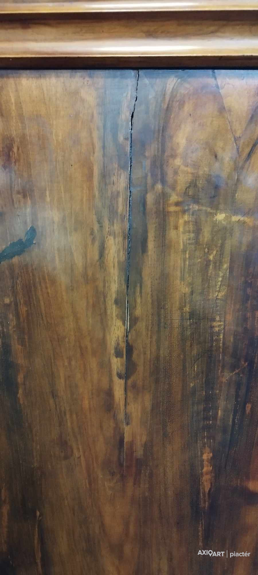 [1Y029/Z018] Olaj farost festmény, üveglap mögött, hibátlan képcsarnokos keretben. Hátoldalán Képcsarnok Vállalat papír címkéje: A művész neve: SCHÉNER MIHÁLY A kép címe: TÁJ Magasság: 66.5 cm Szélesség: 86 cm Súly: 6.54 kg Schéner Mihály festő, grafikus, szobrász, keramikus, bábtervező Medgyesegyháza, 1923-01-9 Elhalálozott: Budapest, 2009. május 11. Honlap: http://www.kormendigaleria.hu/kiadvany.html 1942-1947: Magyar Képzőművészeti Főiskola, tanára: Rudnay Gyula. 1978: Munkácsy-díj; 1984: érdemes művész; 1989: kiváló művész; 1995: Kossuth-díj. 1992-től a Magyar Művészeti Akadémia, 1993-tól a Széchenyi Irodalmi és Művészeti Akadémia tagja. 1956-ig tanított. 1982: Nagyatádi Faszobrász Alkotótelep, 1985: Nemzetközi Acélszobrász Alkotótelep, Dunaújváros. A stílusában felismerhető, mégis sokféle műtárgyat létrehozó ~ gazdag, állandóan alakuló életműve a folyton változó világban helyét kereső, az alkotói szabadságot megvalósító XX. századi képzőművész példázata lehetne. Magát expresszív-szürrealista alkotónak nevezi. Egyaránt dolgozik festékkel, textillel, fával, fémmel. Rajzol, szerkeszt, farag, épít, gyúr, varr és ragaszt, felhasználja a mézesbábok öntőformáit. Festő, rajzoló, textilszobor- és bábkészítő, fazekas, asztalos, esztergályos. Háromlépcsős folyamatban gondolkozik: rajzban tervez, majd fest, szobrot készít, “formába önt”, mindig a végső plasztikai megoldást keresi. Ami állandó és mégis játékosan változékony megjelenésű Schéner művészetében, az a gyermekkori emlékek által meghatározott népi mesterségek iránti tiszteletet kifejező motívumkincs, a tárgyi folklór formakészlete, amely már-már kézjegyként ismétlődik munkáin. Mitologikussá nőtt képzelete új lényeket teremt, pl: a Pigulát, amely disznótestű, emberfejű teremtmény. Schéner festményein a szürrealista motívumokat konstruktív szerkezetbe rendezi, a geometriát és az organikus természeti motívumokat egyaránt beépíti műveibe. A népi, népművészeti formakincsből merített lovas huszárok, betyárok, szegénylegények cifra szűr mentéje, piros csákója, fekete csizmája, az önálló életet élő zsinórdíszek és mézeskalács bábok, a kiskocsik a gyermekkori vásárok, búcsúk színes forgatagába vezet. A primér motívumokat aztán felváltják a vastagon felhordott felületbe karcolt jelek, vonalhálózatok, amelyek a játszó gyermek homokba rajzolt ábráit, a pásztorember fába vésett üzeneteit, az ősember barlang falába rótt mágikus jeleneteit idézik meg. A művész pillanatnyi érdeklődésének megfelelően a színek búvópatakként tűnnek el és jelennek meg ismét. A 60-as években leginkább a formákkal való játék érdekelte, a festmények felülete egyre gazdagodott: a táblaképek felületén applikációk jelentek meg, vagy lemállasztott rétegek hagyták maguk után hiányukat, motívumok nélküli ősformák, archetipikus képzetek bukkantak fel művészetében. A véletlenszerűnek látszó rétegekkel való játék azonban tudatos komponálás eredménye, amely később nyilvánvaló ritmusnak és formai szerkesztettségnek adja át a helyét, mint a Törvénytáblák c. sorozaton. A különböző művészi kifejezési formák egymásra termékenyítő hatással vannak, át- meg áthatják egymást. Textilszobrai, amelyekkel új műfajt teremtett, ugyanazzal az automatikus, expresszív-szürrealista módszerrel készülnek, mint festményei. A hagyományosan a népművészetben alkalmazott anyag, a filc lehetőséget ad a népi formakincs felelevenítésére, amely azonban a művész különös szürrealista átiratában jelenik meg. A szívekkel kivarrt, zsinórdíszes Posztókotlós c. művén mézesbábok lógnak, hátán huszárok lovagolnak. Egész sor textilből készült kéz-plasztikát alkot, amelyeket az ujjakra rávarrt díszekkel öltöztet, személyesít meg. A színes-különös világból aztán ~ újra puritán képi és formai rendbe juttatja el a nézőt, majd nemsokára tépett, gyűrt, vágott, csorgatott, repedezni hagyott szenvedélyesen vonagló képi felületeket hagy hátra. Schéner készített apró gyermekjátékokat, térstruktúra-tereket, mászókákat is. A magyar népi formák mellett szürreális játékaiban gyakran alkalmaz görög mitológiai alakokat, “elkentaurosodott” lovakat, Gorgó-fejeket, sellőket, hárpiákat, Pán-ábrázolásokat. Schéner nemcsak saját művészetéről publikál, hanem művésztársairól is számos írása jelenik meg, elsősorban az Új Auróra c. folyóiratban, amelynek egy ideig főmunkatársa volt. Irodalom kiállítása, Magyar Építőművészet, 1962/4. Húsz év után, Művészet, 1965/4. BOZÓKY M.: ~, Tiszatáj, 1968/5. PERNECZKY G.: Nincs uborkaszezon, Élet és Irodalom, 1969. augusztus 8. BARÁNSZKY-JÓB L.: ~, Művészet, 1969/9. LÁSZLÓ GY.: ~ kaposvári kiállítása, Jelenkor, 1969/4. MAJOR M.: Pásztorok, betyárok, huszárok - kezek, Tükör, 1970. szeptember 15. FRANK J.: Bemutatjuk ~t, Élet és Irodalom, 1972. május 6. ról kiállítása ürügyén, Képzőművészeti Almanach, Budapest, 1972 Sötétkék kokasok, Élet és Irodalom, 1973. szeptember 9. MAJOR M.: ~ játékai, Élet és Irodalom, 1974. július 27. BARTA J.: Egy különös művész, Alföld, 1974/6. VADAS J.: Szárnykészítők, Élet és Irodalom, 1975. október 4. JUHÁSZ F.: A halál ellen játszani, Élet és Irodalom, 1975. május 17. PAP G.: Kincsek és műkincsek, Művészet, 1975/6. P. SZŰCS J.: Az utak kettéválnak, Művészet, 1978/3. Békési művészet, Művészet, 1978/7. SZAMOSI F.: ~ [kismonográfia], Budapest, 1978 VADAS J.: Játék a játékkal, Élet és Irodalom, 1979. augusztus 18. NÉMETH L.: ~ műveiről, Művészet, 1979/4. MIKLÓS P.: Mit akar ez a múzeum?, Művésze